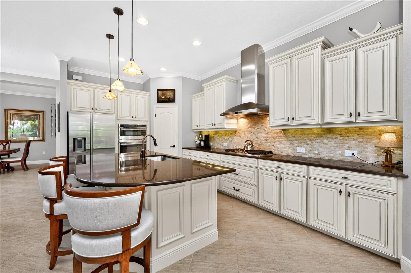 Set within the sought-after Boca Royale Golf & Country Club, this exceptional Palm Island model by Neal Communities offers a rare blend of luxury, privacy, and thoughtful upgrades. Just minutes from the Gulf beaches and surrounded by lush tropical landscaping, the home enjoys tranquil water views and an elevated level of craftsmanship throughout. Designed with a split-bedroom layout, this three-bedroom, three-bath residence provides both comfort and privacy, with the spacious primary suite set apart from the guest bedrooms. The main living area impresses with a custom feature wall, coffered ceilings, crown molding, and recessed lighting, while pocketing sliding glass doors seamlessly connect the great room to the lanai and pool, creating an ideal indoor-outdoor living experience perfect for entertaining. The gourmet kitchen is beautifully appointed with soft-close cabinetry, GE Profile stainless steel appliances, quartz countertops, a walk-in pantry, and layered lighting including pendant and under-cabinet accents. A large center island offers seating for four, complemented by a casual breakfast nook and a separate formal dining area for more elegant gatherings. The primary suite is a private retreat, featuring coffered ceilings, dual walk-in closets, and direct access to the lanai. The luxurious ensuite bath includes dual vanities, a soaking tub, a walk-in shower, and a linen closet. Guest bedrooms share a well-appointed full bath, while the light-filled office, complete with double windows and a sliding door to the lanai, provides a peaceful workspace. Upstairs, a generous 555 sq foot bonus room offers incredible flexibility, ideal as a guest suite, game room, or fitness space. From this upper level, enjoy beautiful views, including the opportunity to watch holiday fireworks or even rocket launches.Outdoor living is equally impressive, featuring a fully screened lanai with a brand-new rescreened ceiling, a private pool with an electric heater and chiller, an outdoor shower, and a built-in grilling area complete with an outdoor refrigerator. Remote-controlled storm shutters and full lanai privacy enhance both comfort and convenience. This home is extensively upgraded with features that add both luxury and peace of mind, including a whole-house 22kW generator with surge protection, full storm shutter protection, plantation shutters throughout, and a Rinnai tankless water heater. The property also includes four-zone irrigation and fertigation systems, including dedicated irrigation for lanai plants, as well as extensive landscape lighting. The lush landscaping has been thoughtfully designed to conceal mechanical elements, and there is full paver access to these systems. The oversized three-car garage is equally impressive, featuring an 8-foot door, polyaspartic flooring, full wall cabinetry, a storage closet, an exhaust fan, dual keypad entry, pull-down attic access, and both interior and exterior water spigots. An under-stair butler's kitchen adds a unique and functional touch to the home. The laundry room is spacious and includes additional storage. Residents of Boca Royale enjoy an active, resort-style lifestyle with access to a community pool, golf, tennis, pickleball, and a vibrant clubhouse offering dining and social events. Impeccably maintained and truly move-in ready, this home offers the perfect opportunity to embrace the Florida lifestyle-- start enjoying everything this exceptional property and community have to offer.