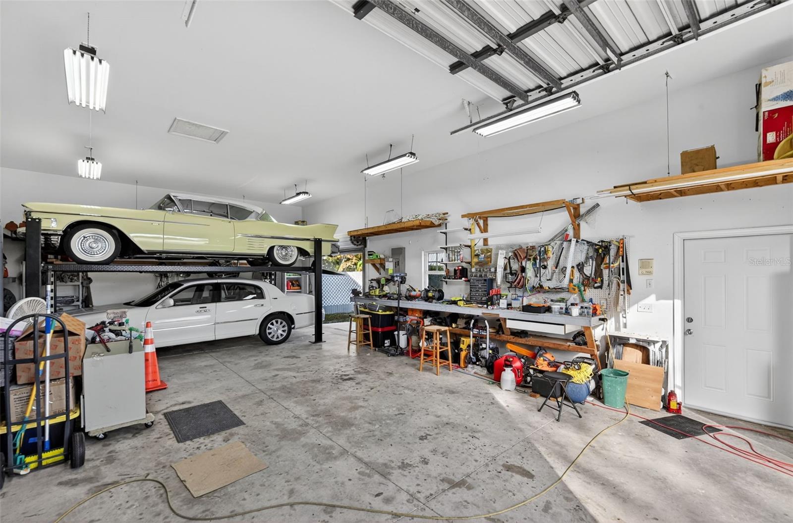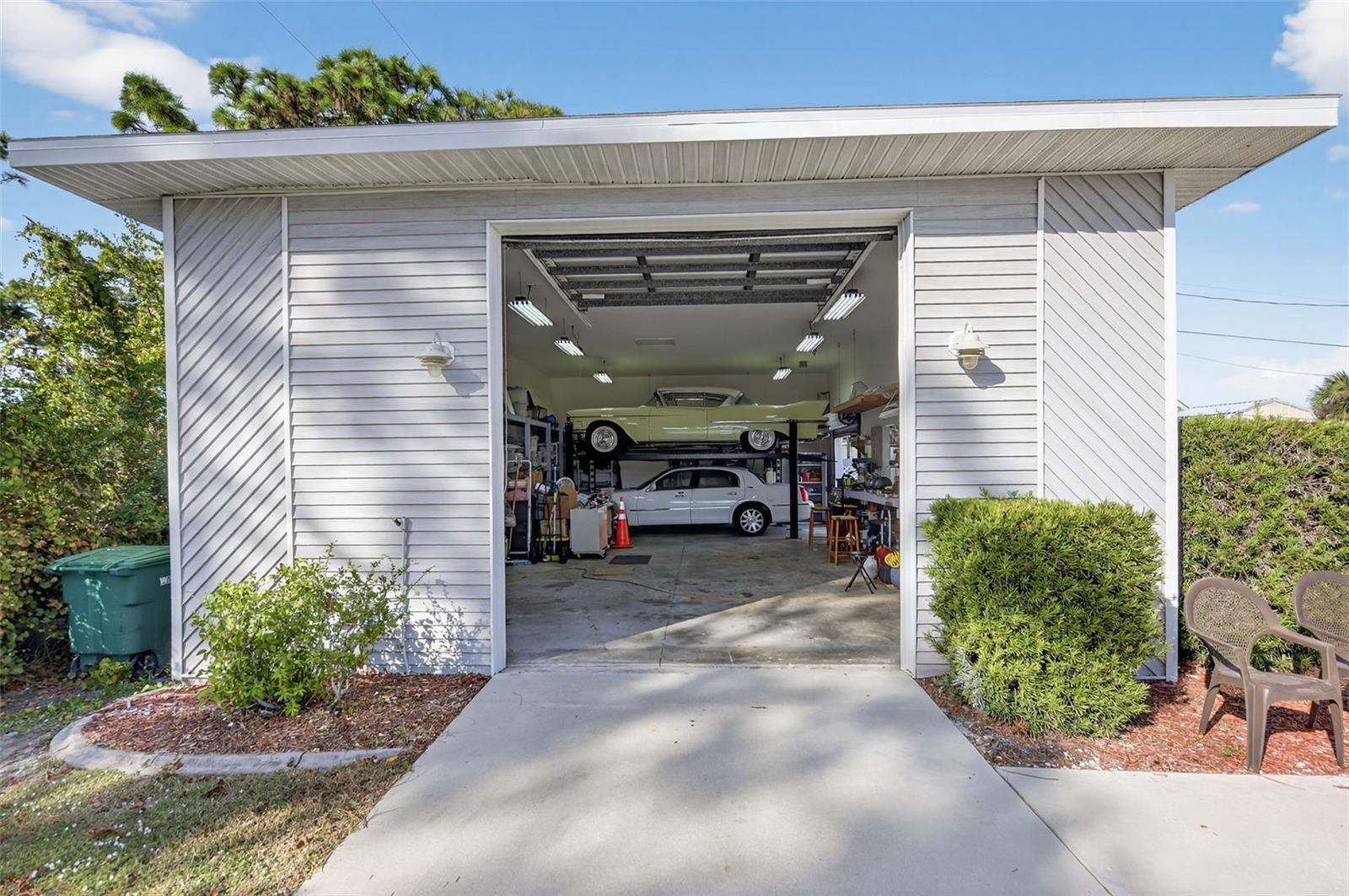 Price reduced by $52k. Collector's paradise on nearly one acre in beautiful Englewood, Florida - just minutes to shopping and the Gulf beaches and not in a flood zone. This custom-built home offers a rare combination of privacy, space, and unmatched garage/workshop amenities.Situated on what was originally two lots, the fully fenced and gated property features lush, park-like landscaping, mature shade trees, and a separate gated entrance to the east side - ideal for RV, boat, or business access. City water and sewer plus a private well and irrigation system provide efficiency and convenience.The main residence offers a desirable split floor plan with 3 bedrooms, 2 baths, plus a large office, and generous living and family rooms. Highlights include large bedrooms with walk-in closets, a wood-burning fireplace, central vacuum, security system, fire suppression sprinkler system, surround sound wiring in the family room, ceiling fans throughout, and a jacuzzi tub in the primary bath. The kitchen and home have seen numerous updates, including a new roof and skylights (2022), new water heater (2023), new stove (2023), and new pool cage with child safety screen (2023). Enjoy the large, fully screened pool area for year-round Florida living.Car enthusiasts, hobbyists, and RV owners will appreciate the exceptional garage setup: Oversized attached, air-conditioned 2-car garage with 8-foot entry door RV garage (25x40) with wide/tall RV door, 8-ft side door, 7,000 lb 4-post lift, LED lighting, and new roof (2023) Second detached garage (30x35) with three large entry doors, walk-in door, LED lighting, 240V power, and a large commercial air compressorComfortably store up to 12 vehicles, an RV, boat, or all your toys - with room to spare.A truly rare offering combining land, privacy, a move-in-ready home, and high-end utility features--perfect for collectors, entrepreneurs, or anyone seeking space and flexibility in a prime Englewood location.