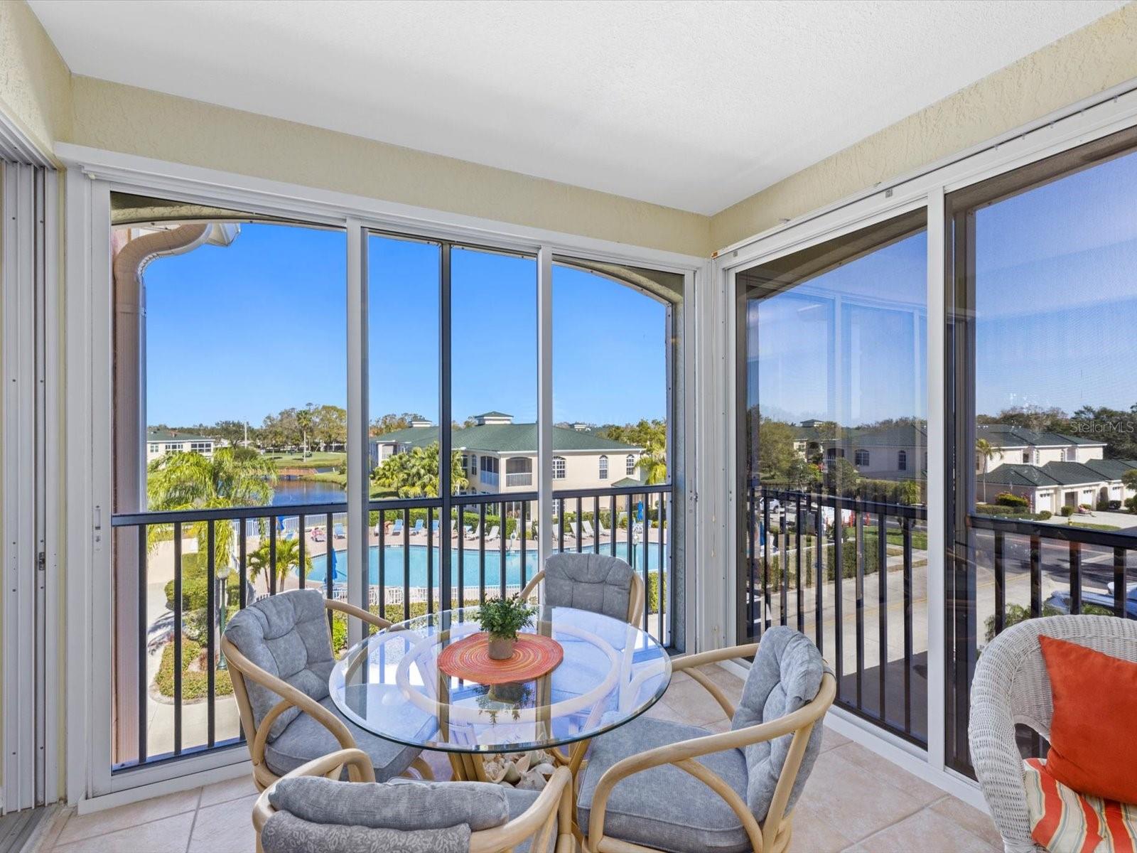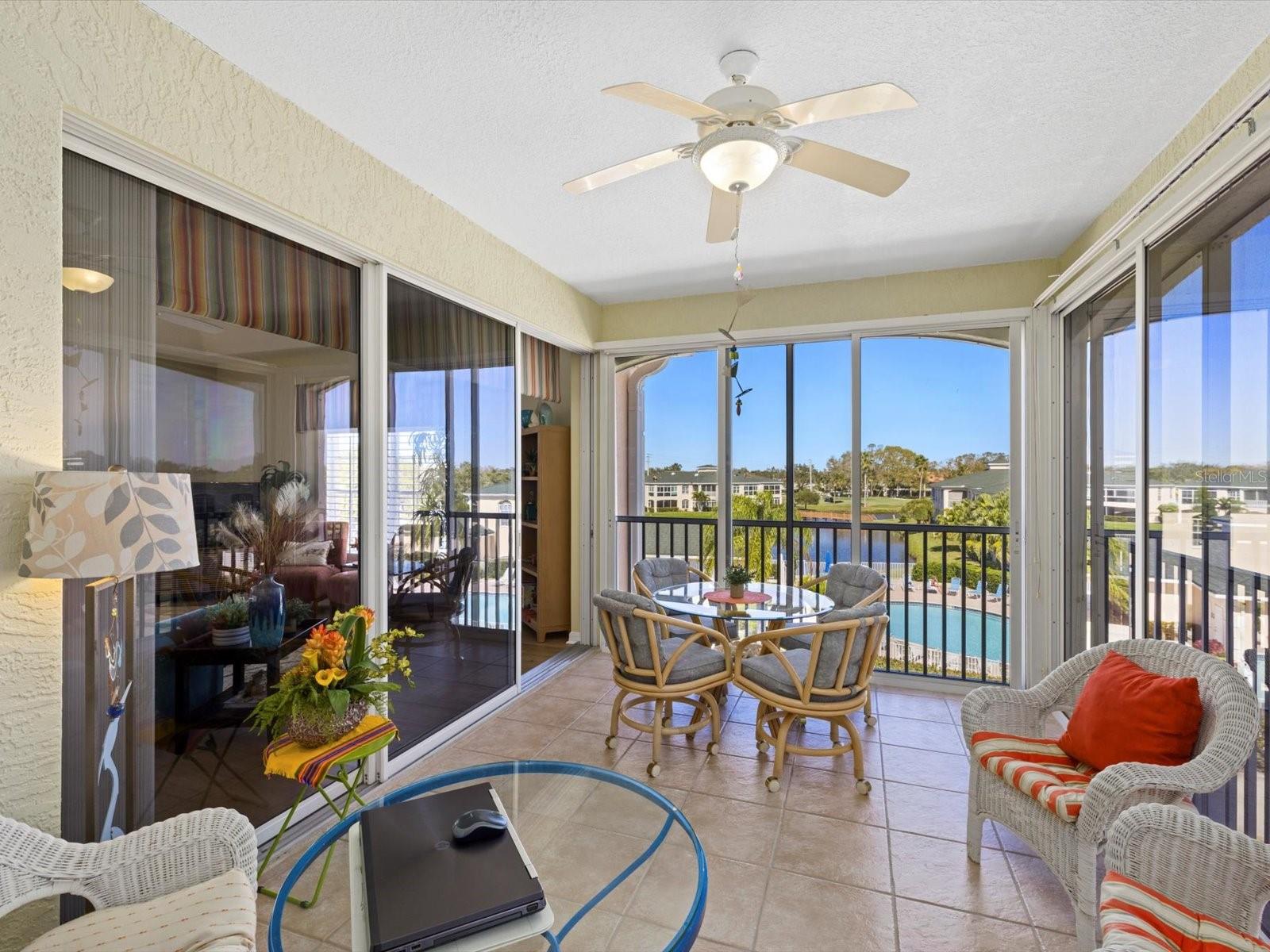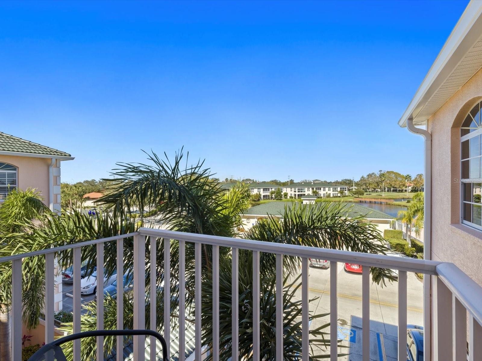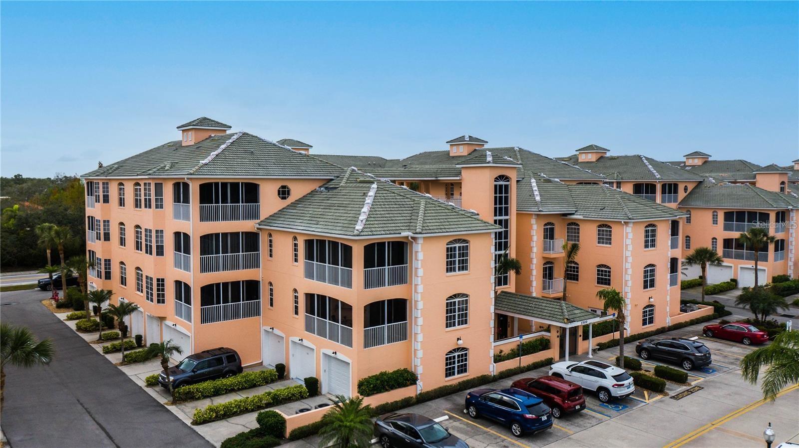 NEWLY PRICED!! BREATHTAKING VIEWS FROM TOP FLOOR OF THIS PRISTINE LUXURY TURNKEY CONDOMINIUM IN THE COURTYARDS AT GONDOLA PARK! Absolute gem with the most desirable location in this community! With a stunning view of the lake, pool, golf course, clubhouse, and greenery out three sides of this unit, you'll enjoy a bright, sunny ambiance while you bask in a feeling of vacation...year round! Enjoy and feel secure with a gated entry at each building, elevator or stairs to this unit, spectacular atrium in the interior open air courtyard! This property has been lovingly maintained, beautifully decorated with the finest furniture and accessories. Primary bedroom suite offers ample closet space, beautiful bathroom with soaking tub, separate shower, quartz countertops, and lovely tile; and a private escape to the spacious Florida room overlooking tranquility. Guest bedroom offers Juliet Balcony overlooking beautiful views, a walk-in closet, and private entry to common bathroom with quartz countertops, full tub/shower, and natural light. Living room and Kitchen offer bright, open and spacious feel with vibrant colors and light! Pretty kitchen with quartz countertops, newer stainless steel appliances, and pantry closet. One year new luxury vinyl plank flooring and tile throughout for low maintenance living! Two year new central a/c & heat pump, recent roof replacement throughout the Courtyards. This unit also has a deeded one car garage with private driveway for an additional car! Guest parking available adjacent to the building. Pickleball is a popular pastime here at the Courtyards, and can be pretty competitive. On site gym, craft room, clubhouse, in-ground pool, lake, and community activities will keep you active and meeting wonderful friends. Your association dues include cable (& internet beginning in July), water, sewer, tennis, pickleball, 2 gyms, craft room, club house, pool, all outdoor maintenance to grounds and buildings.
