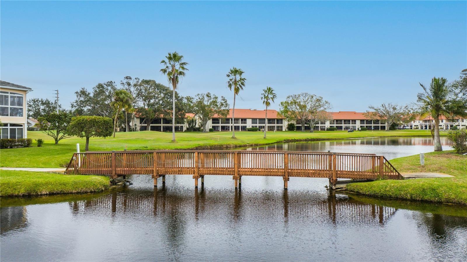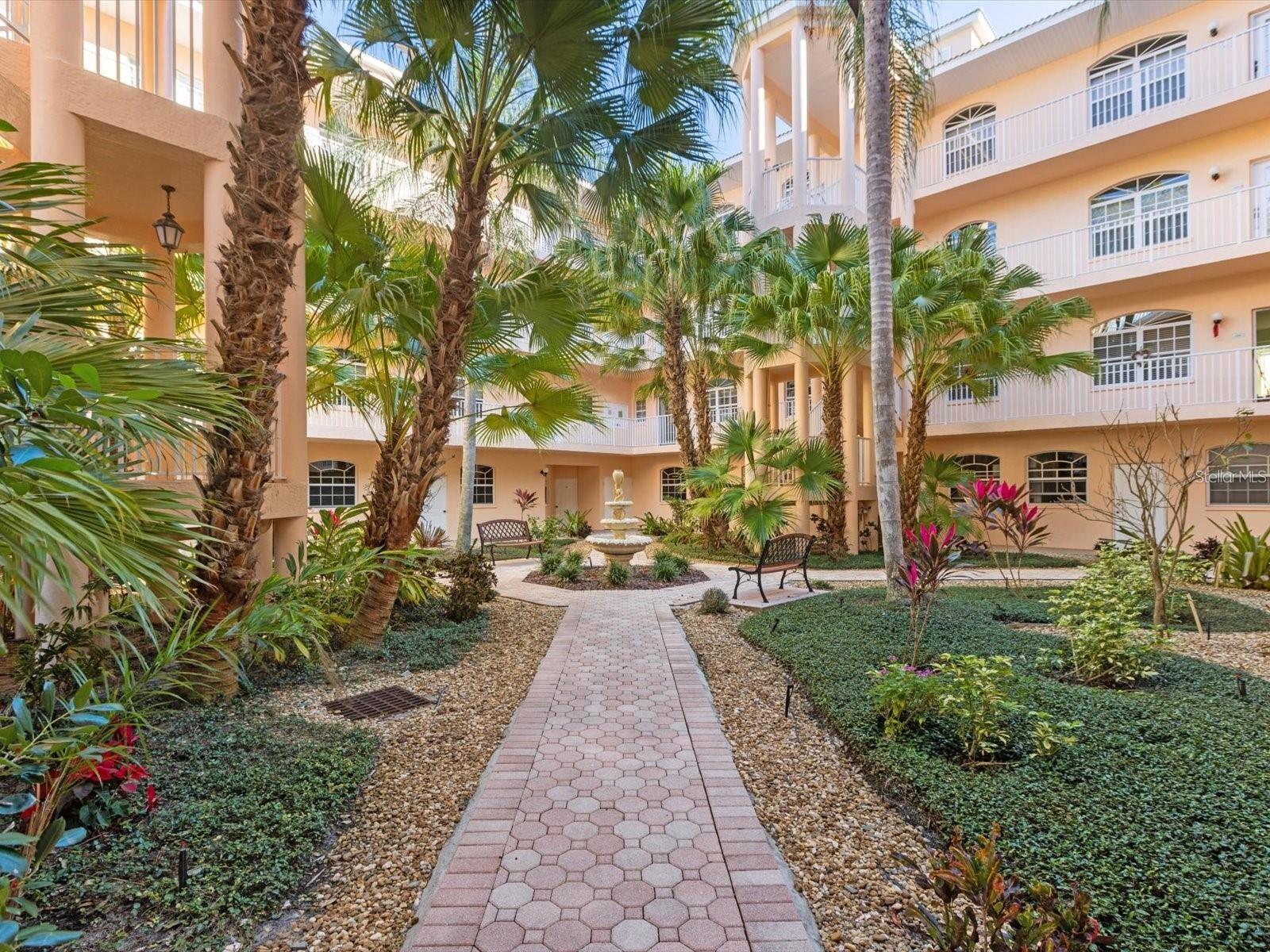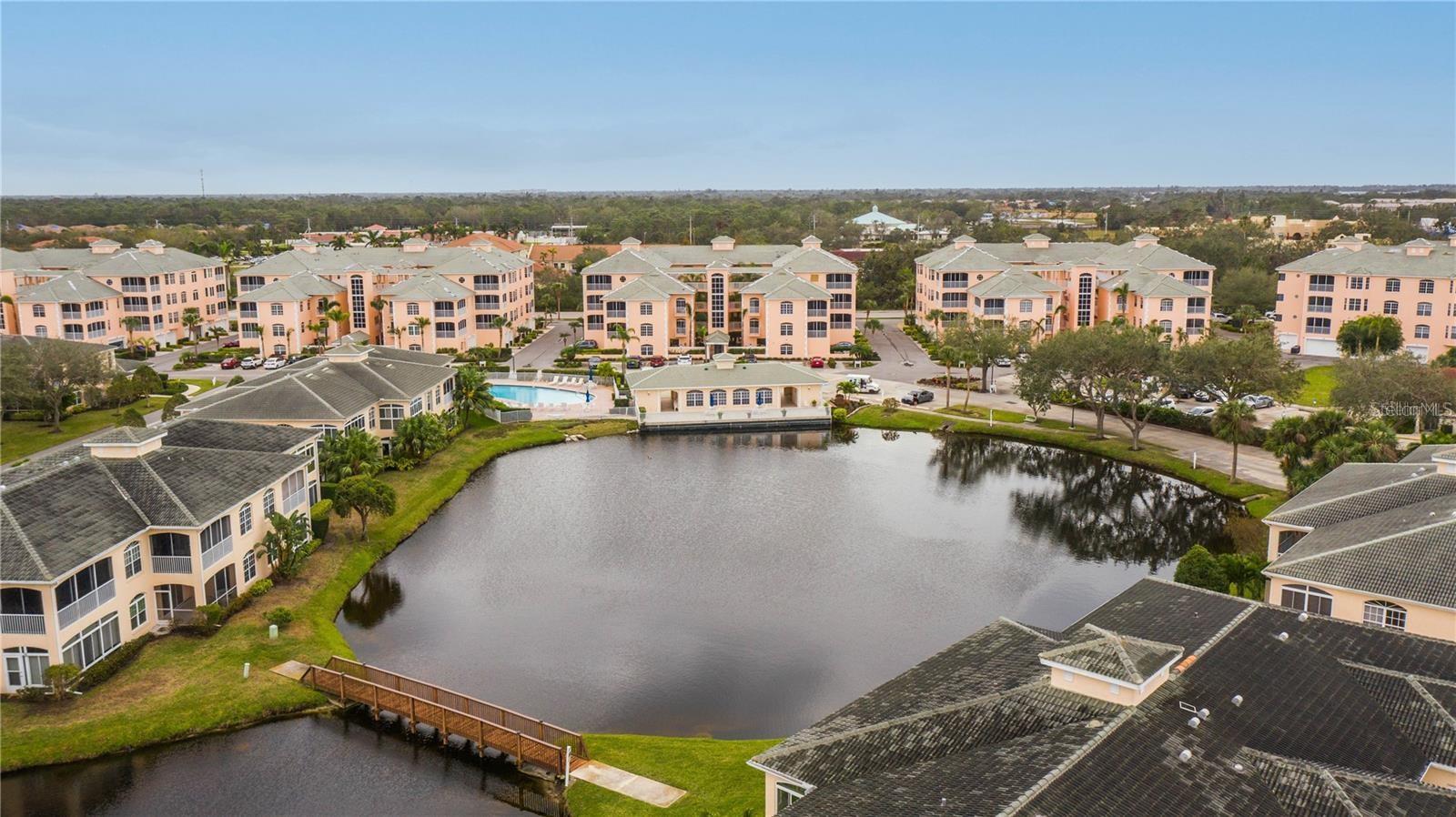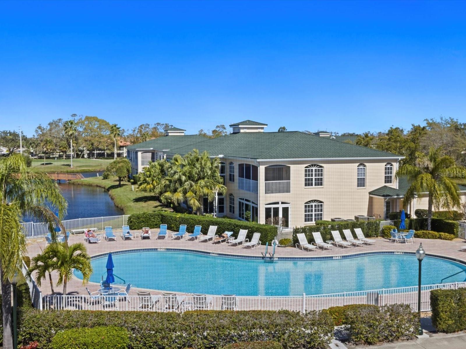 NEWLY PRICED!! BREATHTAKING VIEWS FROM TOP FLOOR OF THIS PRISTINE LUXURY TURNKEY CONDOMINIUM IN THE COURTYARDS AT GONDOLA PARK! Absolute gem with the most desirable location in this community! With a stunning view of the lake, pool, golf course, clubhouse, and greenery out three sides of this unit, you'll enjoy a bright, sunny ambiance while you bask in a feeling of vacation...year round! Enjoy and feel secure with a gated entry at each building, elevator or stairs to this unit, spectacular atrium in the interior open air courtyard! This property has been lovingly maintained, beautifully decorated with the finest furniture and accessories. Primary bedroom suite offers ample closet space, beautiful bathroom with soaking tub, separate shower, quartz countertops, and lovely tile; and a private escape to the spacious Florida room overlooking tranquility. Guest bedroom offers Juliet Balcony overlooking beautiful views, a walk-in closet, and private entry to common bathroom with quartz countertops, full tub/shower, and natural light. Living room and Kitchen offer bright, open and spacious feel with vibrant colors and light! Pretty kitchen with quartz countertops, newer stainless steel appliances, and pantry closet. One year new luxury vinyl plank flooring and tile throughout for low maintenance living! Two year new central a/c & heat pump, recent roof replacement throughout the Courtyards. This unit also has a deeded one car garage with private driveway for an additional car! Guest parking available adjacent to the building. Pickleball is a popular pastime here at the Courtyards, and can be pretty competitive. On site gym, craft room, clubhouse, in-ground pool, lake, and community activities will keep you active and meeting wonderful friends. Your association dues include cable (& internet beginning in July), water, sewer, tennis, pickleball, 2 gyms, craft room, club house, pool, all outdoor maintenance to grounds and buildings.