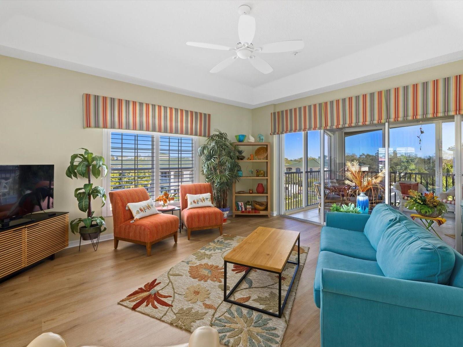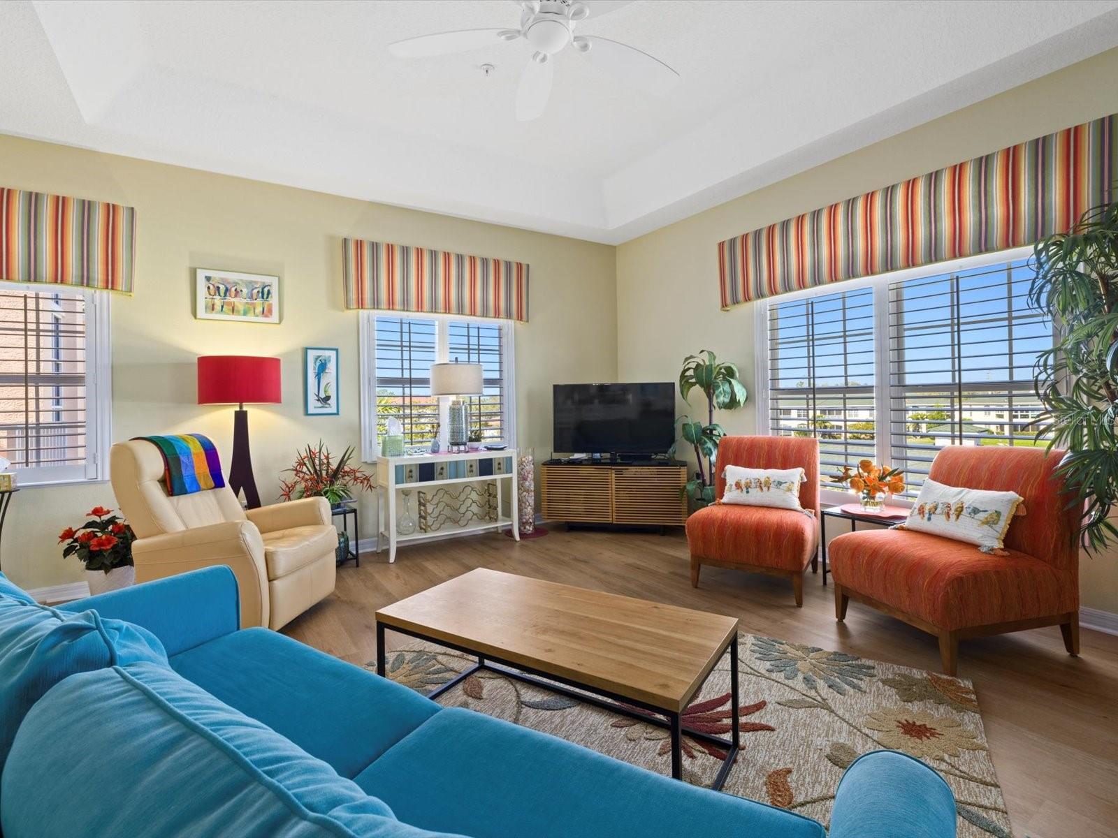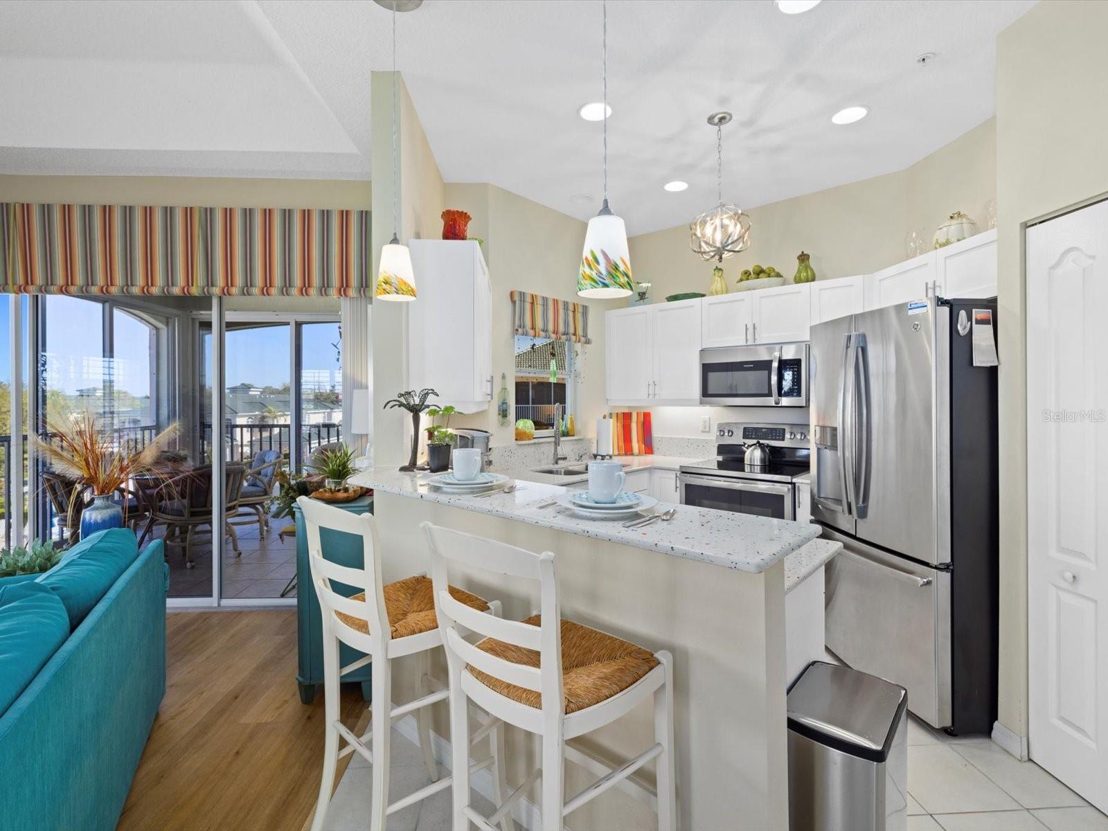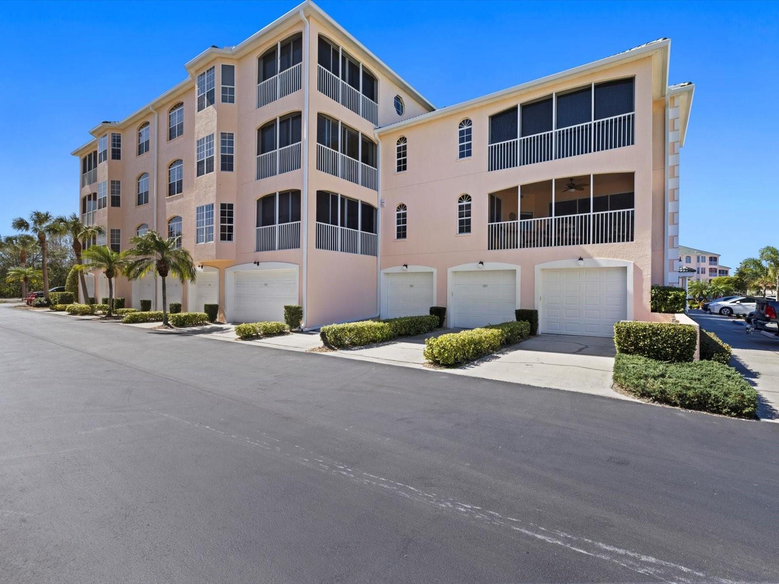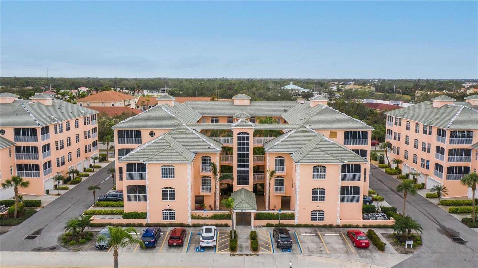 NEWLY PRICED!! BREATHTAKING VIEWS FROM TOP FLOOR OF THIS PRISTINE LUXURY TURNKEY CONDOMINIUM IN THE COURTYARDS AT GONDOLA PARK! Absolute gem with the most desirable location in this community! With a stunning view of the lake, pool, golf course, clubhouse, and greenery out three sides of this unit, you'll enjoy a bright, sunny ambiance while you bask in a feeling of vacation...year round! Enjoy and feel secure with a gated entry at each building, elevator or stairs to this unit, spectacular atrium in the interior open air courtyard! This property has been lovingly maintained, beautifully decorated with the finest furniture and accessories. Primary bedroom suite offers ample closet space, beautiful bathroom with soaking tub, separate shower, quartz countertops, and lovely tile; and a private escape to the spacious Florida room overlooking tranquility. Guest bedroom offers Juliet Balcony overlooking beautiful views, a walk-in closet, and private entry to common bathroom with quartz countertops, full tub/shower, and natural light. Living room and Kitchen offer bright, open and spacious feel with vibrant colors and light! Pretty kitchen with quartz countertops, newer stainless steel appliances, and pantry closet. One year new luxury vinyl plank flooring and tile throughout for low maintenance living! Two year new central a/c & heat pump, recent roof replacement throughout the Courtyards. This unit also has a deeded one car garage with private driveway for an additional car! Guest parking available adjacent to the building. Pickleball is a popular pastime here at the Courtyards, and can be pretty competitive. On site gym, craft room, clubhouse, in-ground pool, lake, and community activities will keep you active and meeting wonderful friends. Your association dues include cable (& internet beginning in July), water, sewer, tennis, pickleball, 2 gyms, craft room, club house, pool, all outdoor maintenance to grounds and buildings.