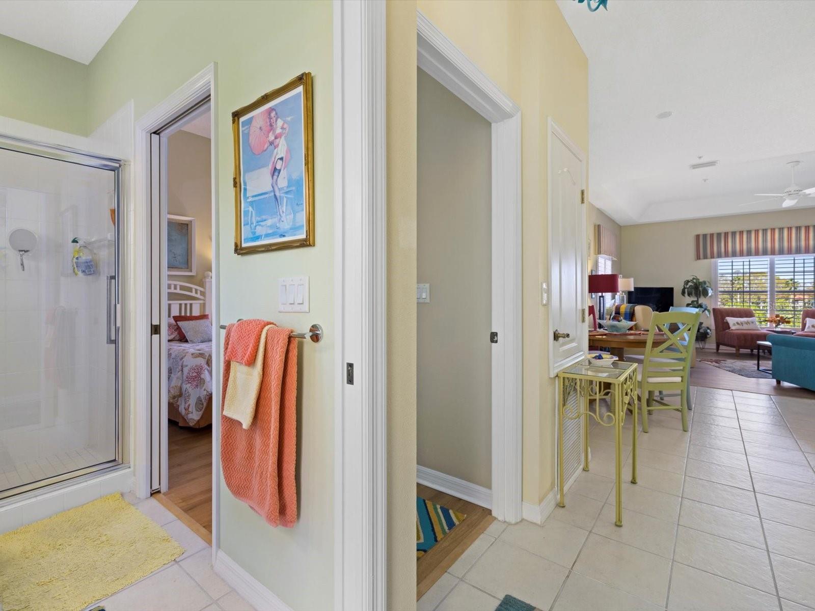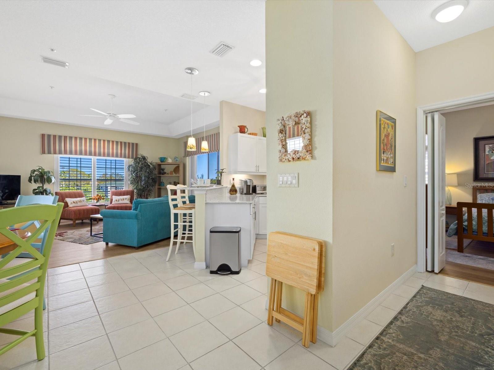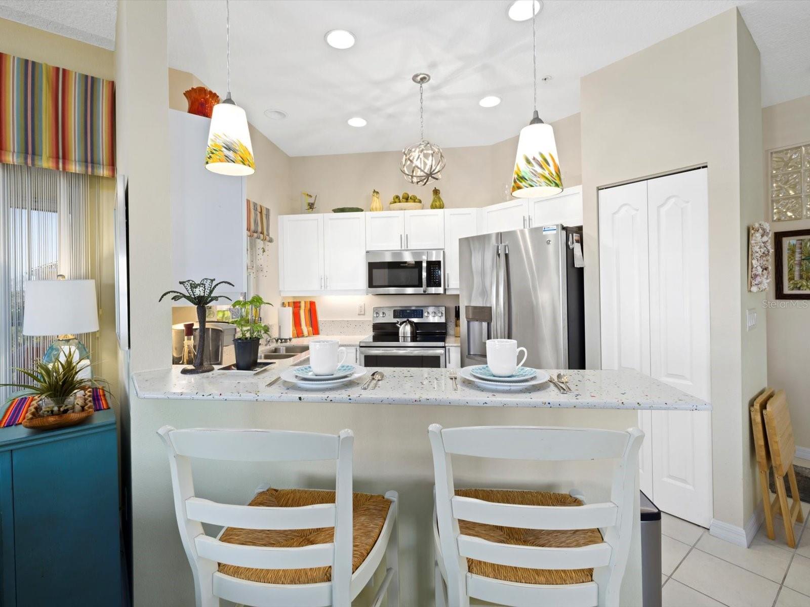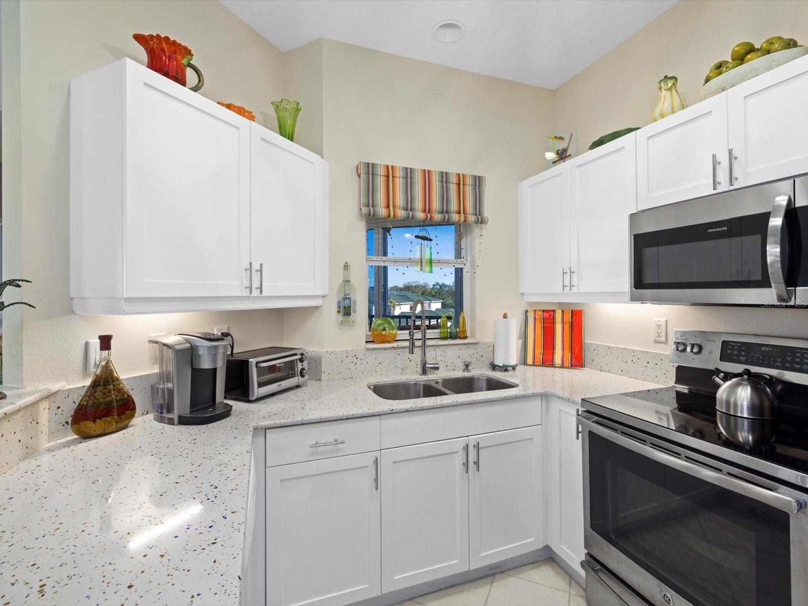 NEWLY PRICED!! BREATHTAKING VIEWS FROM TOP FLOOR OF THIS PRISTINE LUXURY TURNKEY CONDOMINIUM IN THE COURTYARDS AT GONDOLA PARK! Absolute gem with the most desirable location in this community! With a stunning view of the lake, pool, golf course, clubhouse, and greenery out three sides of this unit, you'll enjoy a bright, sunny ambiance while you bask in a feeling of vacation...year round! Enjoy and feel secure with a gated entry at each building, elevator or stairs to this unit, spectacular atrium in the interior open air courtyard! This property has been lovingly maintained, beautifully decorated with the finest furniture and accessories. Primary bedroom suite offers ample closet space, beautiful bathroom with soaking tub, separate shower, quartz countertops, and lovely tile; and a private escape to the spacious Florida room overlooking tranquility. Guest bedroom offers Juliet Balcony overlooking beautiful views, a walk-in closet, and private entry to common bathroom with quartz countertops, full tub/shower, and natural light. Living room and Kitchen offer bright, open and spacious feel with vibrant colors and light! Pretty kitchen with quartz countertops, newer stainless steel appliances, and pantry closet. One year new luxury vinyl plank flooring and tile throughout for low maintenance living! Two year new central a/c & heat pump, recent roof replacement throughout the Courtyards. This unit also has a deeded one car garage with private driveway for an additional car! Guest parking available adjacent to the building. Pickleball is a popular pastime here at the Courtyards, and can be pretty competitive. On site gym, craft room, clubhouse, in-ground pool, lake, and community activities will keep you active and meeting wonderful friends. Your association dues include cable (& internet beginning in July), water, sewer, tennis, pickleball, 2 gyms, craft room, club house, pool, all outdoor maintenance to grounds and buildings.