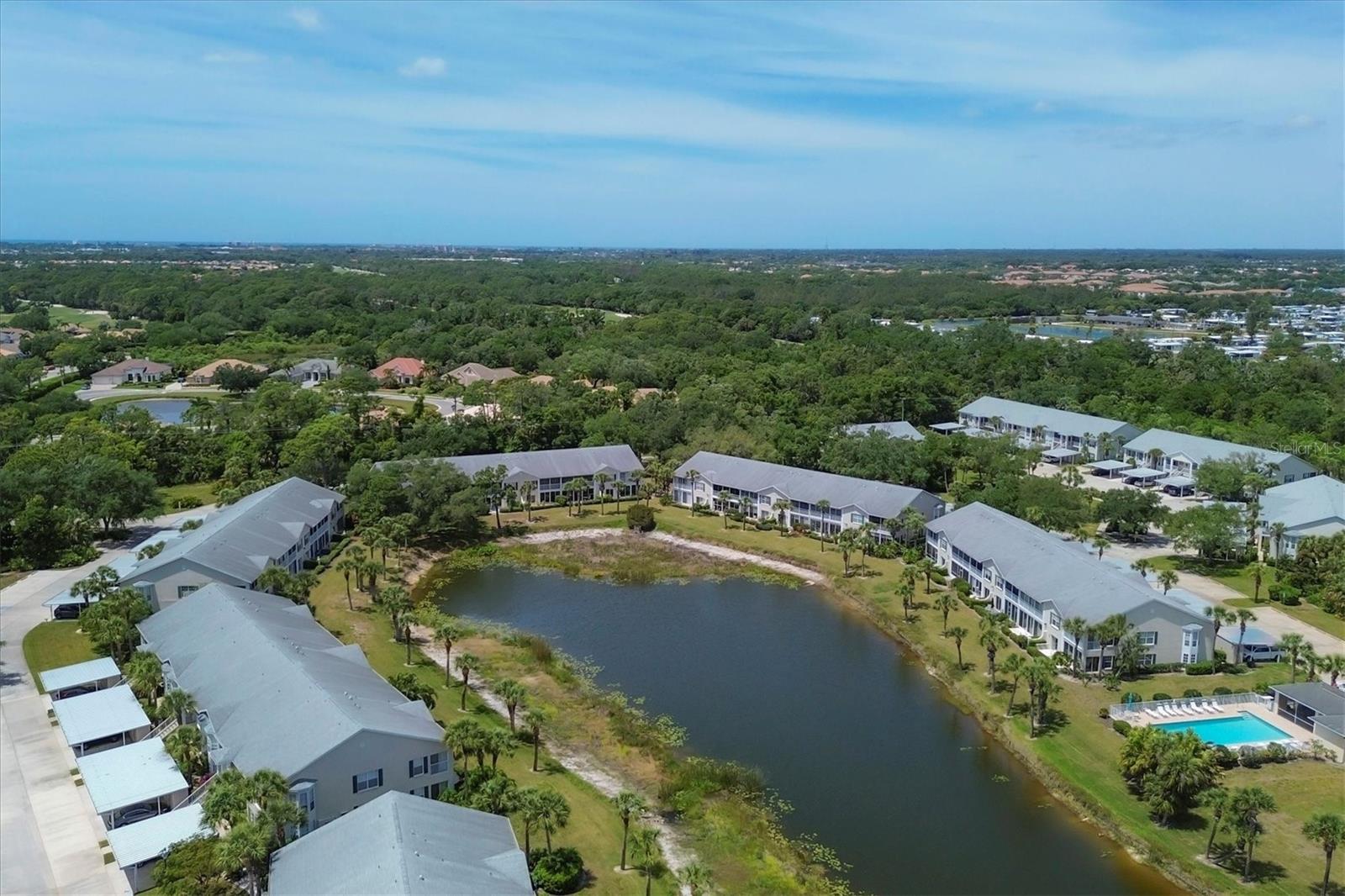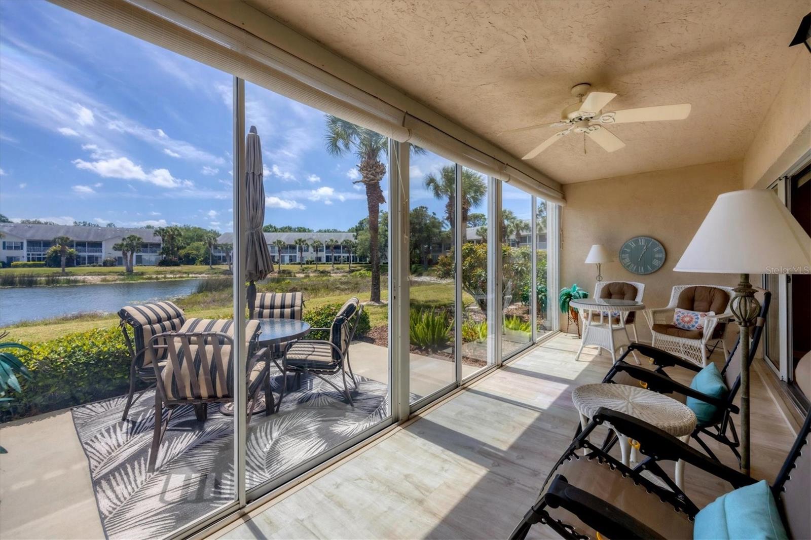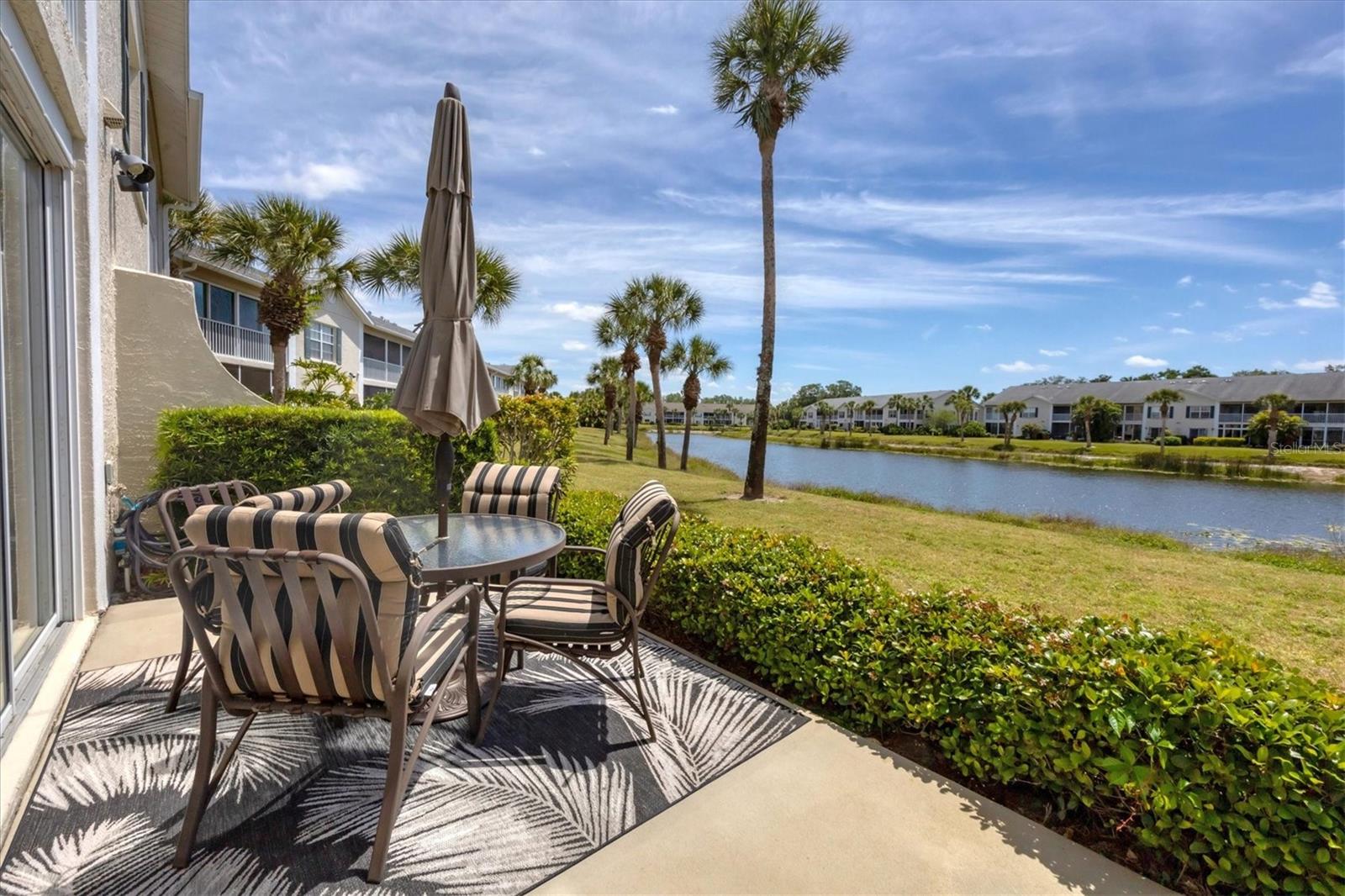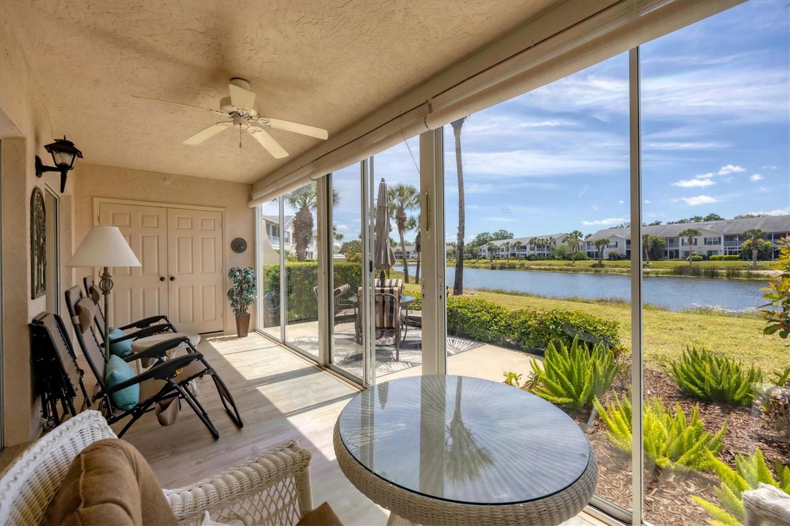 Panoramic lake views from this "first floor" ground unit being offered furnished and ready for your personal items!! One of the few condos with an oversized, glass enclosed lanai to enjoy year around!! Don't miss this awesome opportunity to "just move in", home is clean as a whistle, shows beautifully and waiting for you. Nestled among beautiful trees, lakes, ponds, winding roads, near walking and bicycling paths AND just minutes to Historical Downtown Venice and the beautiful Beaches on the Gulf of Mexico/Intracoastal Waterway, a "one of a kind location!" This home is in pristine condition, it has been loved, well taken care of and now waiting for you! Enter into lovely foyer with tile flooring then luxury vinyl extends thru out most of the home. Well appointed kitchen with tile floors, breakfast nook w/bay window overlooks your tropical gardens for your morning coffee. Multiple cabinets compliment the kitchen and breakfast bar to the dining area/living room. Dining area is adjacent to breakfast bar then to open, spacious living room. There are 2 bedrooms, one used as a Guest/den/TV room/office with a pull out couch to accommodate guests, blt in closet, your choice of uses. Bath #2 just steps away. Master bedroom has walk in closet, nice master bath w/double vanities, large shower w/sliding door. Sliding glass doors from living room and master bedroom to Florida room joins home together giving great views and ambiance of outdoors and wildlife. An overhead ceiling fan (5 thru out) provides great air flow and ventilation to this 22 x 8 ft Florida room (approx 176 sq ft not included in living area tax records) and extends the living area in home to approx 1352 sq ft living area. Sliding glass doors and window treatments compliment the entire area while giving direct access to your waterfront, 15x 8 ft patio and tropical landscaped paradise!!