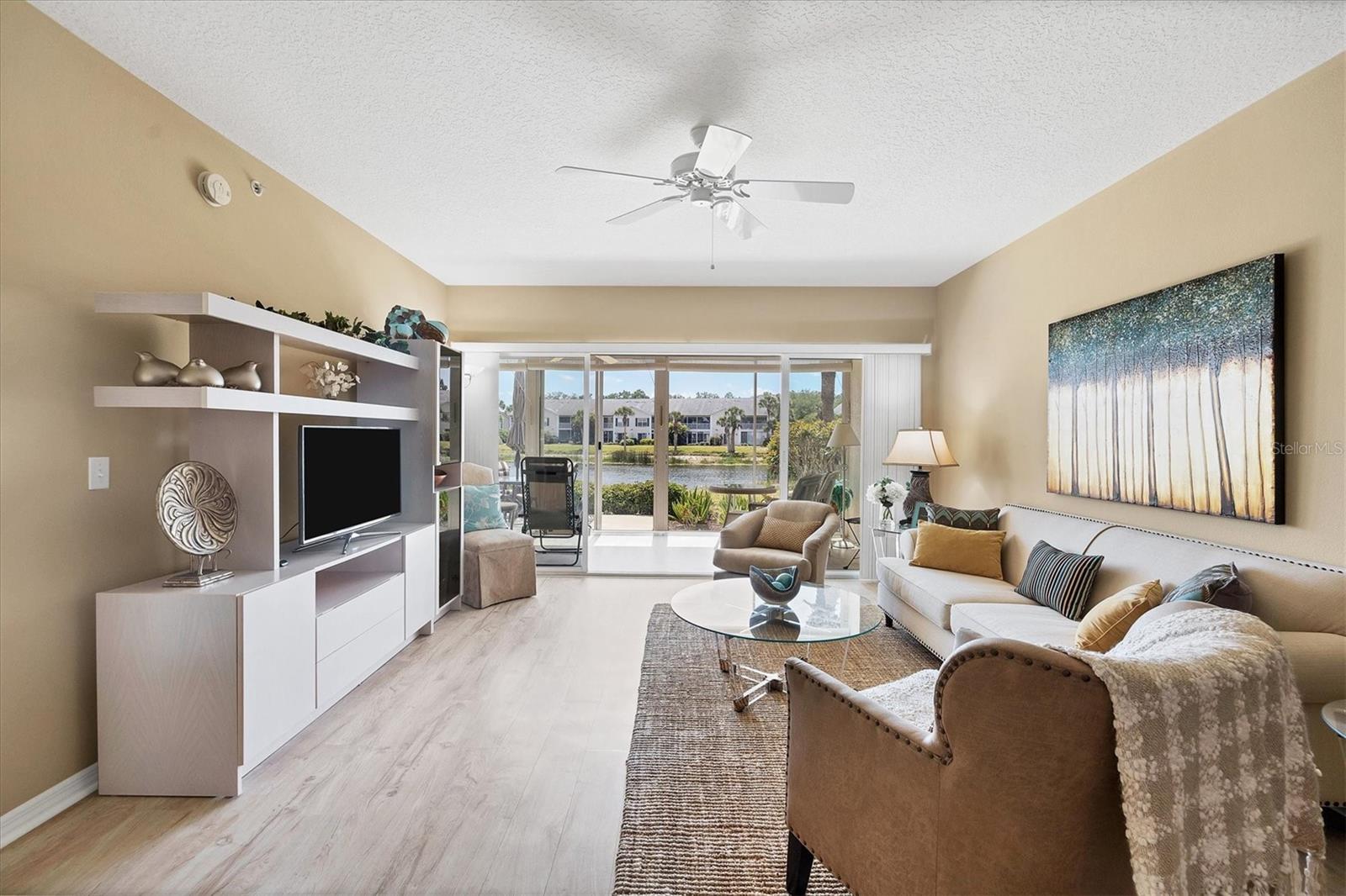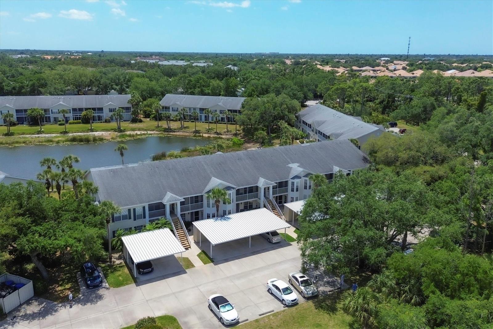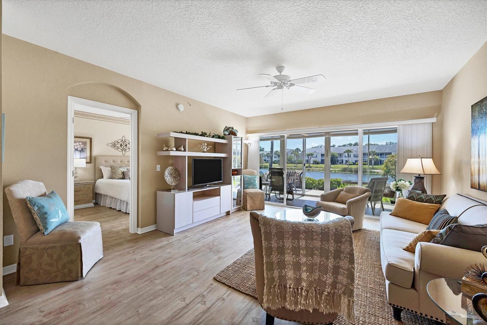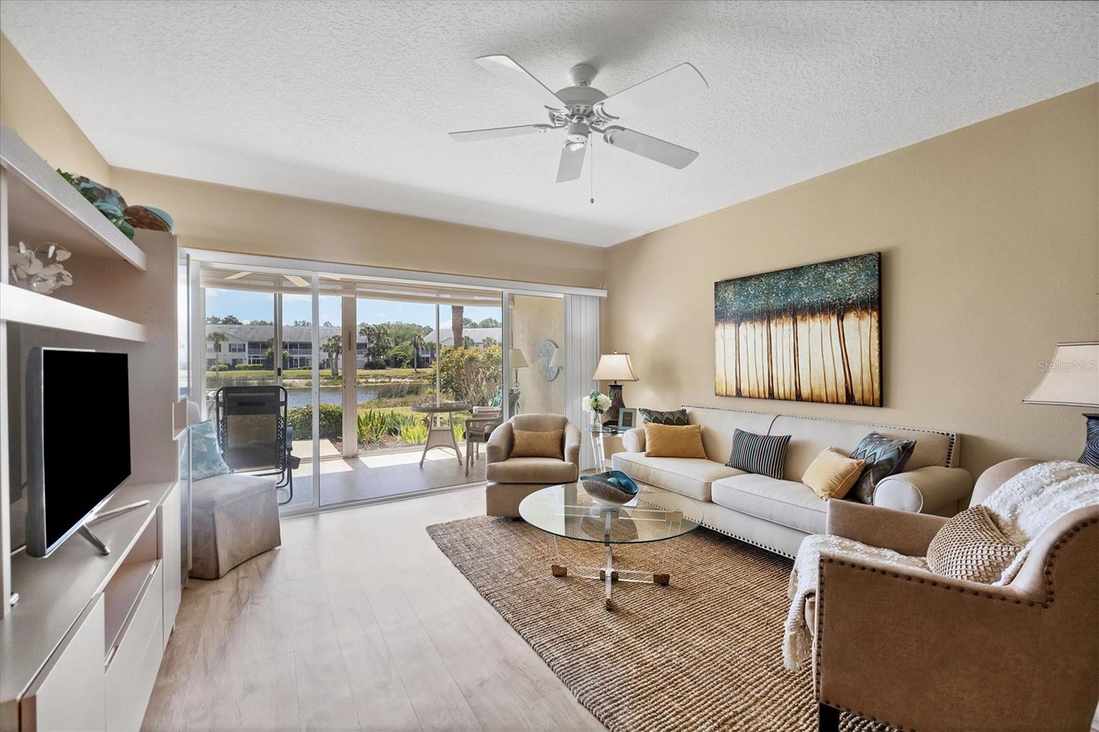 Panoramic lake views from this "first floor" ground unit being offered furnished and ready for your personal items!! One of the few condos with an oversized, glass enclosed lanai to enjoy year around!! Don't miss this awesome opportunity to "just move in", home is clean as a whistle, shows beautifully and waiting for you. Nestled among beautiful trees, lakes, ponds, winding roads, near walking and bicycling paths AND just minutes to Historical Downtown Venice and the beautiful Beaches on the Gulf of Mexico/Intracoastal Waterway, a "one of a kind location!" This home is in pristine condition, it has been loved, well taken care of and now waiting for you! Enter into lovely foyer with tile flooring then luxury vinyl extends thru out most of the home. Well appointed kitchen with tile floors, breakfast nook w/bay window overlooks your tropical gardens for your morning coffee. Multiple cabinets compliment the kitchen and breakfast bar to the dining area/living room. Dining area is adjacent to breakfast bar then to open, spacious living room. There are 2 bedrooms, one used as a Guest/den/TV room/office with a pull out couch to accommodate guests, blt in closet, your choice of uses. Bath #2 just steps away. Master bedroom has walk in closet, nice master bath w/double vanities, large shower w/sliding door. Sliding glass doors from living room and master bedroom to Florida room joins home together giving great views and ambiance of outdoors and wildlife. An overhead ceiling fan (5 thru out) provides great air flow and ventilation to this 22 x 8 ft Florida room (approx 176 sq ft not included in living area tax records) and extends the living area in home to approx 1352 sq ft living area. Sliding glass doors and window treatments compliment the entire area while giving direct access to your waterfront, 15x 8 ft patio and tropical landscaped paradise!!