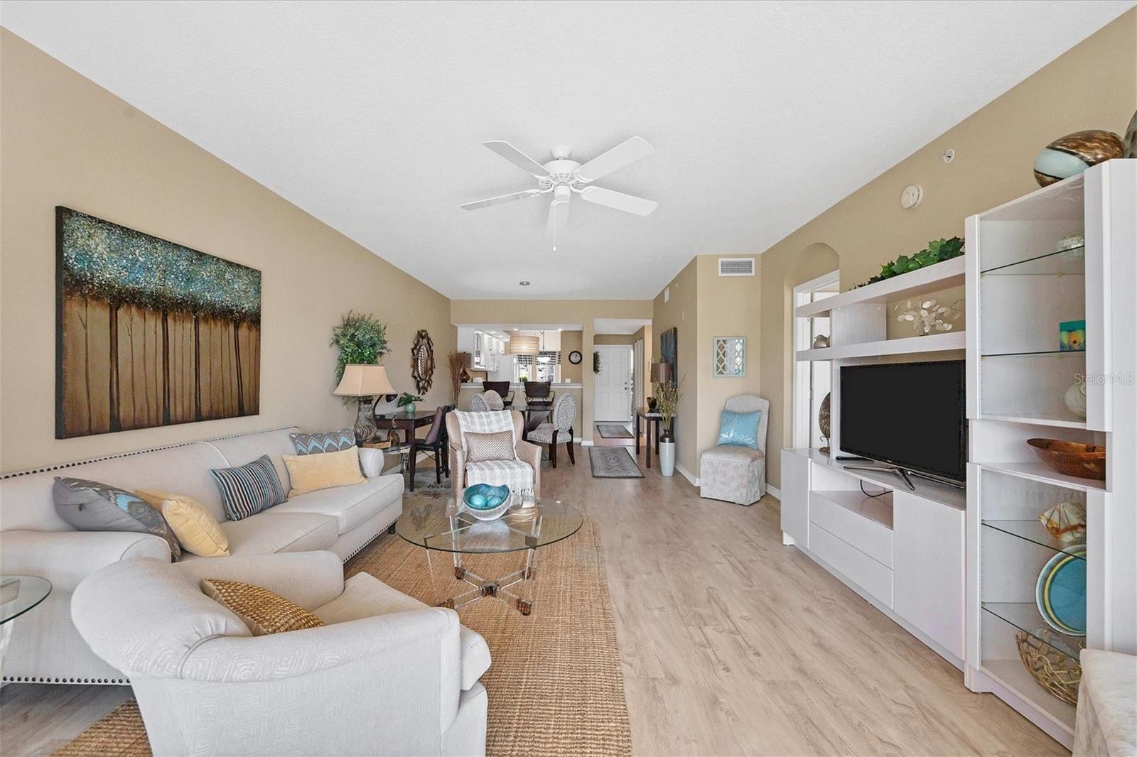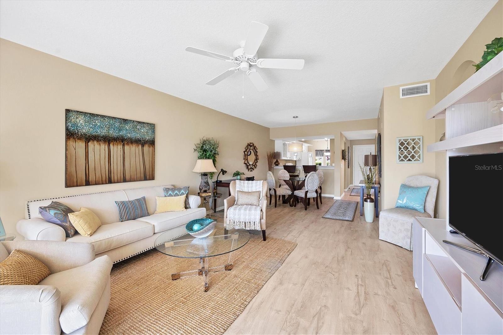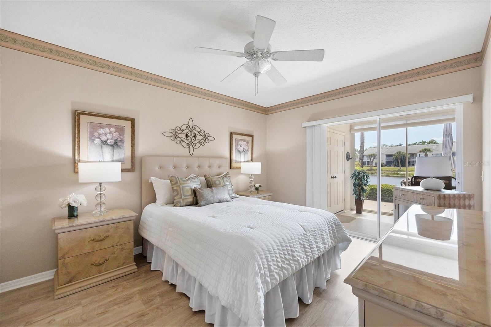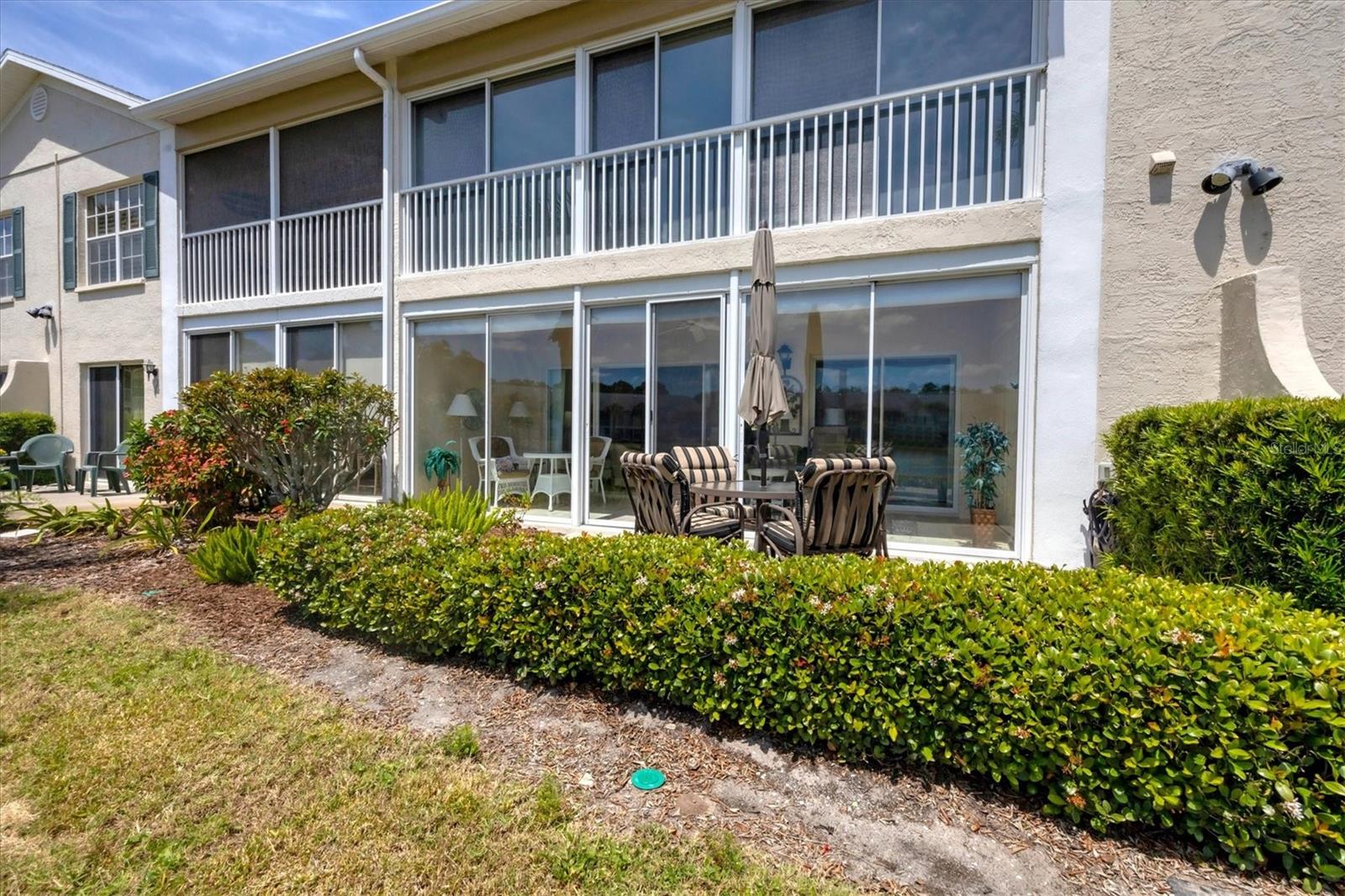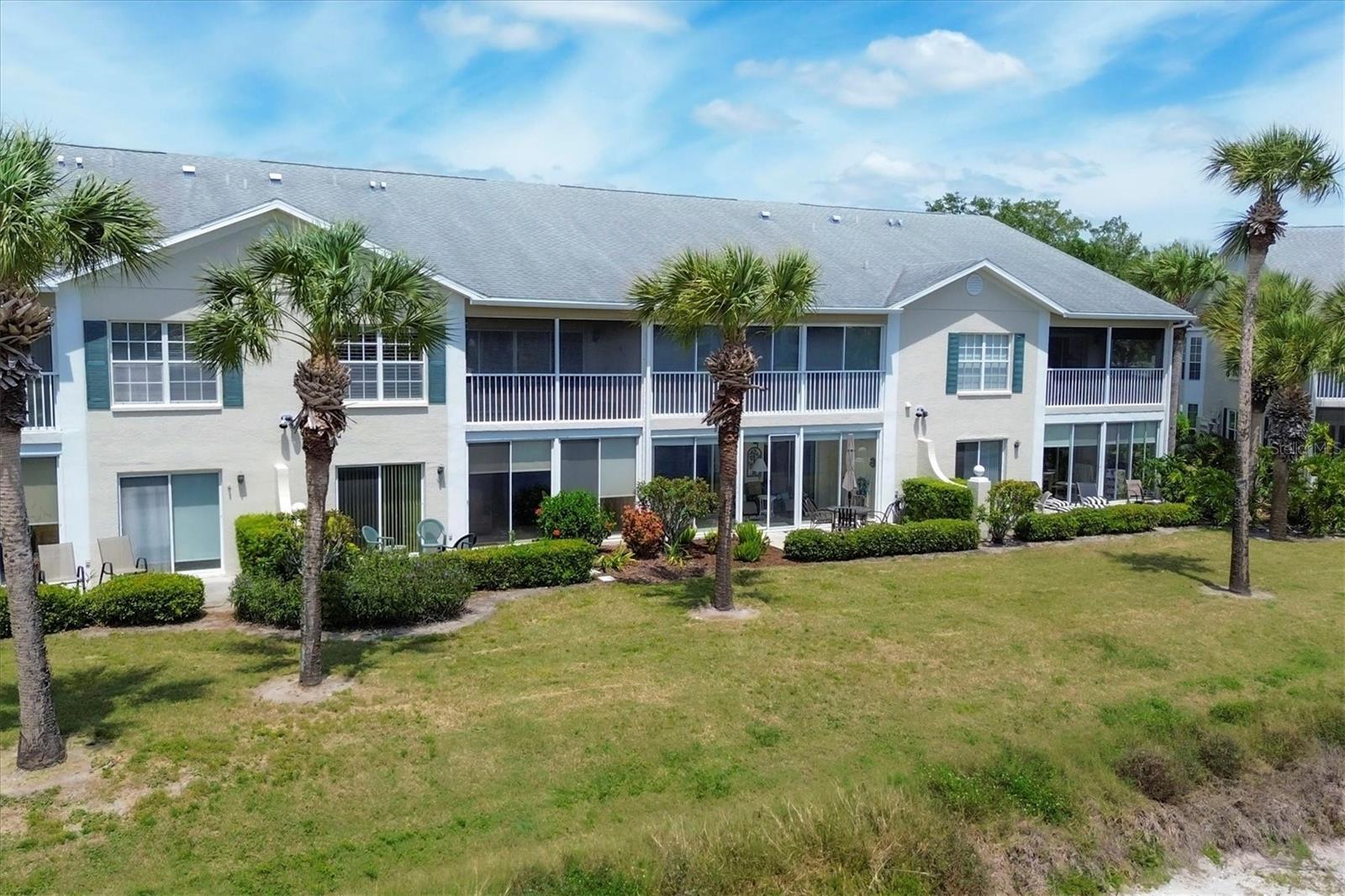 Panoramic lake views from this "first floor" ground unit being offered furnished and ready for your personal items!! One of the few condos with an oversized, glass enclosed lanai to enjoy year around!! Don't miss this awesome opportunity to "just move in", home is clean as a whistle, shows beautifully and waiting for you. Nestled among beautiful trees, lakes, ponds, winding roads, near walking and bicycling paths AND just minutes to Historical Downtown Venice and the beautiful Beaches on the Gulf of Mexico/Intracoastal Waterway, a "one of a kind location!" This home is in pristine condition, it has been loved, well taken care of and now waiting for you! Enter into lovely foyer with tile flooring then luxury vinyl extends thru out most of the home. Well appointed kitchen with tile floors, breakfast nook w/bay window overlooks your tropical gardens for your morning coffee. Multiple cabinets compliment the kitchen and breakfast bar to the dining area/living room. Dining area is adjacent to breakfast bar then to open, spacious living room. There are 2 bedrooms, one used as a Guest/den/TV room/office with a pull out couch to accommodate guests, blt in closet, your choice of uses. Bath #2 just steps away. Master bedroom has walk in closet, nice master bath w/double vanities, large shower w/sliding door. Sliding glass doors from living room and master bedroom to Florida room joins home together giving great views and ambiance of outdoors and wildlife. An overhead ceiling fan (5 thru out) provides great air flow and ventilation to this 22 x 8 ft Florida room (approx 176 sq ft not included in living area tax records) and extends the living area in home to approx 1352 sq ft living area. Sliding glass doors and window treatments compliment the entire area while giving direct access to your waterfront, 15x 8 ft patio and tropical landscaped paradise!!