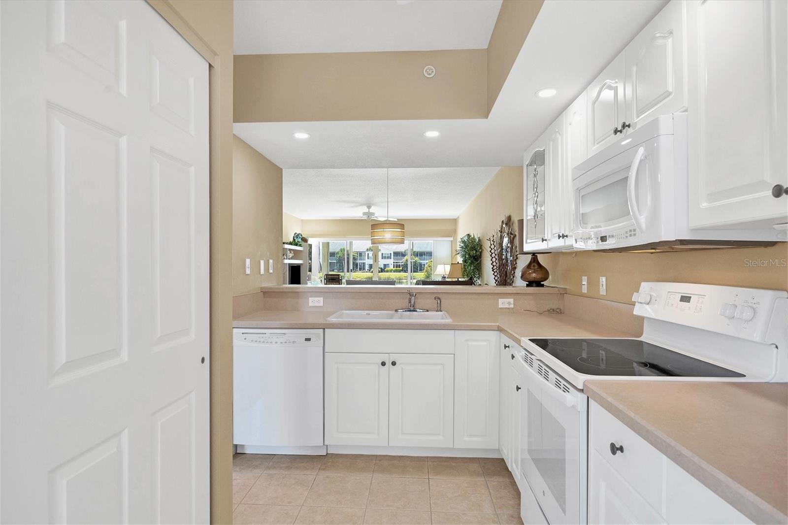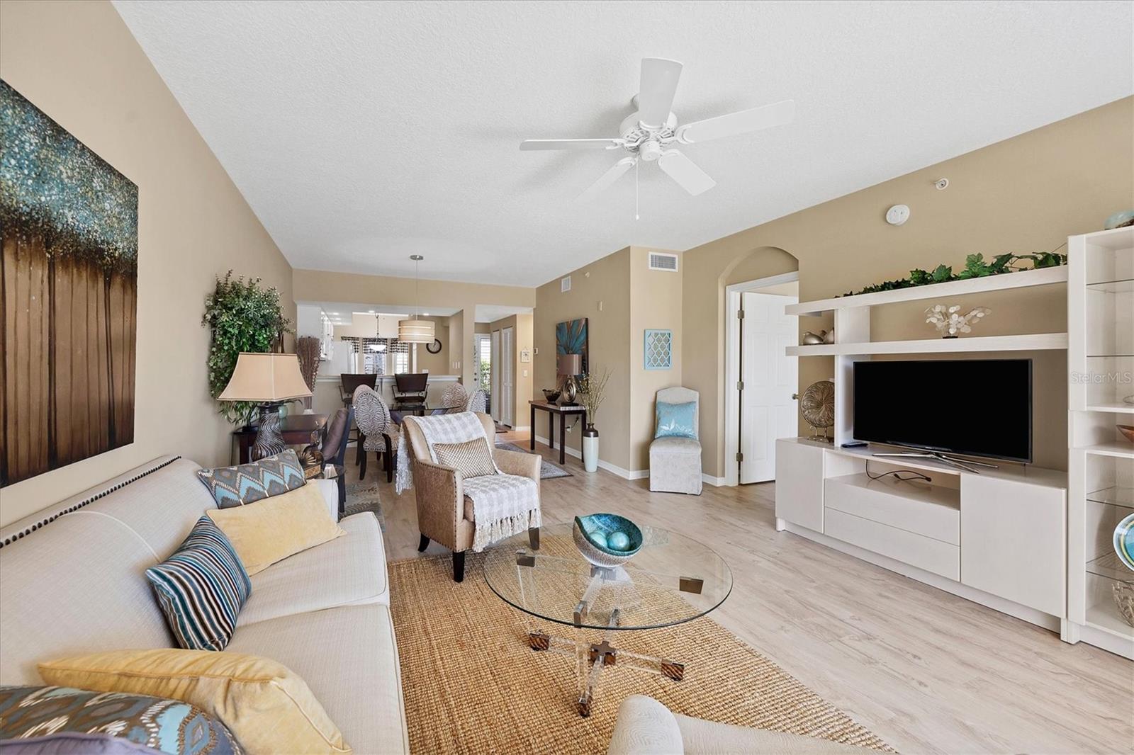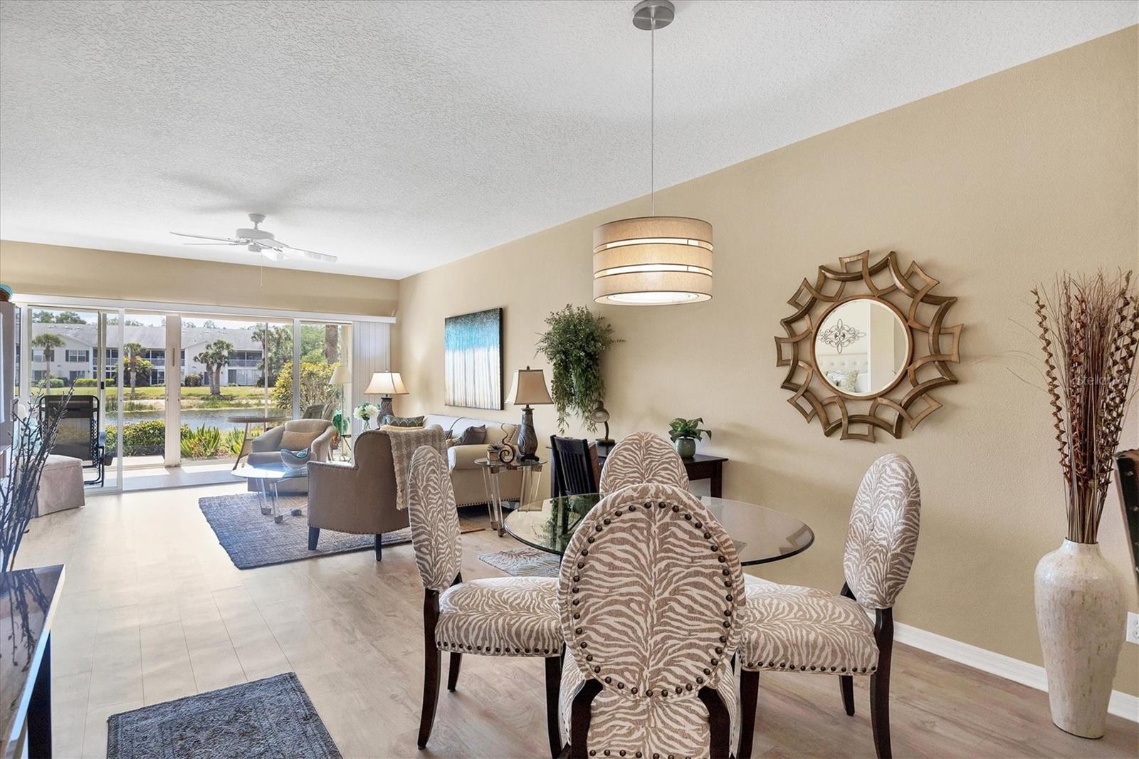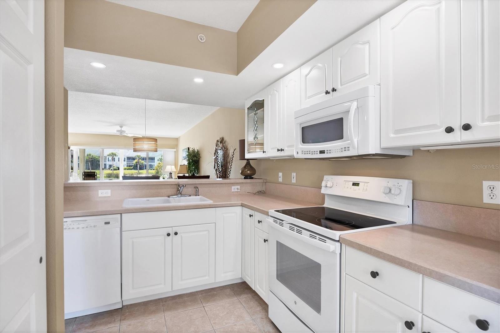 Panoramic lake views from this "first floor" ground unit being offered furnished and ready for your personal items!! One of the few condos with an oversized, glass enclosed lanai to enjoy year around!! Don't miss this awesome opportunity to "just move in", home is clean as a whistle, shows beautifully and waiting for you. Nestled among beautiful trees, lakes, ponds, winding roads, near walking and bicycling paths AND just minutes to Historical Downtown Venice and the beautiful Beaches on the Gulf of Mexico/Intracoastal Waterway, a "one of a kind location!" This home is in pristine condition, it has been loved, well taken care of and now waiting for you! Enter into lovely foyer with tile flooring then luxury vinyl extends thru out most of the home. Well appointed kitchen with tile floors, breakfast nook w/bay window overlooks your tropical gardens for your morning coffee. Multiple cabinets compliment the kitchen and breakfast bar to the dining area/living room. Dining area is adjacent to breakfast bar then to open, spacious living room. There are 2 bedrooms, one used as a Guest/den/TV room/office with a pull out couch to accommodate guests, blt in closet, your choice of uses. Bath #2 just steps away. Master bedroom has walk in closet, nice master bath w/double vanities, large shower w/sliding door. Sliding glass doors from living room and master bedroom to Florida room joins home together giving great views and ambiance of outdoors and wildlife. An overhead ceiling fan (5 thru out) provides great air flow and ventilation to this 22 x 8 ft Florida room (approx 176 sq ft not included in living area tax records) and extends the living area in home to approx 1352 sq ft living area. Sliding glass doors and window treatments compliment the entire area while giving direct access to your waterfront, 15x 8 ft patio and tropical landscaped paradise!!