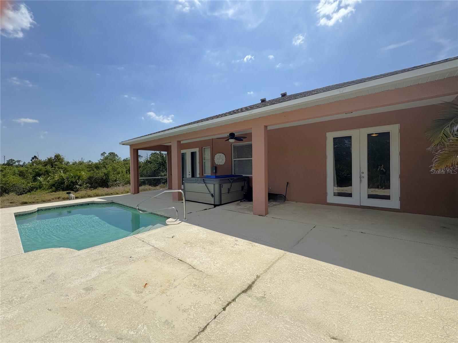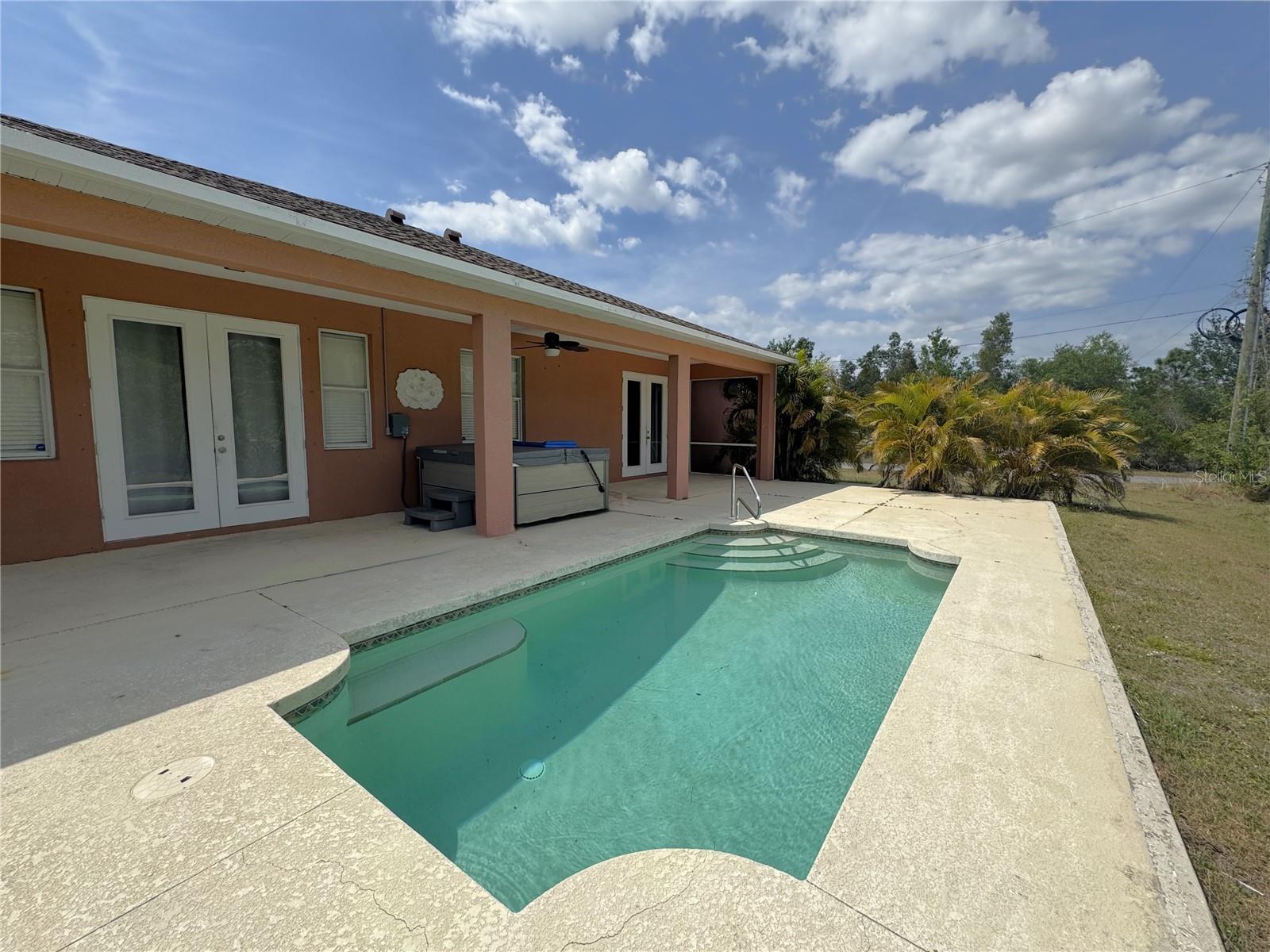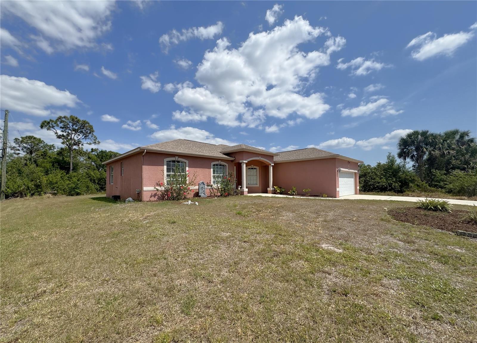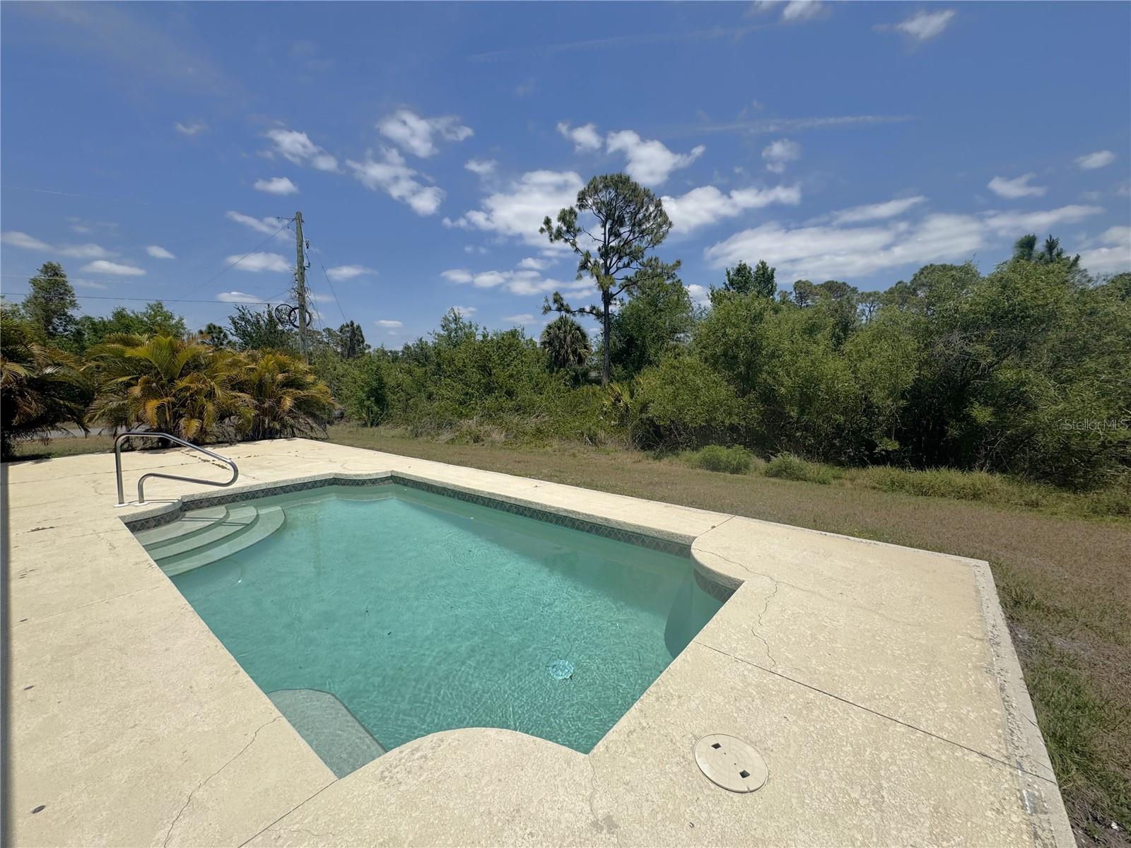 Beautiful corner lot over 1,800 square foot, 4 bedroom, 2 bath, 2 car garage POOL home that DID NOT FLOOD on over a quarter acre with NO HOA, NO CDD, freshly painted, NEW flooring in the bedrooms, 2023 roof, 2022 AC, is awaiting new owners, or could be used a beautiful rental home! The open floorplan is enhanced by high ceilings with recessed lighting, neutral paint, eat in areas in the kitchen, ceramic tile in main living area and baths, laminate flooring in all the bedrooms, two sets of french doors to the partial covered pool oasis, and a plethora of windows to allow natural light to filter through. The well-appointed kitchen presents plenty of counter and cabinetry, kitchen reverse osmosis system, stainless steel appliances, and a breakfast bar that look into the dining and living areas. The primary suite has a set of french doors to provide entry to the lanai, two nicely appointed walk-in closets, and an en-suite bath with a dual sink vanity with make-up area, a walk-in tiled shower, soaking tub, and a water closet. On the other end of the home are three sizable guest bedrooms and a guest bath with a tub and shower combo. Additional features include a covered front porch, a multitude of ceiling fans, gutters and downspouts, laundry inside the oversized garage, and a water heater. This home is near North Port and Port Charlotte restaurants, shopping, golf courses as well as a short drive to various gulf beaches and marinas! Call for your private showing today!