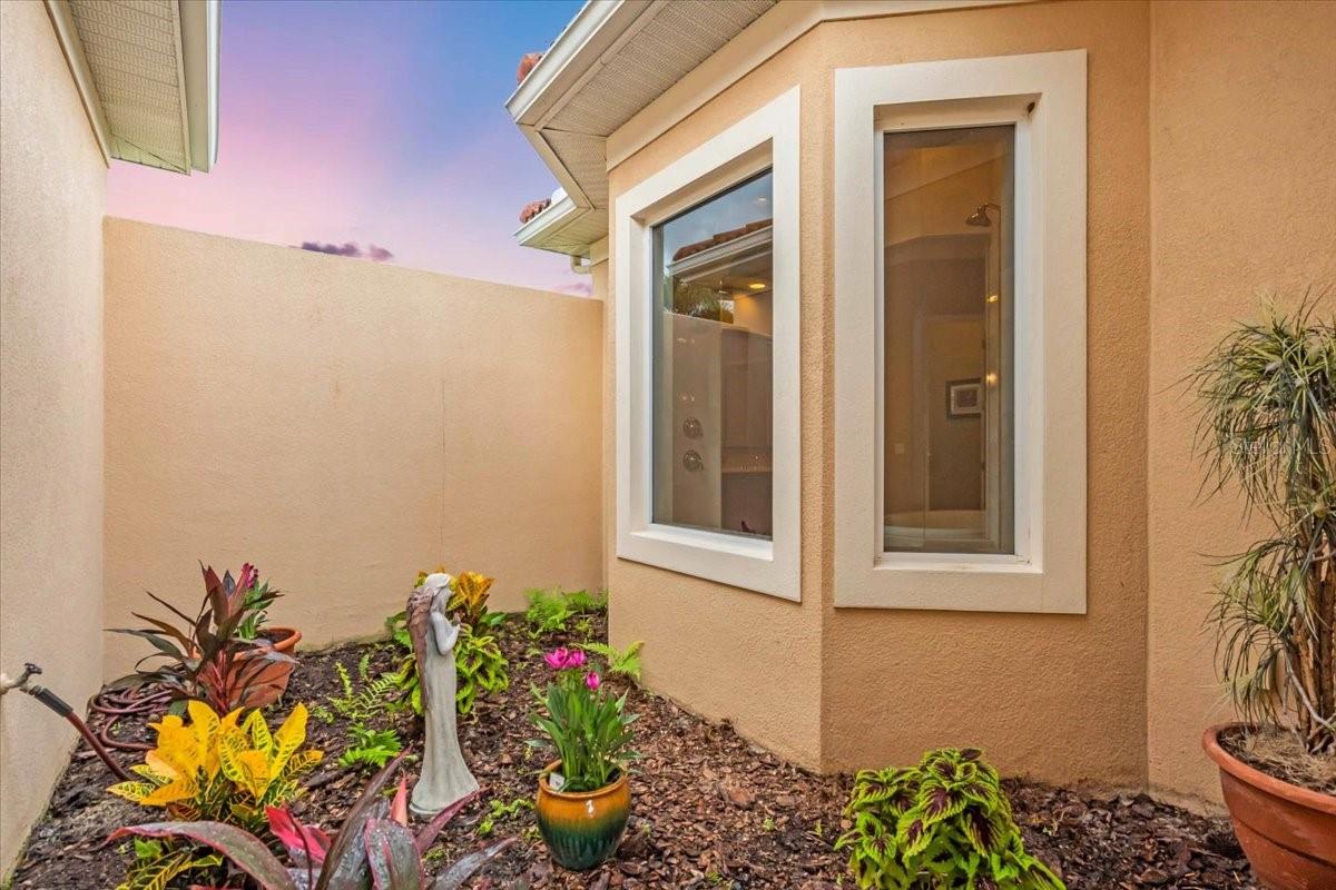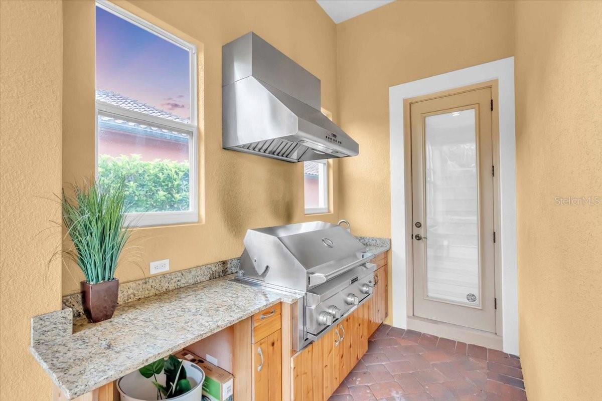 Exterior: Garden, Lighting, Outdoor Grill, Outdoor Kitchen, Rain Gutters, Sidewalk, Sliding Doors