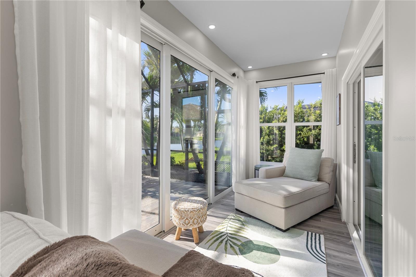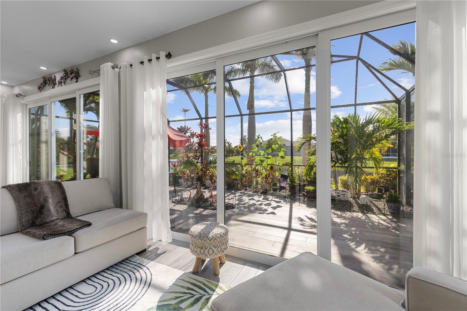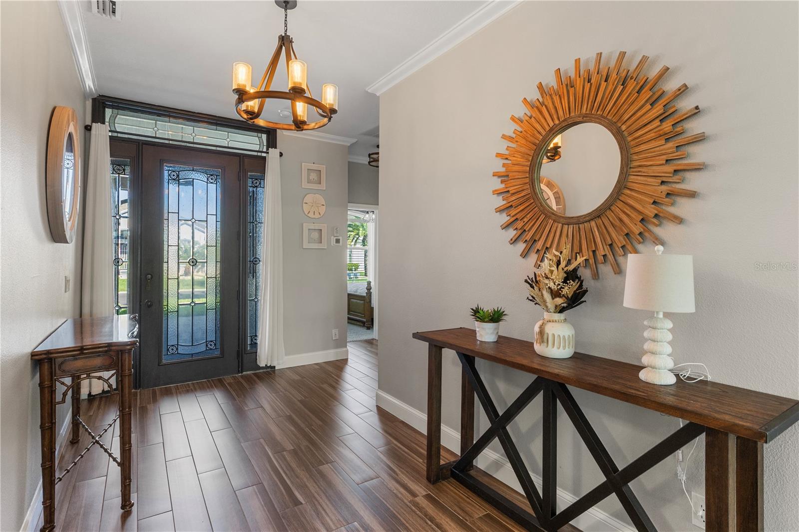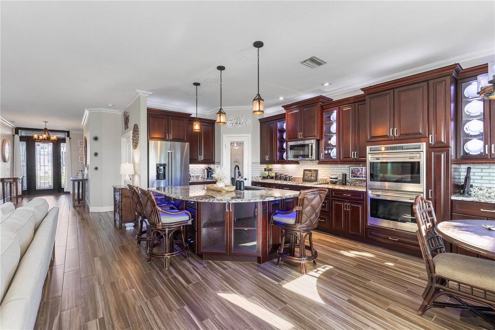 BEAUTIFULLY RENOVATED LAKEFRONT HOME WITH HIGH-END FINISHES AND THOUGHTFUL UPGRADES. Enjoy peace of mind with a new roof (2024), new impact-rated PGT windows and sliders (2023), and a new HVAC system (2024). Wood-plank tile flooring flows through all main living areas, complemented by crown molding throughout. The custom kitchen features solid cherry wood cabinets with glass inserts and pull-outs, a large center island, corner pantry, and breakfast nook with lake views. Appliances include a Viking induction cooktop (2023), Wolf built-in double ovens (2023), Bosch dishwasher (2025), and KitchenAid refrigerator (2023), and vented microwave (2023).The lanai was enclosed with impact glass sliders to create a sunny Florida room with views of the lake. The outdoor space includes a wood-look tiled floor, lush landscape and updated screen cage (2021). The spacious primary suite offers double closets and the ensuite bath has been fully renovated with a modern glass enclosed walk-in shower, separate soaking tub, double vanities, and a tankless on-demand water heater (2024).There are two guest bedrooms with a shared bath, plus a fourth bedroom with double glass doors currently used as a den. Ample storage includes added attic decking and custom cabinetry in the garage. The garage also features a mini-split A/C system (2023), tool chest, and freezer--all included.Additional features include LED lighting, permanent app-controlled exterior holiday lights, and a private deep well for irrigation to keep the lawn green and costs low. Located in Woodmere Lakes, a deed-restricted neighborhood close to shopping, restaurants, and everything Venice has to offer.