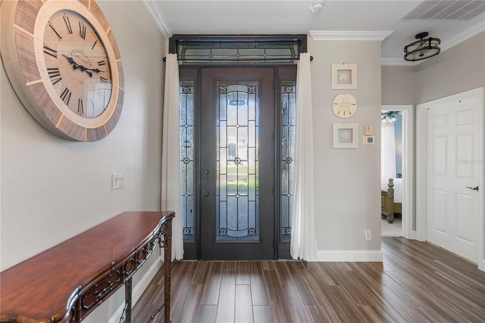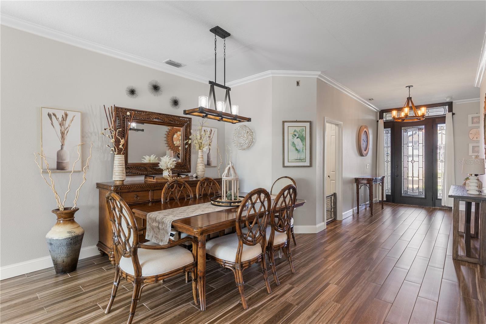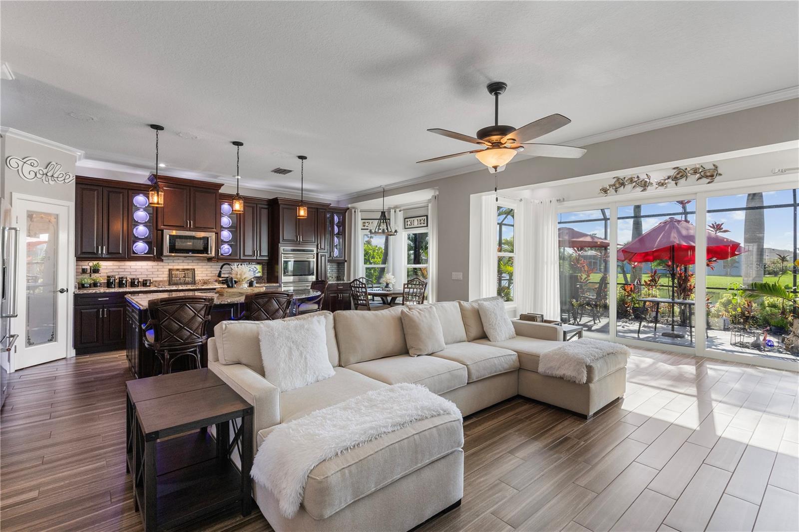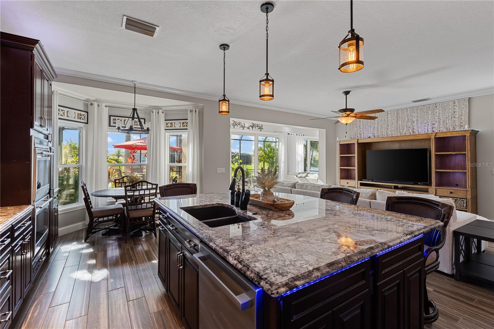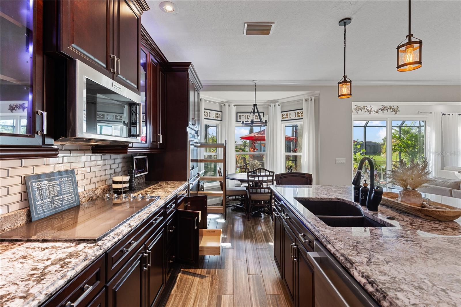 BEAUTIFULLY RENOVATED LAKEFRONT HOME WITH HIGH-END FINISHES AND THOUGHTFUL UPGRADES. Enjoy peace of mind with a new roof (2024), new impact-rated PGT windows and sliders (2023), and a new HVAC system (2024). Wood-plank tile flooring flows through all main living areas, complemented by crown molding throughout. The custom kitchen features solid cherry wood cabinets with glass inserts and pull-outs, a large center island, corner pantry, and breakfast nook with lake views. Appliances include a Viking induction cooktop (2023), Wolf built-in double ovens (2023), Bosch dishwasher (2025), and KitchenAid refrigerator (2023), and vented microwave (2023).The lanai was enclosed with impact glass sliders to create a sunny Florida room with views of the lake. The outdoor space includes a wood-look tiled floor, lush landscape and updated screen cage (2021). The spacious primary suite offers double closets and the ensuite bath has been fully renovated with a modern glass enclosed walk-in shower, separate soaking tub, double vanities, and a tankless on-demand water heater (2024).There are two guest bedrooms with a shared bath, plus a fourth bedroom with double glass doors currently used as a den. Ample storage includes added attic decking and custom cabinetry in the garage. The garage also features a mini-split A/C system (2023), tool chest, and freezer--all included.Additional features include LED lighting, permanent app-controlled exterior holiday lights, and a private deep well for irrigation to keep the lawn green and costs low. Located in Woodmere Lakes, a deed-restricted neighborhood close to shopping, restaurants, and everything Venice has to offer.