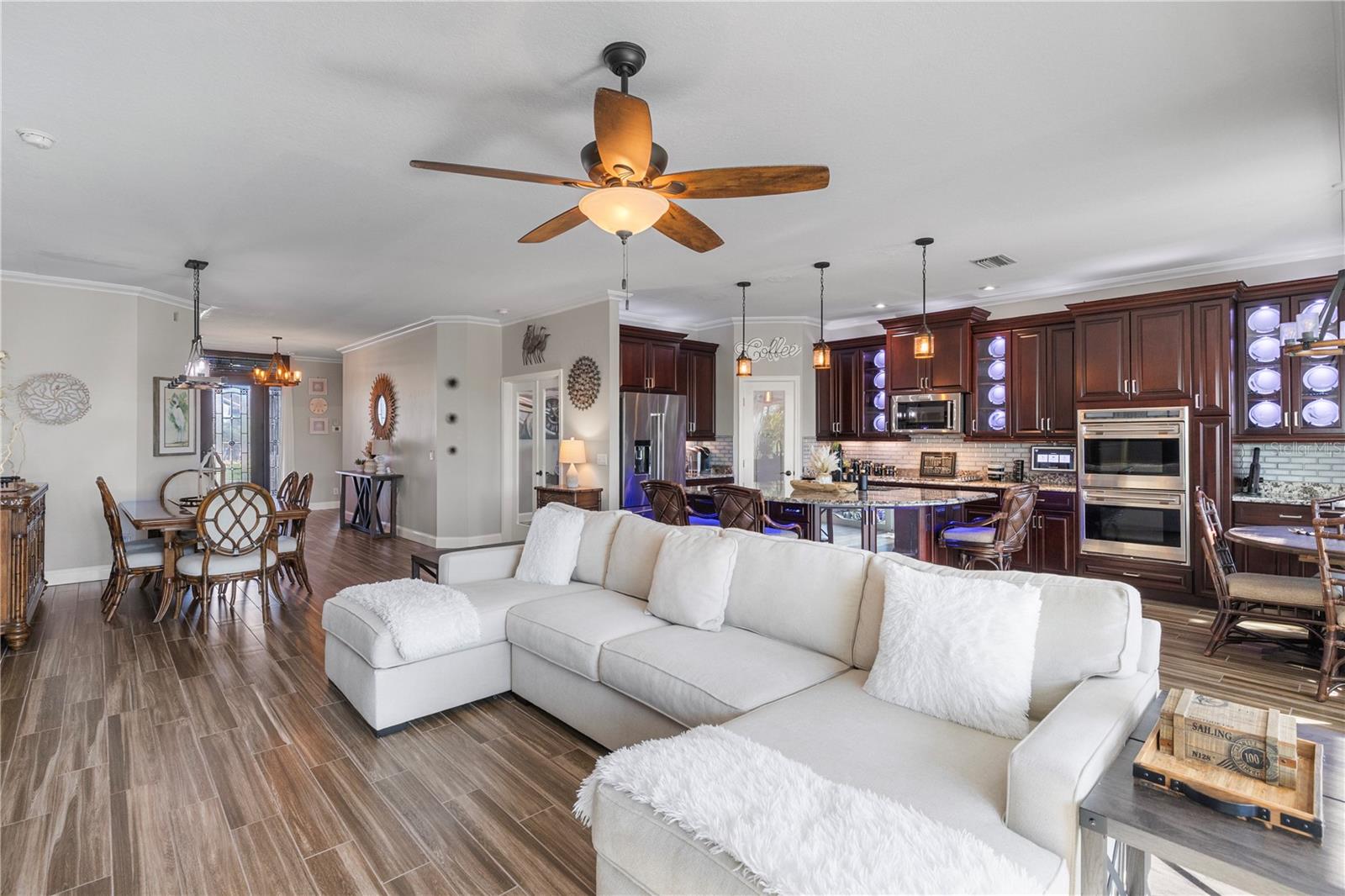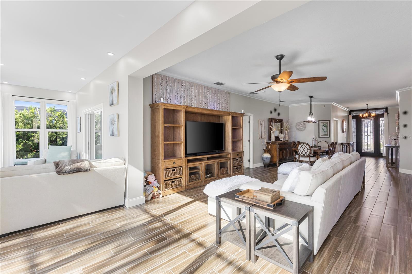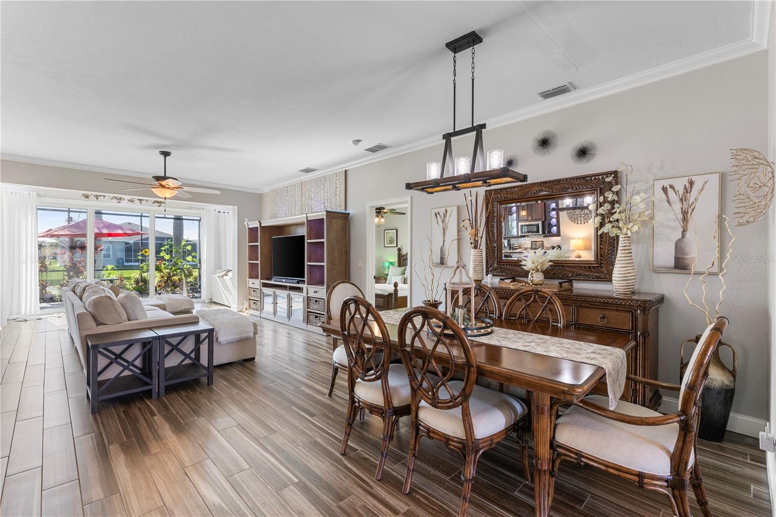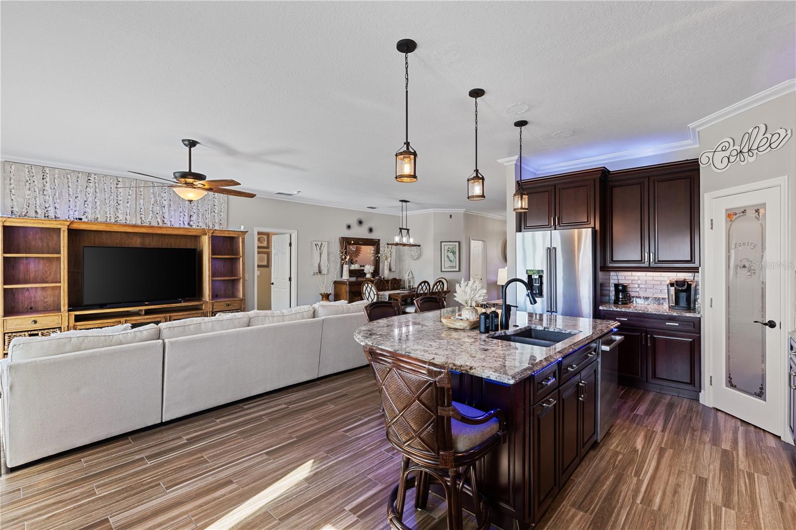 BEAUTIFULLY RENOVATED LAKEFRONT HOME WITH HIGH-END FINISHES AND THOUGHTFUL UPGRADES. Enjoy peace of mind with a new roof (2024), new impact-rated PGT windows and sliders (2023), and a new HVAC system (2024). Wood-plank tile flooring flows through all main living areas, complemented by crown molding throughout. The custom kitchen features solid cherry wood cabinets with glass inserts and pull-outs, a large center island, corner pantry, and breakfast nook with lake views. Appliances include a Viking induction cooktop (2023), Wolf built-in double ovens (2023), Bosch dishwasher (2025), and KitchenAid refrigerator (2023), and vented microwave (2023).The lanai was enclosed with impact glass sliders to create a sunny Florida room with views of the lake. The outdoor space includes a wood-look tiled floor, lush landscape and updated screen cage (2021). The spacious primary suite offers double closets and the ensuite bath has been fully renovated with a modern glass enclosed walk-in shower, separate soaking tub, double vanities, and a tankless on-demand water heater (2024).There are two guest bedrooms with a shared bath, plus a fourth bedroom with double glass doors currently used as a den. Ample storage includes added attic decking and custom cabinetry in the garage. The garage also features a mini-split A/C system (2023), tool chest, and freezer--all included.Additional features include LED lighting, permanent app-controlled exterior holiday lights, and a private deep well for irrigation to keep the lawn green and costs low. Located in Woodmere Lakes, a deed-restricted neighborhood close to shopping, restaurants, and everything Venice has to offer.