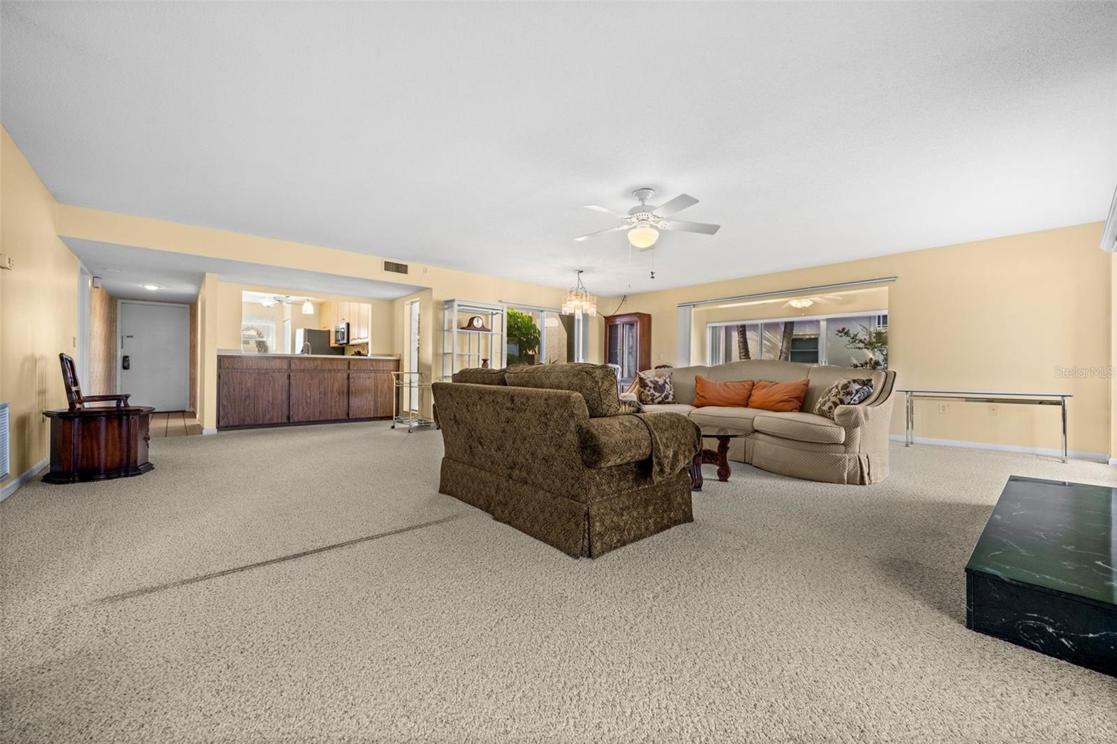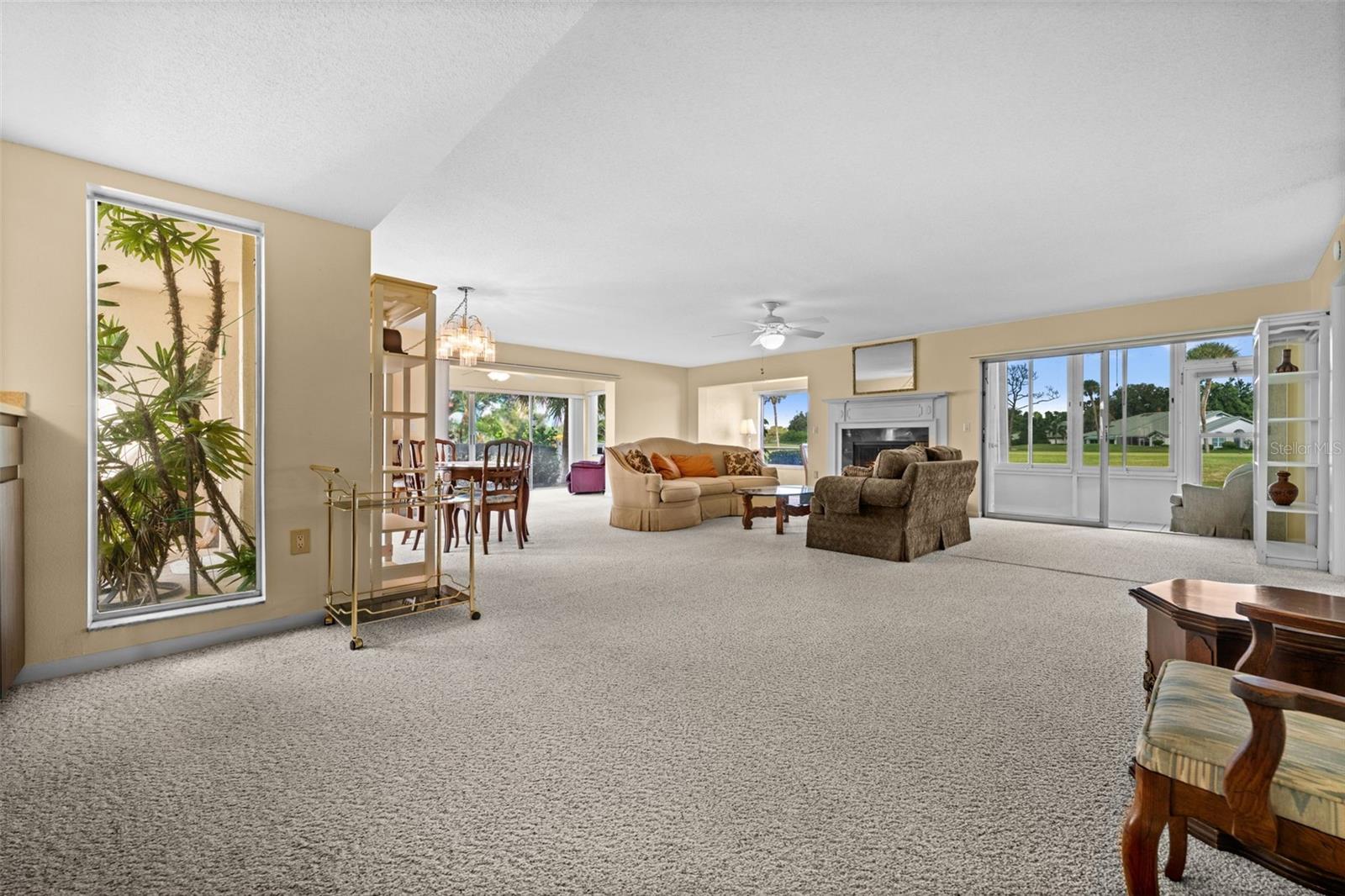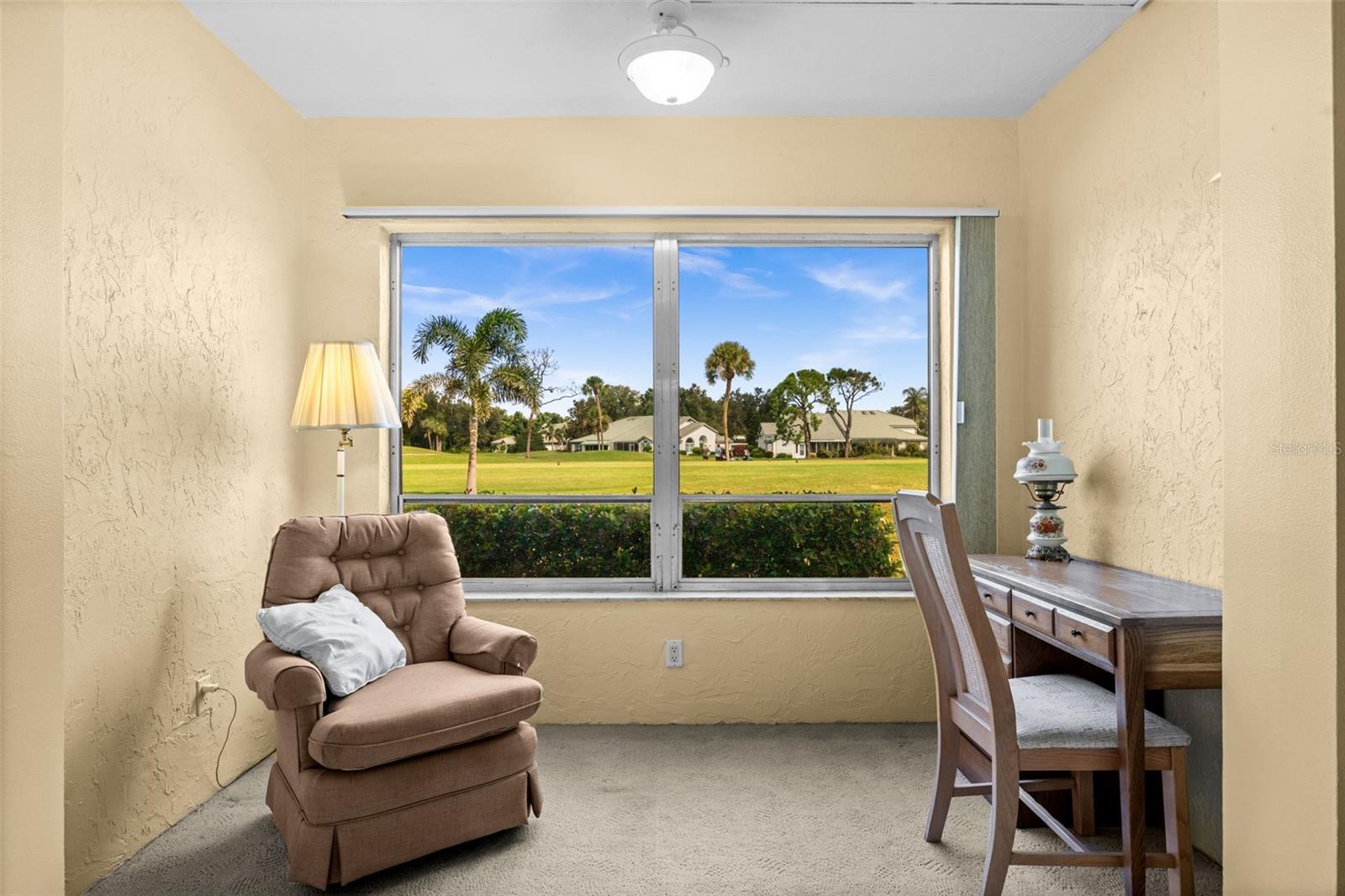 This spacious 2-bedroom, 2-bath first-floor end unit condo offers 1,607 square feet under air and stunning views of the 9th tee of the golf course! The interior features fresh paint, kitchen with stainless steel appliances as well as an in-unit washer and dryer included in the price. A gas fireplace fueled by propane adds warmth and charm, while the generous layout provides both comfort and functionality.Additional highlights include accordion shutters, a designated outdoor storage closet and a carport space conveniently located second from the left in front of the building. The unit also includes a small courtyard-style common area at the entrance and is offered partially furnished if desired by the buyer. The A/C was replaced in 2019 and the water heater in 2017.The well-maintained community offers a variety of amenities, including two pools, a clubhouse and ample parking. HOA fees cover water, sewer, cable, trash, monthly pest control and exterior maintenance/grounds --making for easy, low-maintenance living.Ideally located conveniently down the road from Publix / Mobil and a short distance to SMH Venice and Venice downtown. It also offer an easy access to Sarasota, Wellen Park and local airports. This condo combines comfort, convenience and beautiful golf course views--an excellent opportunity for full-time or seasonal Florida living.