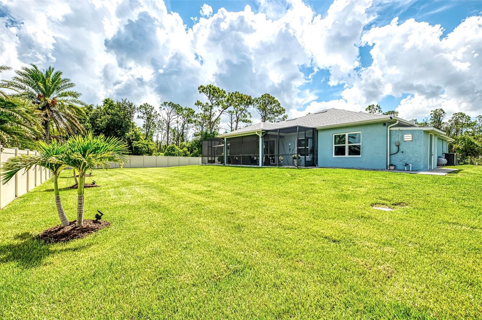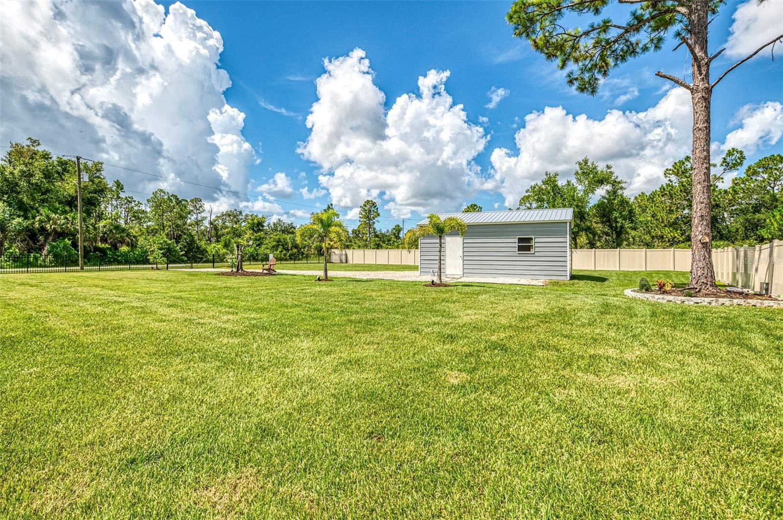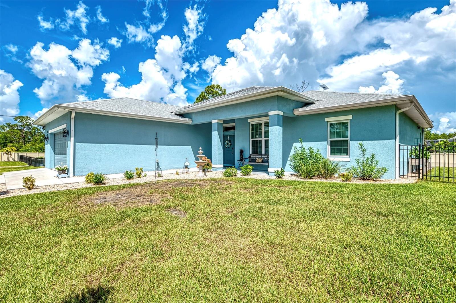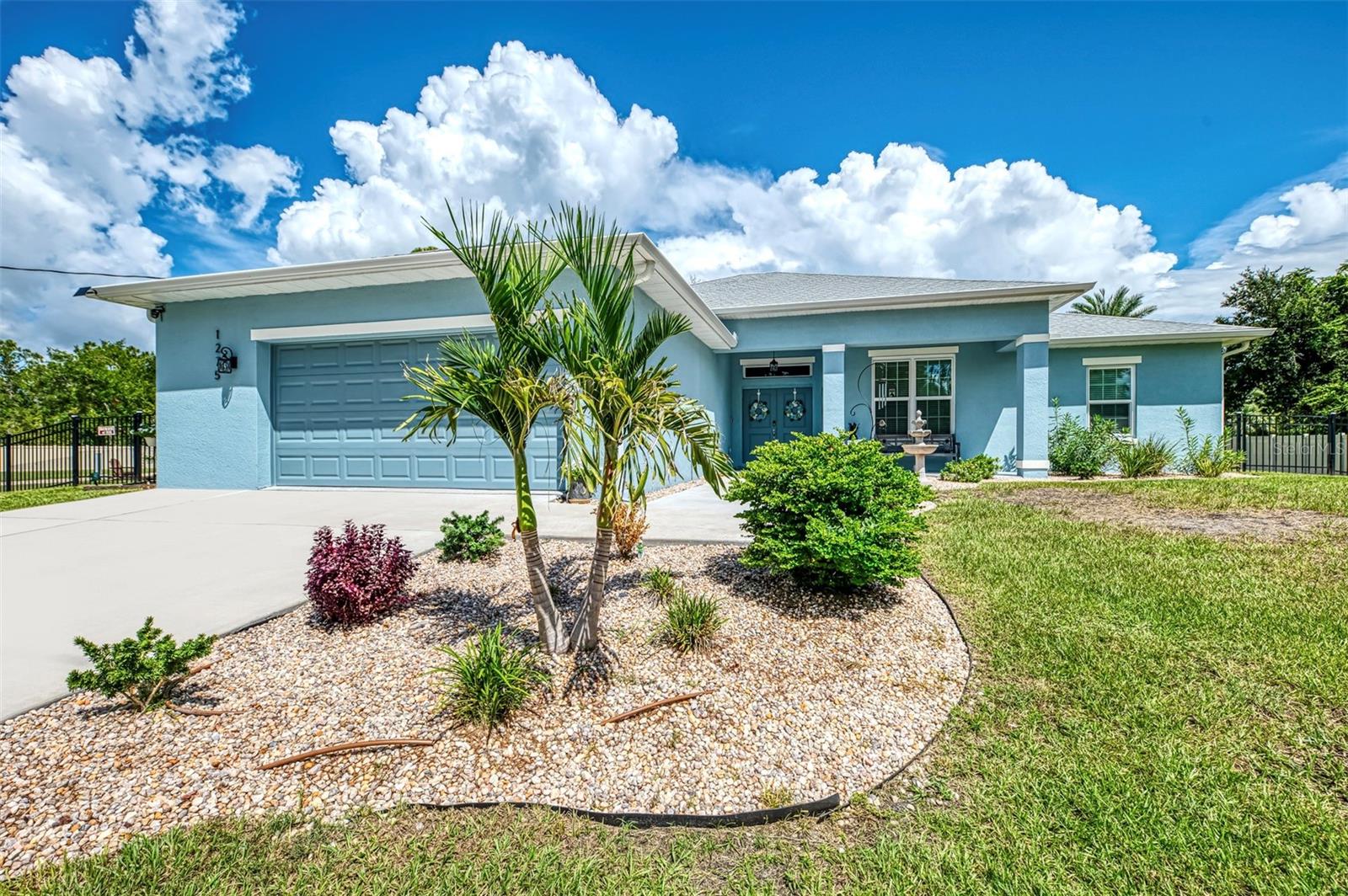 SPECTACULAR PRICE REDUCTION . . . Homebuyers Seeking a RECENTLY CONSTRUCTED, ELEGANT CUSTOM BUILT (2023) 3 Bedroom, 2 Bath + Den HOME with an OPEN FLOOR PLAN, HIGH CEILINGS and COFFERED Great Room Ceiling, PRIVACY, NO HOA FEES, NO CDD FEES . . . PLUS . . . Situated on a TRIPLE LOT HOMESITE Measuring (240'x145') Just Under One Acre of Land (.80 Acreage) . . . You Have Found What You've Been Looking for! This GEM has An ATTACHED OVER-SIZED 2-Car Garage (23'X21.8') Plus a DETACHED GARAGE (18'X26') with Electric, Lighting and Workshop Space. RV and BOAT Owners . . . Bring Them Here. . .You'll have Plenty of Room to Park and Hook Up to the 50 Amp Pedestal. This Remarkable Property is TOTALLY FENCED for Pets and Play, with PRIVACY VINYL on Back and Sides with ALUMINUM FRONTAGE for Great Curb Appeal. A Modern COASTAL DESIGN and PREMIUM FEATURES Create a Home that Truly Stands Out. TOP-OF-THE-LINE LUXURY WHOLE-HOUSE ECO WATER REVERSE OSMOSIS SYSTEM Gives Peace-of-Mind for Cooking, Drinking Water and Showering for the Entire Family. When Inclement Weather Approaches, You'll Have No Worries as this Home has HURRICANE IMPACT WINDOWS and HURRICANE IMPACT TRIPLE SLIDER! And, If You Lose Power, there's a GENERATOR HOOK-UP. Relax in the Great Room with Family and Friends as You Gather Around the Touchstone Elite Electric Fireplace Providing (with Heater) an Ambient Atmosphere. A Dream GOURMET KITCHEN Features SMART OVENS, Soft-Close 42" Cabinets, Tiled Backsplash and SAMSUNG Appliances (2023) plus a Beautiful Stainless Range Hood are Showcased in the OPEN FLOOR PLAN with an OVER-SIZED GRANITE Kitchen Island and a Coffee Bar. Upgraded PORCELAIN TILE Throughout ALL Public Rooms and LUXURY VINYL FLOORING in ALL Bedrooms and the Den/Study Makes Vacuuming a Breeze. For the Pets in Your Family, Bath Time is Stressless, as the Laundry Room has a Pet-Friendly TILED-WALK-IN SHOWER. . . Washup After Working in the Yard, or a Day at the Beach. A Security System is Also On-Site. Conveniently Located within Minutes of Shopping, Dining, Entertainment, Medical Facilities and Sports Venues. This EXCEPTIONAL OPPORTUNITY Awaits Those Who Want SPACE and PRIVACY, INDEPENDENCE and EVERYTHING COMPLETED to Begin Enjoying the Endless Possibilities of Keeping All of Your "Toys" with You! Call to See this AMAZING HOME and PROPERTY Today and Make It Your Own.