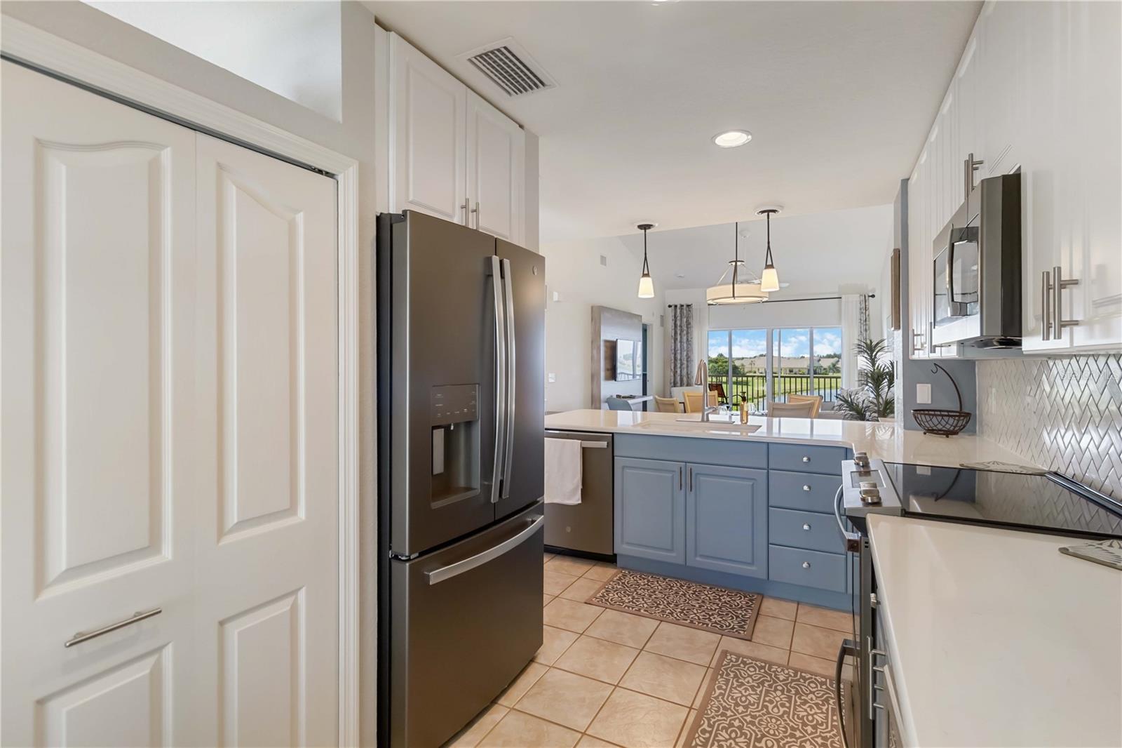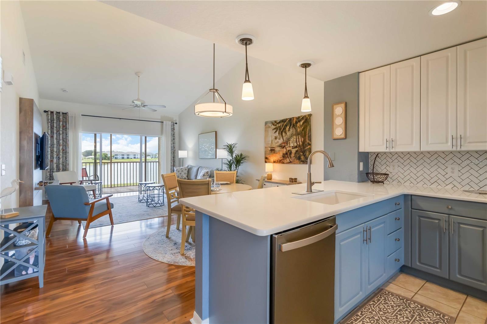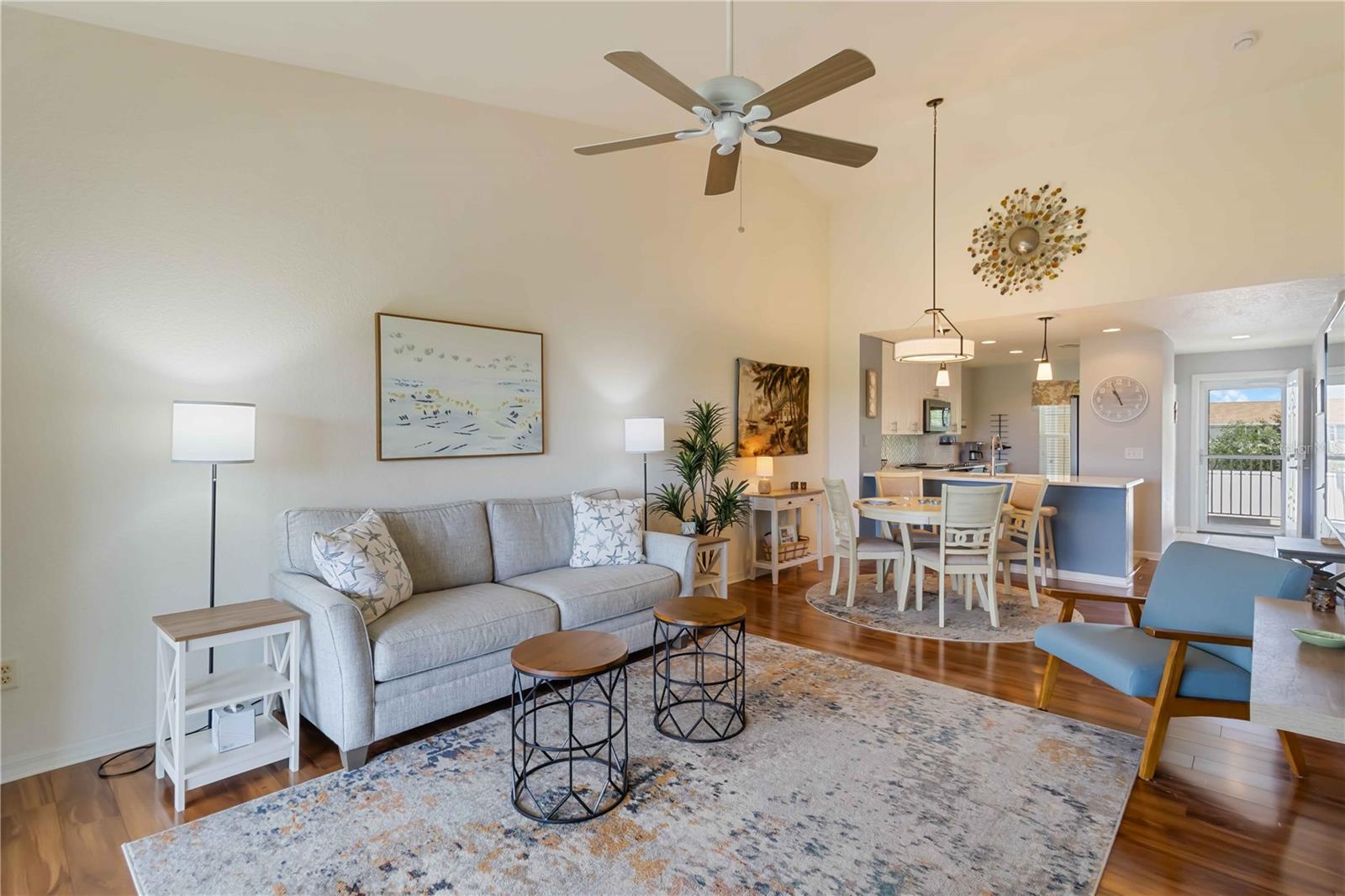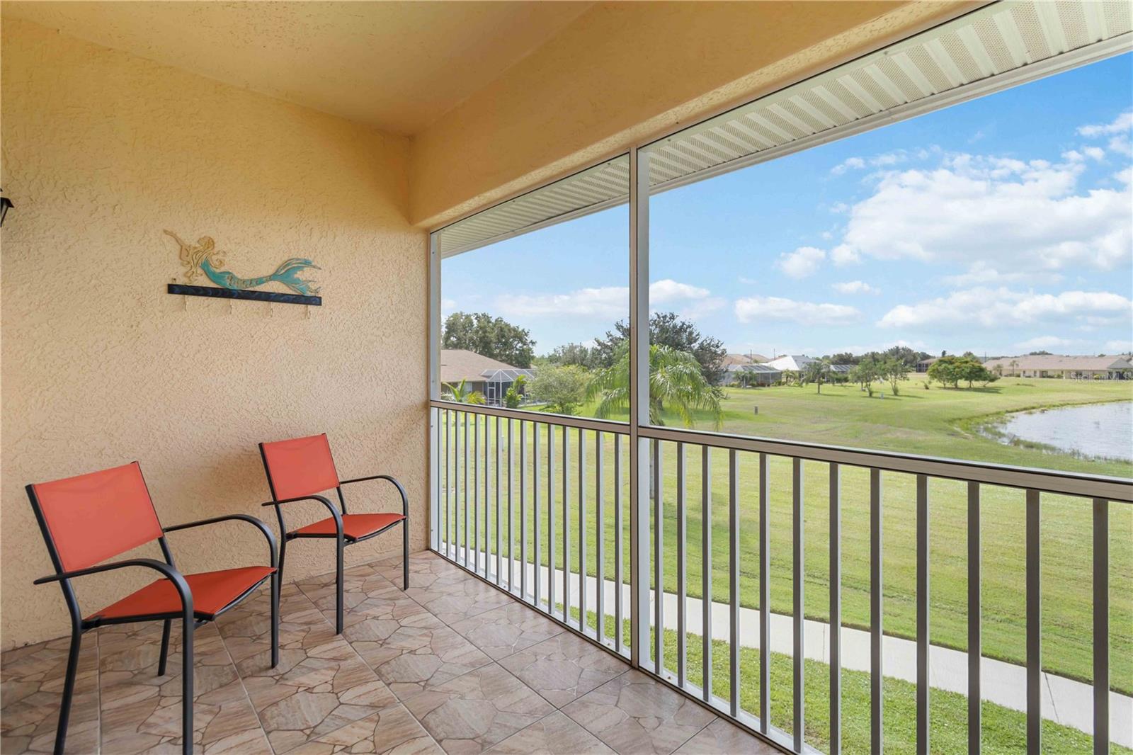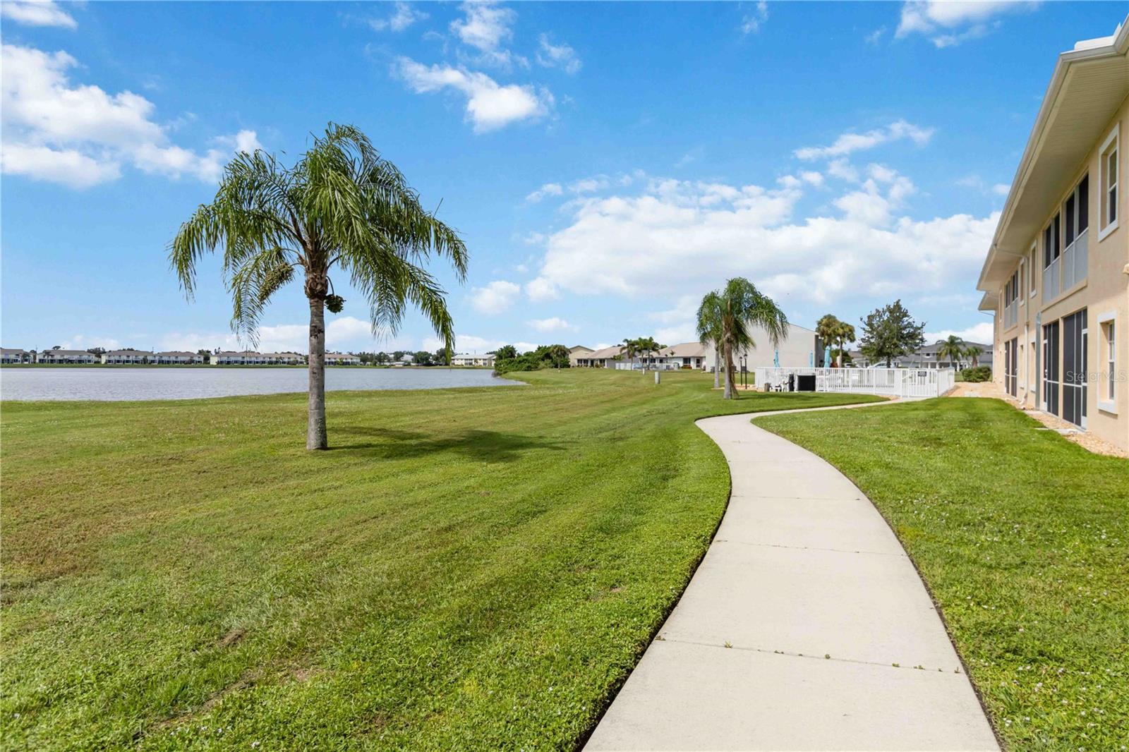 Stunning Turnkey-Furnished Second-Floor Condo in Deep Creek condo, boasting stunning views of tranquil Lake Rio! A welcoming front porch offers the perfect spot to savor your morning coffee while enjoying Florida's beautiful weather. Step inside to an inviting foyer that opens into a spacious, open-concept home. The kitchen features newly remodeled counters, back splash, and additional cabinetry, wine fridge, and counter space. The home also features recessed lighting, and a living room with expansive, breathtaking lake views. The combined living and dining room impresses with vaulted ceilings, wood laminate floors, and sliding glass doors that lead to the screened-in lanai, flooding the home with natural light. The primary suite offers serene lake views, a walk-in closet plus a second closet for extra storage, and an en-suite bathroom with a tiled shower and separate linen closet. The private guest quarters include a comfortable bedroom and full bath, ensuring visitors feel right at home. Sliding glass doors lead to the screened lanai, where you can enjoy spectacular lake sunrise and sunset views--ideal for outdoor dining. Additional features include an interior laundry closet, outdoor storage closet, covered assigned parking, and a community pool just steps from your lanai. Situated on a quiet road across from Deep Creek Golf Club, this condo offers low-maintenance living with monthly fees covering exterior building and grounds maintenance, insurance, and pool care. Perfectly located near I-75, restaurants, shopping, boating, and all the amenities of the deed-restricted Deep Creek community, and just minutes from downtown historic Punta Gorda, Sunseeker Resort, and beautiful waterfront parks. This lakefront retreat is ready for you to enjoy the best of the Florida lifestyle!