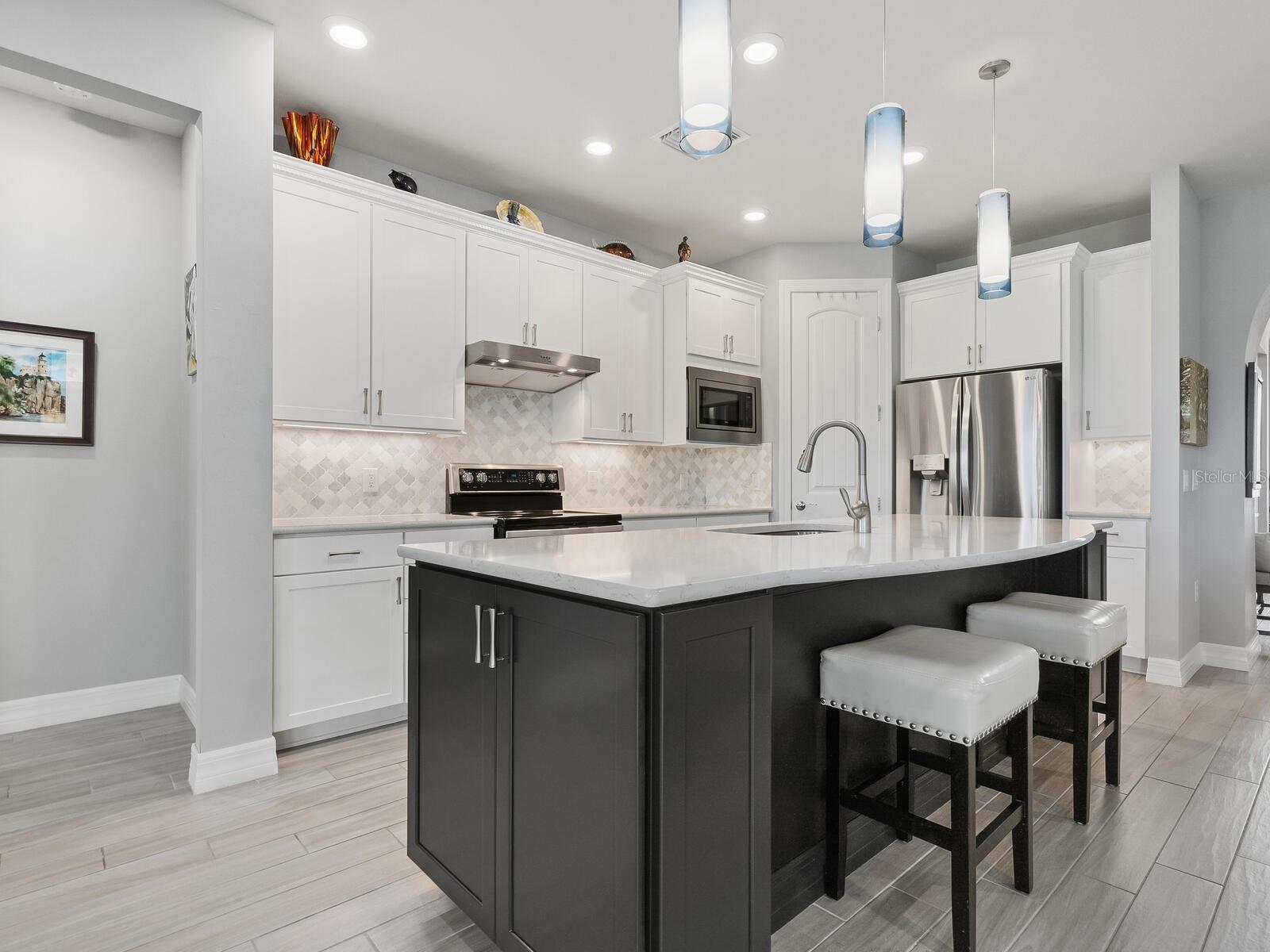 Experience easy, modern living and beautiful lake views in this beautiful Summerwood home. Thoughtfully designed for seamless indoor-outdoor living, this residence features corner sliding doors, porcelain plank tile flooring, quartz countertops, plantation shutters, modern lighting and fans, and customized closets. A welcoming foyer with a lead-glass door and key code lock sets the tone, while the den with French doors offers the perfect spot for a private home office or additional guest space. The bright, open kitchen has a walk-in pantry, stainless steel appliances--including a convection oven and contemporary range hood--and plenty of prep space for the home chef. Your primary suite has a lake view, huge customized walk-in closet, and luxurious ensuite bathroom with separate WC and spacious shower with shower bench. The guest bedroom and bath are thoughtfully positioned to provide comfort and privacy. The spacious laundry room offers ample built-in shelving for storage. The air-conditioned, oversized two-car garage includes a tandem area, ideal for a golf cart, workshop, or hobby space, plus durable epoxy floor coating and insulated garage door. Additional home upgrades include motorized shades for the living room's upper windows and a retractable screen door, perfect for letting in cool breezes. Paver enhancements extend across the lanai and widened driveway, adding curb appeal and functionality. Perfectly positioned on a corner lot with northern-western lanai exposure, this home provides sparkling water views and the pleasure of sunset skies. Resort-style living is part of everyday life in Islandwalk. This vibrant community offers a wealth of amenities, including geothermal pools, Har-Tru tennis courts, pickleball, bocce ball, lap pools, spas, a playground, basketball court, dog park, two state-of-the-art fitness centers, 24-hour staffed gatehouse, on-site HOA staff seven days a week, a BBQ pavilion, library, and much more for you and your guests to enjoy. Residents also have exclusive access through a private back gate to Downtown Wellen Park, home to a Publix-anchored Marketplace, Atlanta Braves ballpark, restaurants, and entertainment. Conveniently located just a few miles from I-75, this home offers easy access to Gulf Coast beaches, airports, Sarasota, and a short drive to historic Venice Island. Some furniture for sale under separate contract.