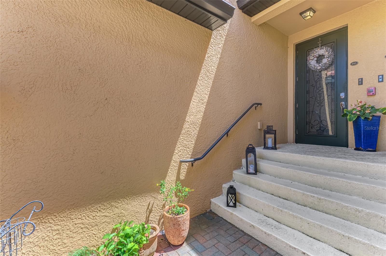 Exterior: Lighting, Rain Gutters, Sidewalk, Sliding Doors