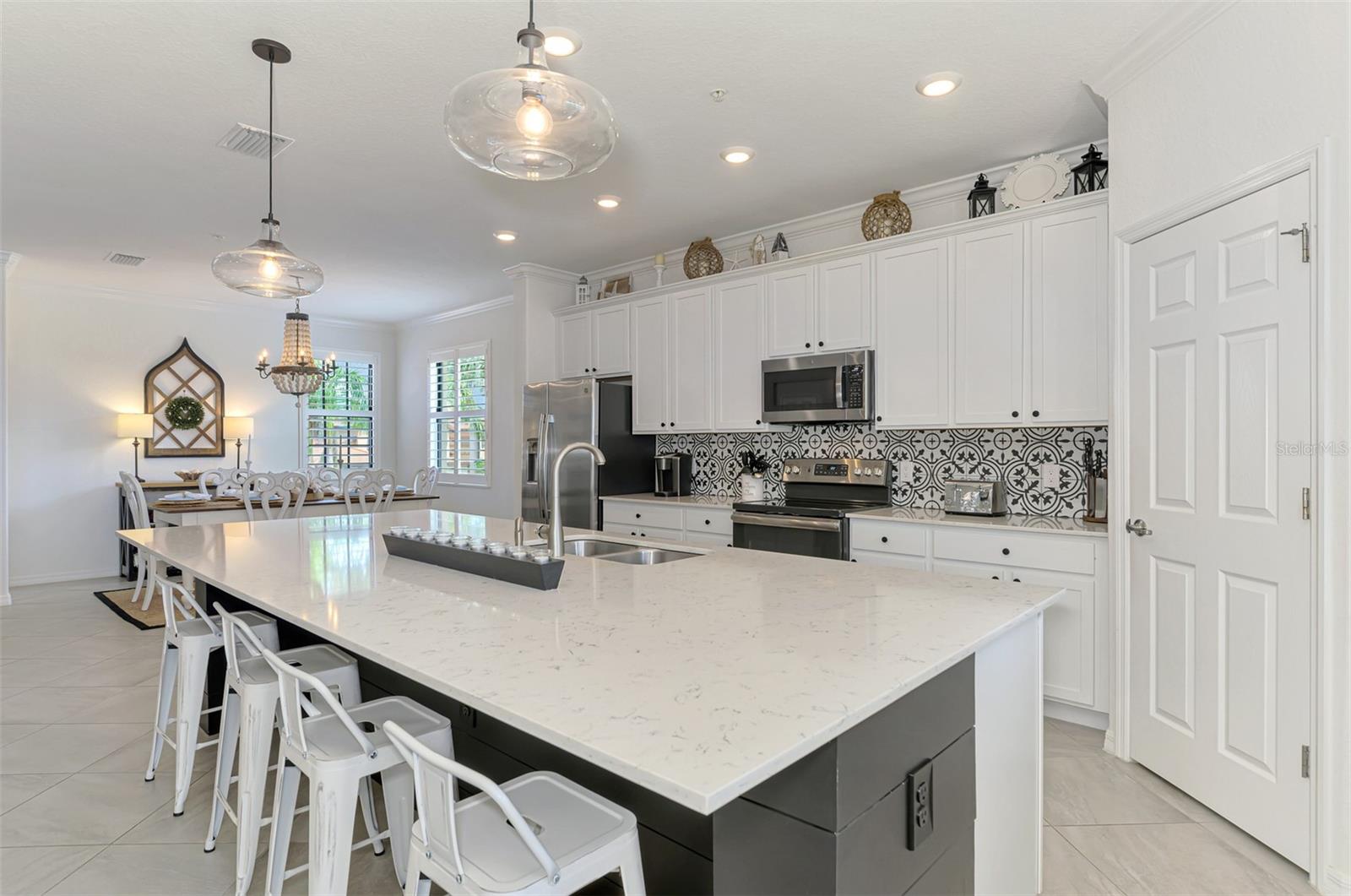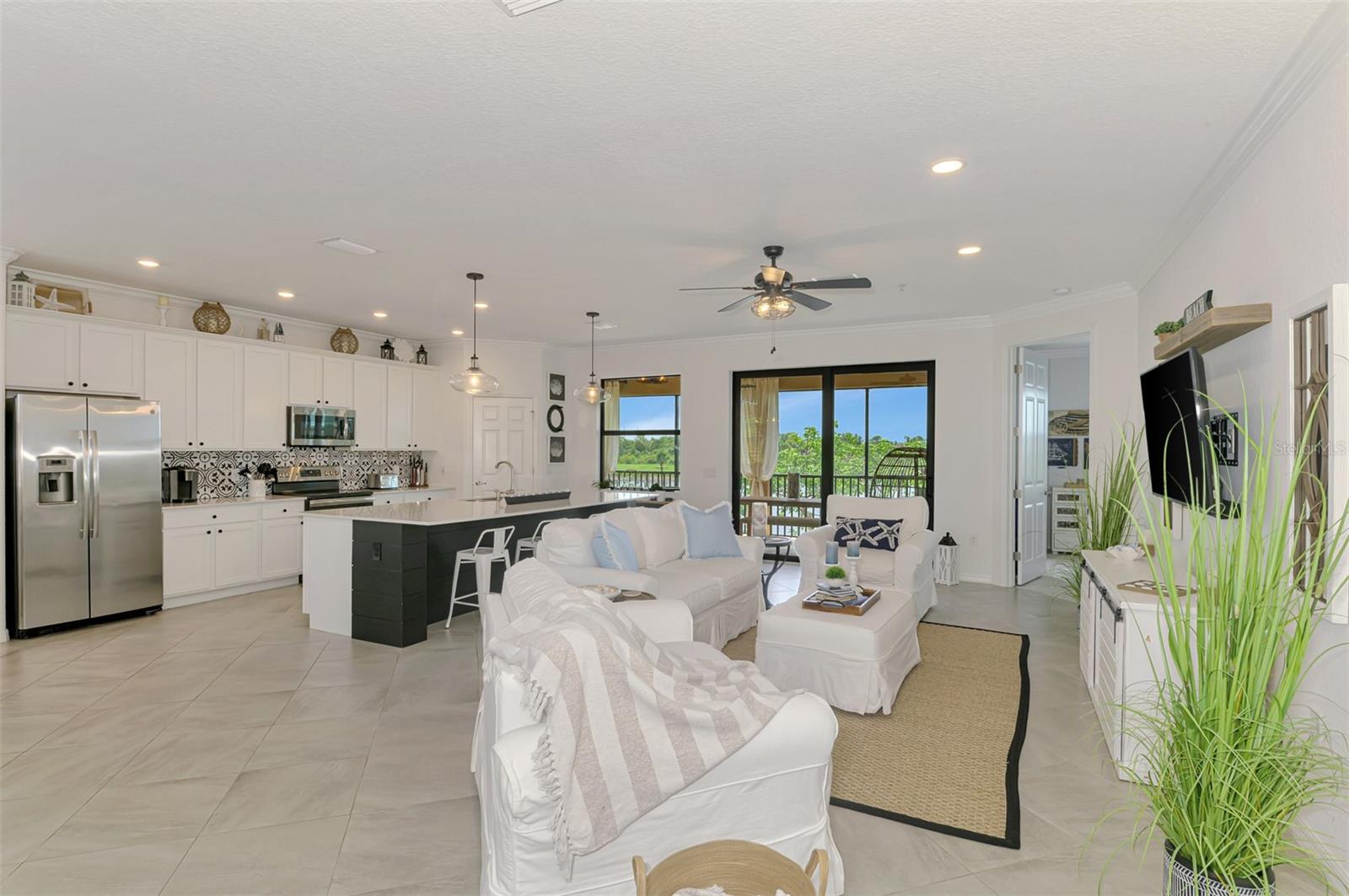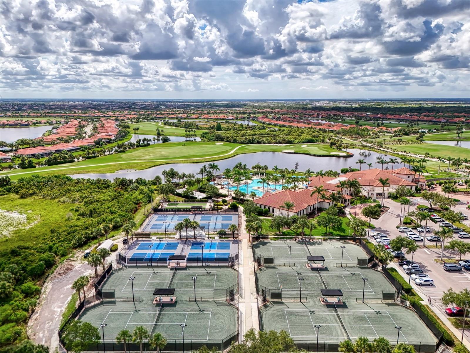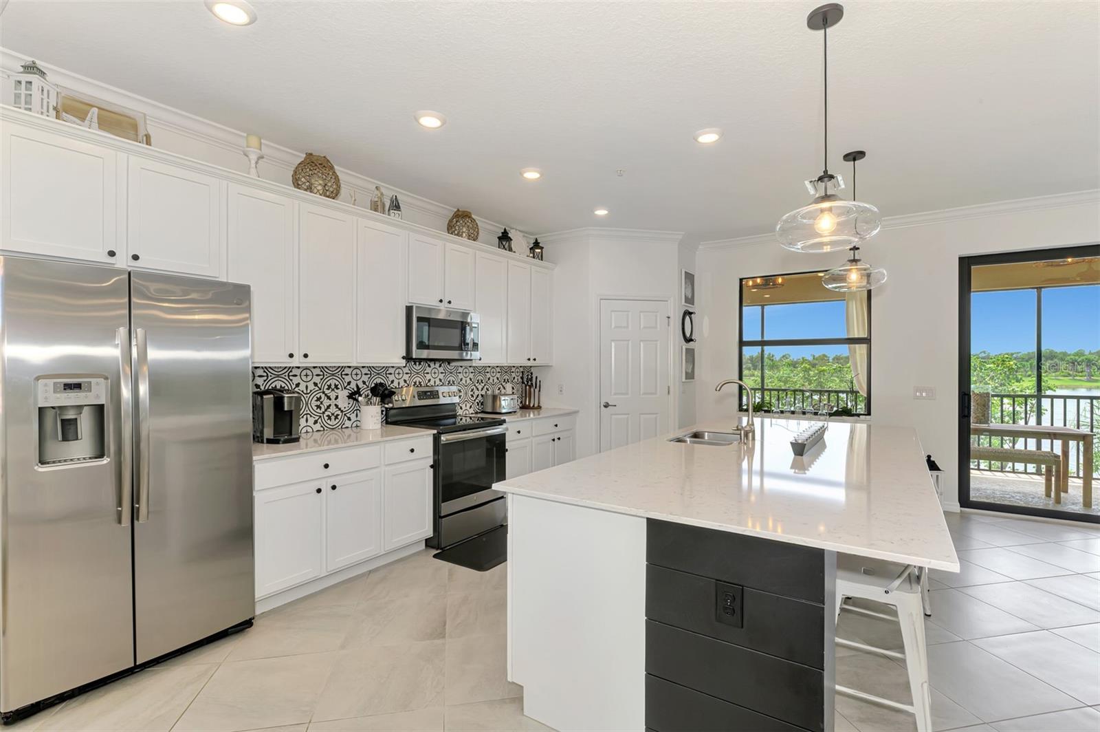 Now is your chance to own this lavishly upgraded TOP FLOOR END UNIT condo, located in the highly sought after guard gated golf community of Sarasota National. Enjoy SOUTH FACING water and preserve views right from the comfort of your oversized screened lanai. HURRICANE IMPACT GLASS throughout! Step through the front door to find an impressive 2-story foyer entrance that was re-imagined with custom installed stair treads with matching banister and a decorative tile landing. Once upstairs you will appreciate a large open floor plan that was made for entertaining. Impress your guests with the thoughtfully designed wine bar with hand crafted wood top and sleek floating shelves. The kitchen showcases an designer backsplash, an oversized island outfitted with decorative woodwork, and tasteful quartz countertops. There is a large pantry with custom shelving system, and the cook of the family will enjoy a sleek stainless steel appliance package. The large living room is a great space to gather with friends or to relax and unwind after an enjoyable day on the golf course. Enjoy spectacular water views from every angle as you move through the home. Other upgrades include tile on the diagonal in the main living areas, crown moldings, plantation shutters, and designer light fixtures and fans. The primary suite offers ample space with extra room to create a home office or sitting area. A set of sliders lead out to the lanai, and a large window allows you to enjoy the stunning view right from the comfort of your bed. 2 walk-in closets with custom closet systems provide impressive organization. The en suite bathroom showcases dual vanities with extra storage, an oversized walk-in shower with seamless glass enclosure, and a private water closet. On the opposite side of the condo, you will find 2 additional bedrooms equal in size, both offering generous walk-in closets. A second full bathroom is just off the two extra bedrooms and features a tub/shower combo. It is easy to create privacy for guests from the main living space by closing the hallway privacy door. There is an in-unit laundry room with an upgraded stackable washer and dryer, freeing up space for more storage. Also included is a large 2 car garage with a 3rd tandem space to create a workshop, home gym, or to store your toys. This building is completely maintenance free and includes all landscaping maintenance, pest control, cable tv, water, sewer, and trash pick-up. Your monthly HOA fee also includes 2 GOLF MEMBERSHIPS that require no extra buy-in fee! This condo is perfect to use as a full-time residence, a part-time seasonal home, or even a great investment... one that will generate substantial rental income! Live like you are on a 5-star vacation with a 30,000sf clubhouse with resort style pool, hot tub, outdoor tiki bar serving food and drinks daily, a coffee house, fine dining restaurant, 7,000sf fitness center with top-of-the-line equipment and classes, day spa, card room, bocce ball, pickle ball, tennis, dog park, playground, event lawn, and 18-hole championship golf course. Sarasota National is a guard gated 2400-acre International Audubon Bird Sanctuary that offers some of the most beautiful water and preserve views in all of Venice. This home is just minutes to the Atlanta Brave's spring training camp at the CoolToday Park Stadium, as well as the town center of Wellen Park. Explore 3 local beaches and historic downtown Venice, all less than 15 minutes from your front door!
