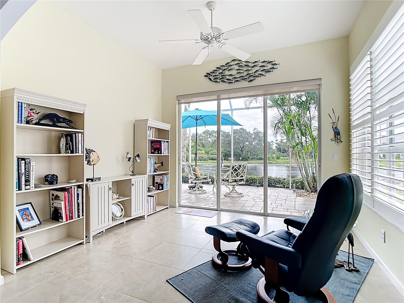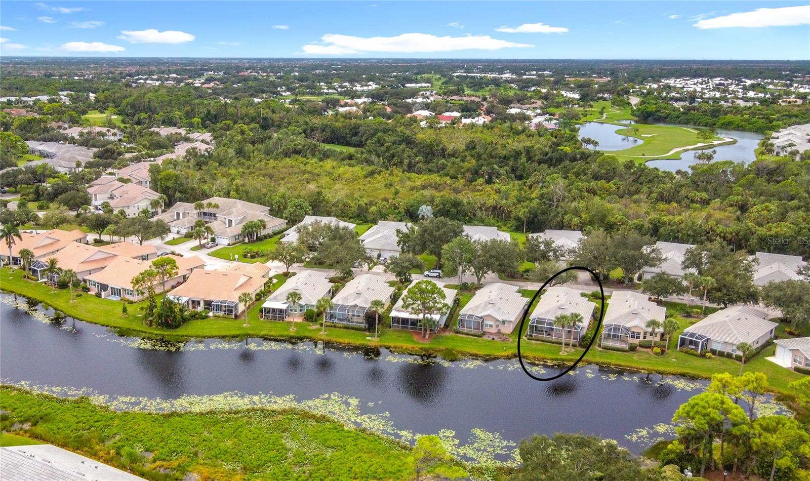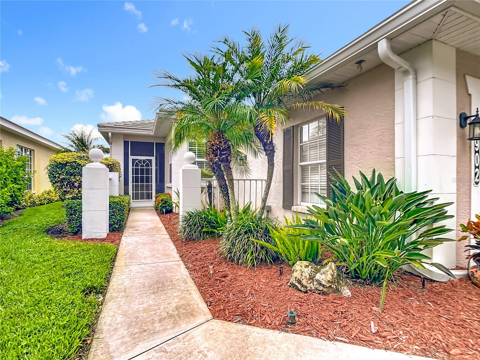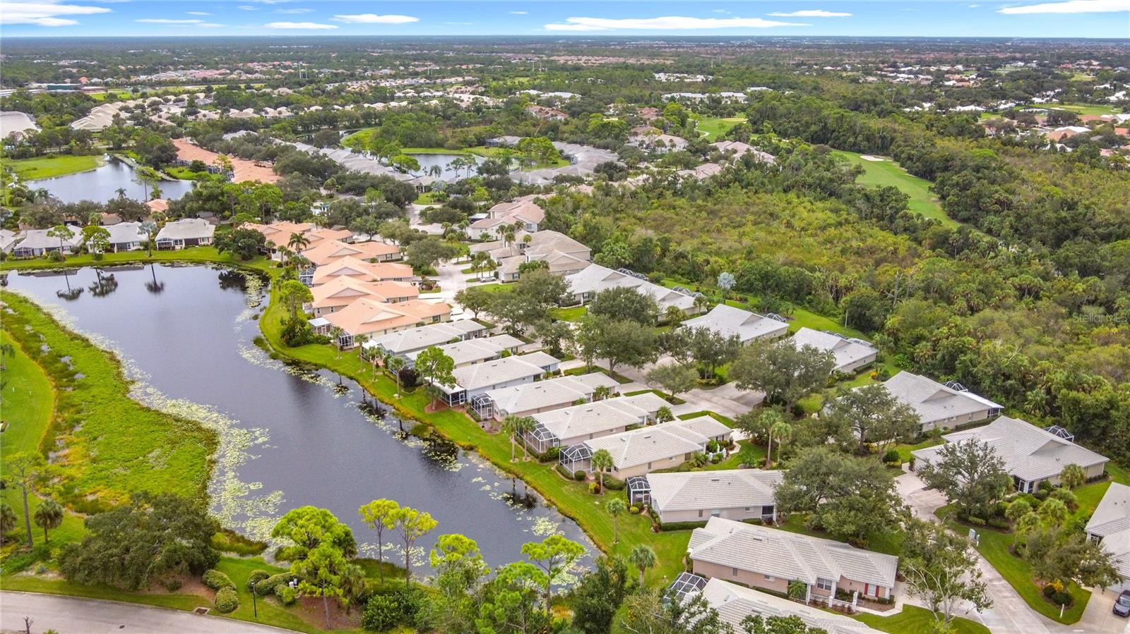 SWEEPING WATER VIEWS IN PLANTATION GOLF & COUNTRY CLUB! Experience the 'best of both worlds' - carefree condo living with the feel of a single-family home. This elegant 3 bedroom, 2.5 bathroom, 2 car garage detached villa offers nearly 2,000 sq. ft. of light-filled living space with lakefront views, high ceilings, crown molding, plantation shutters AND MORE! Recent improvements include a NEW ROOF (2023), NEW AC (2023), NEW HOT WATER TANK (2025), and wood-look flooring in bedrooms for easy care (no carpet here!). This home is a storage lover's dream, featuring a spacious hall closet, LARGE WALK-IN CLOSETS in both the primary and guest bedroom, linen closets in both bathrooms, cabinetry in laundry room, and a generous kitchen pantry to keep everything organized. The gourmet kitchen features granite countertops, Noir stainless steel appliances, sliding cabinet shelves, breakfast bar, under-cabinet lights, and bay-window dining nook. When it's time to unwind, the spacious primary suite features a bay window with water views, soaking tub, frameless glass shower, and dual vanity. Enjoy seamless indoor-outdoor living with a screened front porch and EXTENDED REAR LANAI overlooking the serene lake, where you'll enjoy bird watching and nightly sunsets. The versatile bonus / sunroom creates the ideal spot for a craft area, music room, reading nook...the possibilities are endless. Laundry room has been thoughtfully upgraded with stylish cabinets, granite countertop and utility sink, leading to an epoxy-finished 2-car garage with convenience and style. Located in the desirable Plantation Golf & Country Club community of The Villas of St. Andrews II, this neighborhood has tree-lined streets and a majestic live oak adorned with orchids in your front yard. Residents enjoy maintenance-free living with reasonable and stable HOA fees -- all assessments have been paid, ensuring peace of mind for the future. HOA fee includes roof reserves, exterior painting (to be completed this Fall), structural insurance, lawn care, irrigation, basic cable, and community pool just a short stroll away. OPTIONAL MEMBERSHIP at Plantation Golf & Country Club is available, giving residents access to two championship 18-hole golf courses, 13 Har-Tru tennis courts, 6 pickleball courts, state-of-the-art fitness center, a Jr. Olympic pool, exceptional dining and social events. This makes Villas II perfect for those seeking an active lifestyle, social events, and luxury amenities. Just minutes to Venice beaches, Wellen Park, shopping, dining, and the Atlanta Braves stadium. Don't miss this rare opportunity for carefree lakefront living! (Disclaimer: some interior photos have been virtually staged)