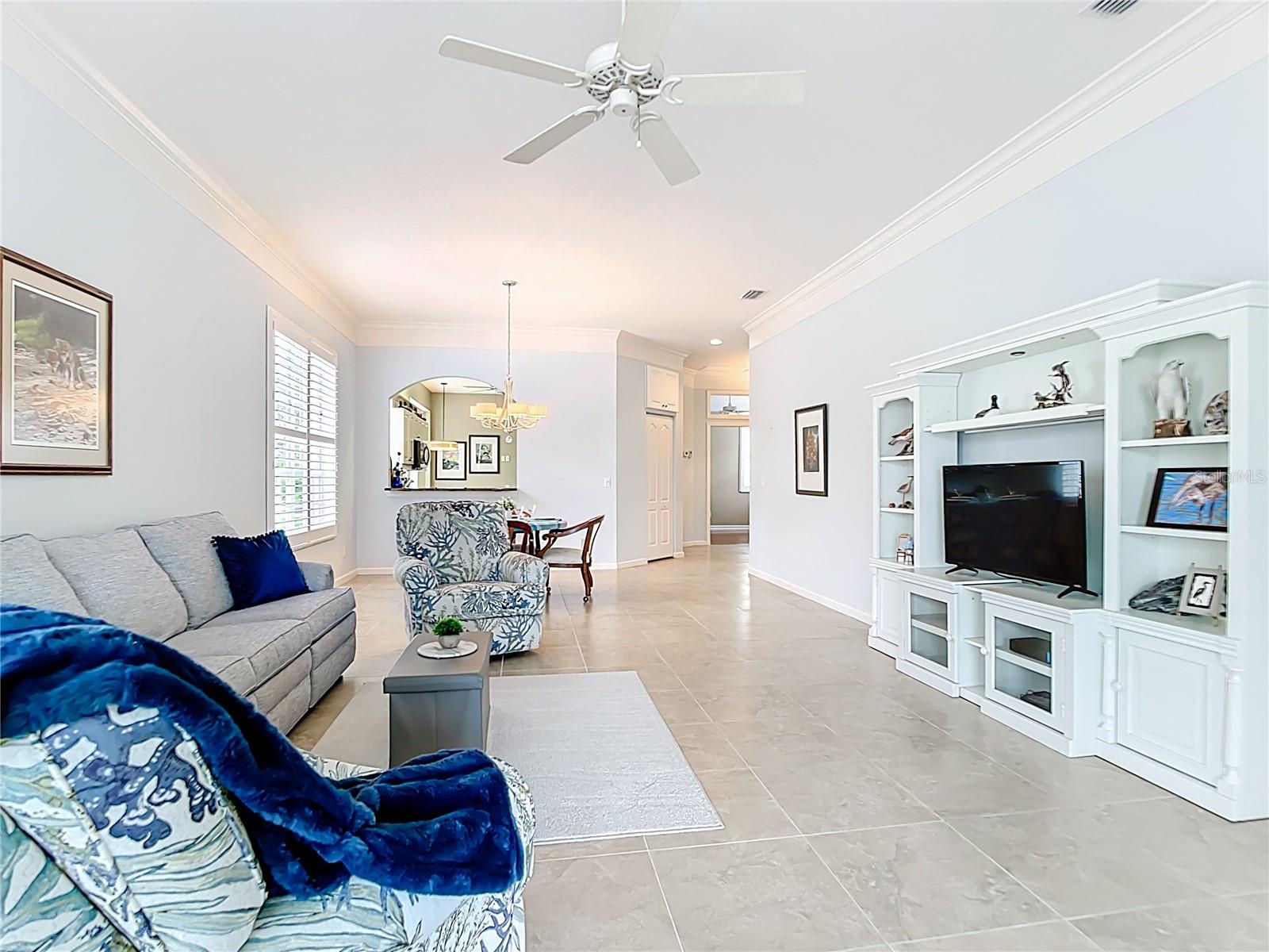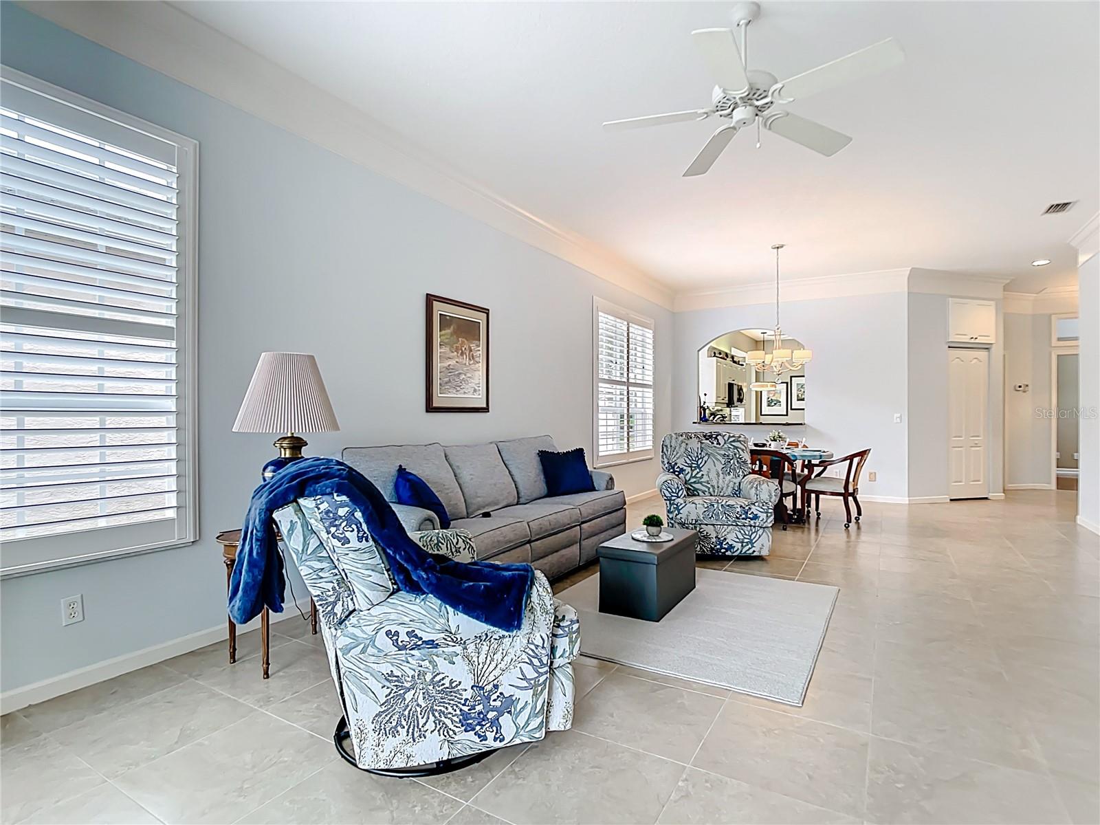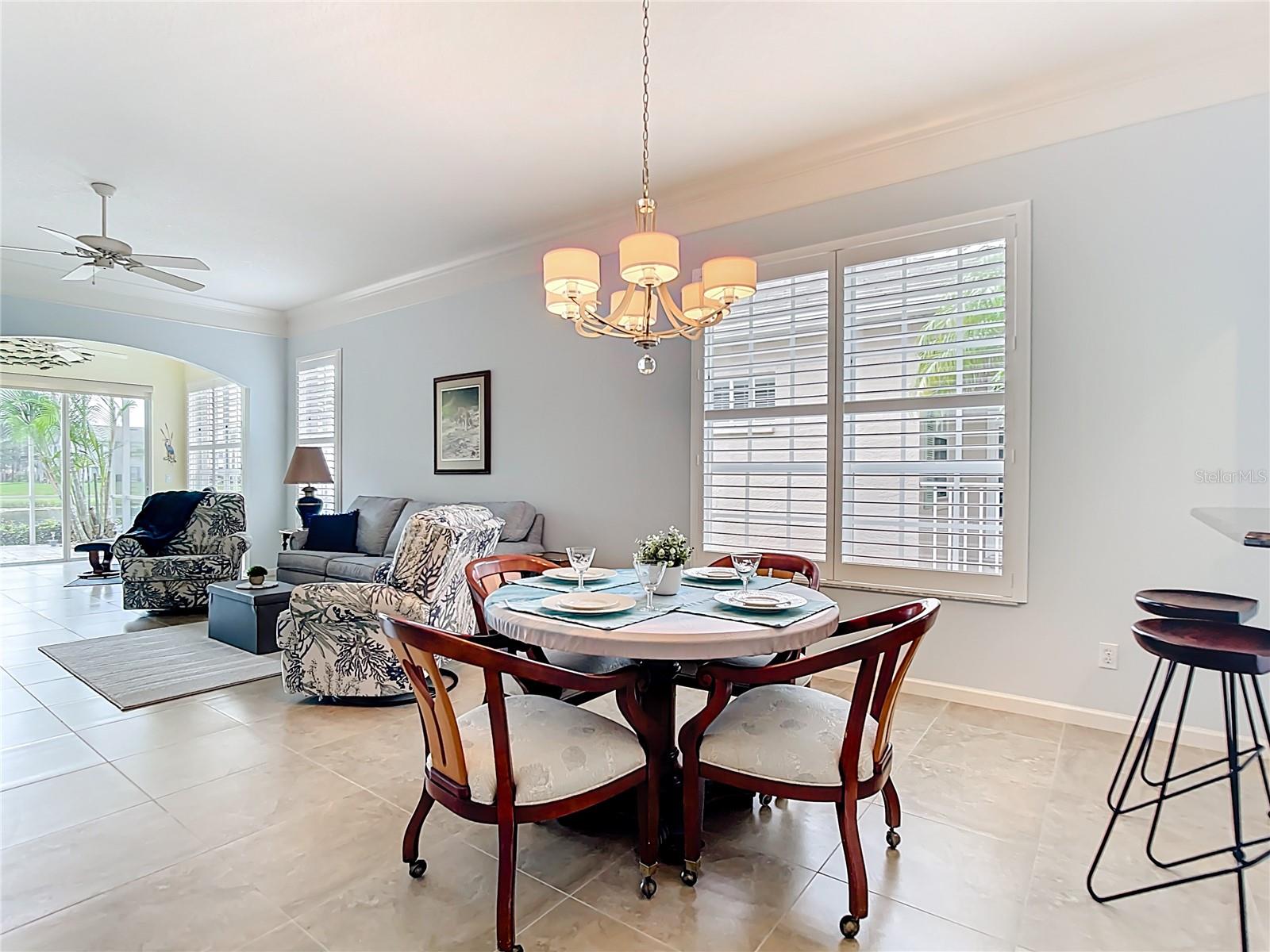 SWEEPING WATER VIEWS IN PLANTATION GOLF & COUNTRY CLUB! Experience the 'best of both worlds' - carefree condo living with the feel of a single-family home. This elegant 3 bedroom, 2.5 bathroom, 2 car garage detached villa offers nearly 2,000 sq. ft. of light-filled living space with lakefront views, high ceilings, crown molding, plantation shutters AND MORE! Recent improvements include a NEW ROOF (2023), NEW AC (2023), NEW HOT WATER TANK (2025), and wood-look flooring in bedrooms for easy care (no carpet here!). This home is a storage lover's dream, featuring a spacious hall closet, LARGE WALK-IN CLOSETS in both the primary and guest bedroom, linen closets in both bathrooms, cabinetry in laundry room, and a generous kitchen pantry to keep everything organized. The gourmet kitchen features granite countertops, Noir stainless steel appliances, sliding cabinet shelves, breakfast bar, under-cabinet lights, and bay-window dining nook. When it's time to unwind, the spacious primary suite features a bay window with water views, soaking tub, frameless glass shower, and dual vanity. Enjoy seamless indoor-outdoor living with a screened front porch and EXTENDED REAR LANAI overlooking the serene lake, where you'll enjoy bird watching and nightly sunsets. The versatile bonus / sunroom creates the ideal spot for a craft area, music room, reading nook...the possibilities are endless. Laundry room has been thoughtfully upgraded with stylish cabinets, granite countertop and utility sink, leading to an epoxy-finished 2-car garage with convenience and style. Located in the desirable Plantation Golf & Country Club community of The Villas of St. Andrews II, this neighborhood has tree-lined streets and a majestic live oak adorned with orchids in your front yard. Residents enjoy maintenance-free living with reasonable and stable HOA fees -- all assessments have been paid, ensuring peace of mind for the future. HOA fee includes roof reserves, exterior painting (to be completed this Fall), structural insurance, lawn care, irrigation, basic cable, and community pool just a short stroll away. OPTIONAL MEMBERSHIP at Plantation Golf & Country Club is available, giving residents access to two championship 18-hole golf courses, 13 Har-Tru tennis courts, 6 pickleball courts, state-of-the-art fitness center, a Jr. Olympic pool, exceptional dining and social events. This makes Villas II perfect for those seeking an active lifestyle, social events, and luxury amenities. Just minutes to Venice beaches, Wellen Park, shopping, dining, and the Atlanta Braves stadium. Don't miss this rare opportunity for carefree lakefront living! (Disclaimer: some interior photos have been virtually staged)
