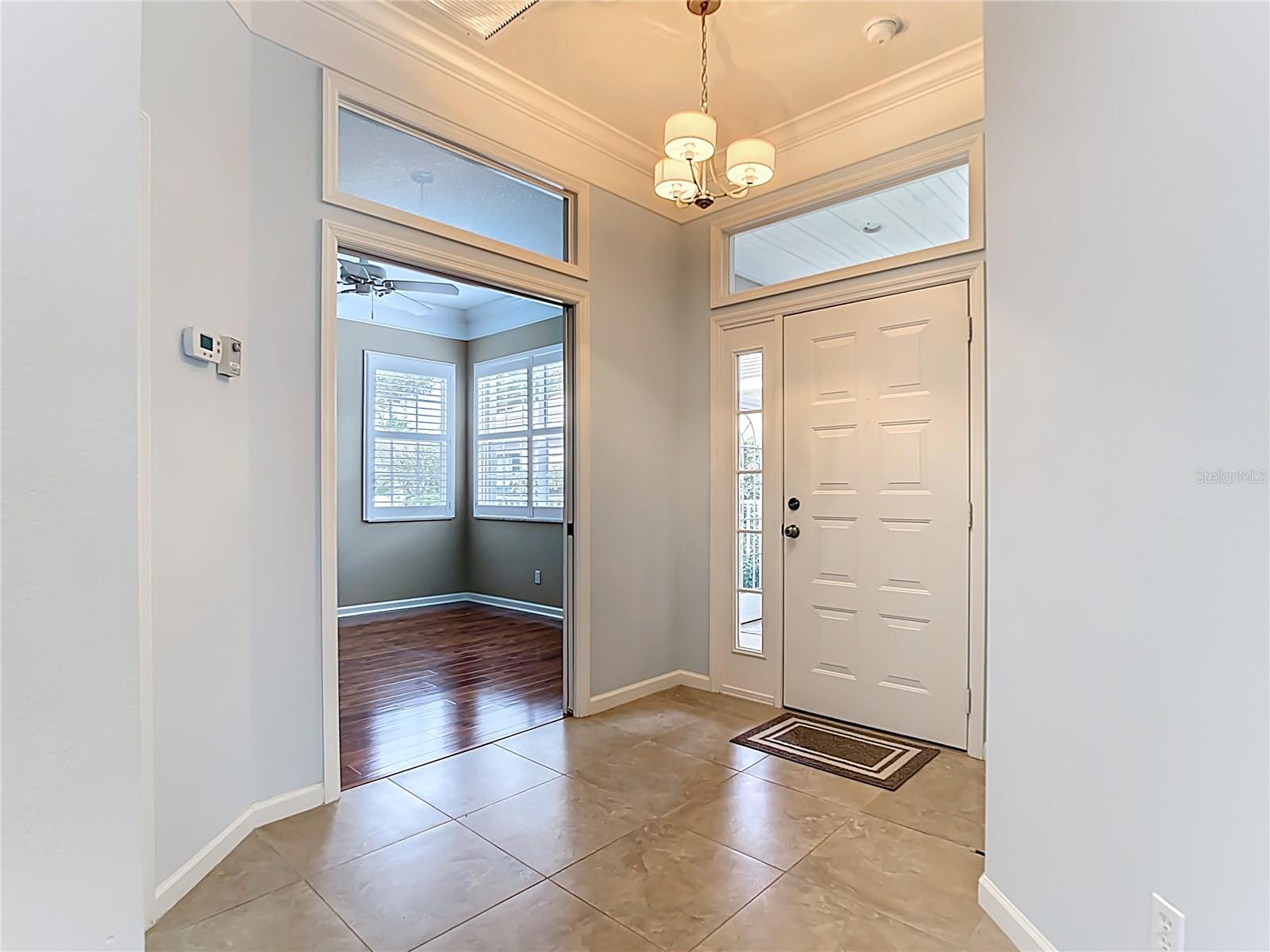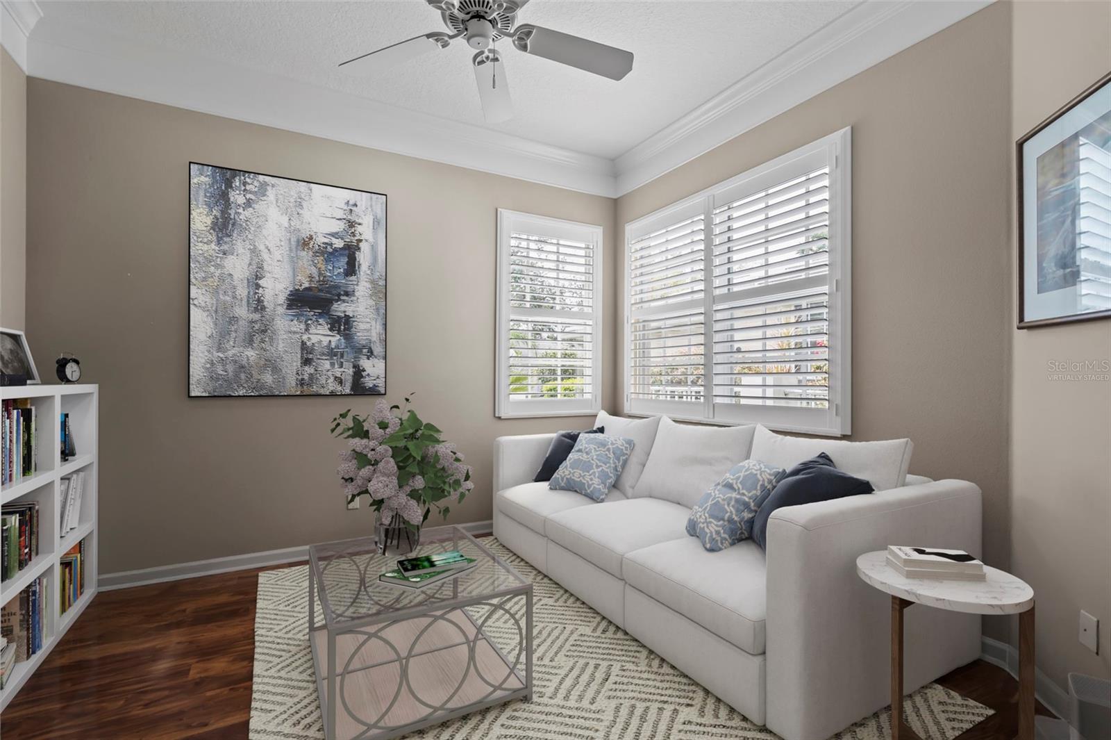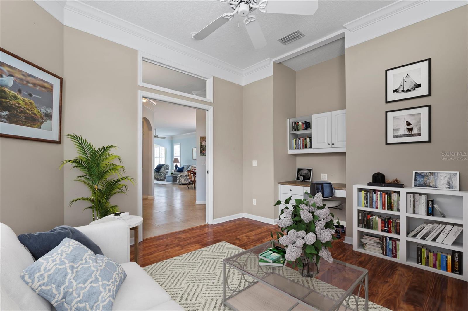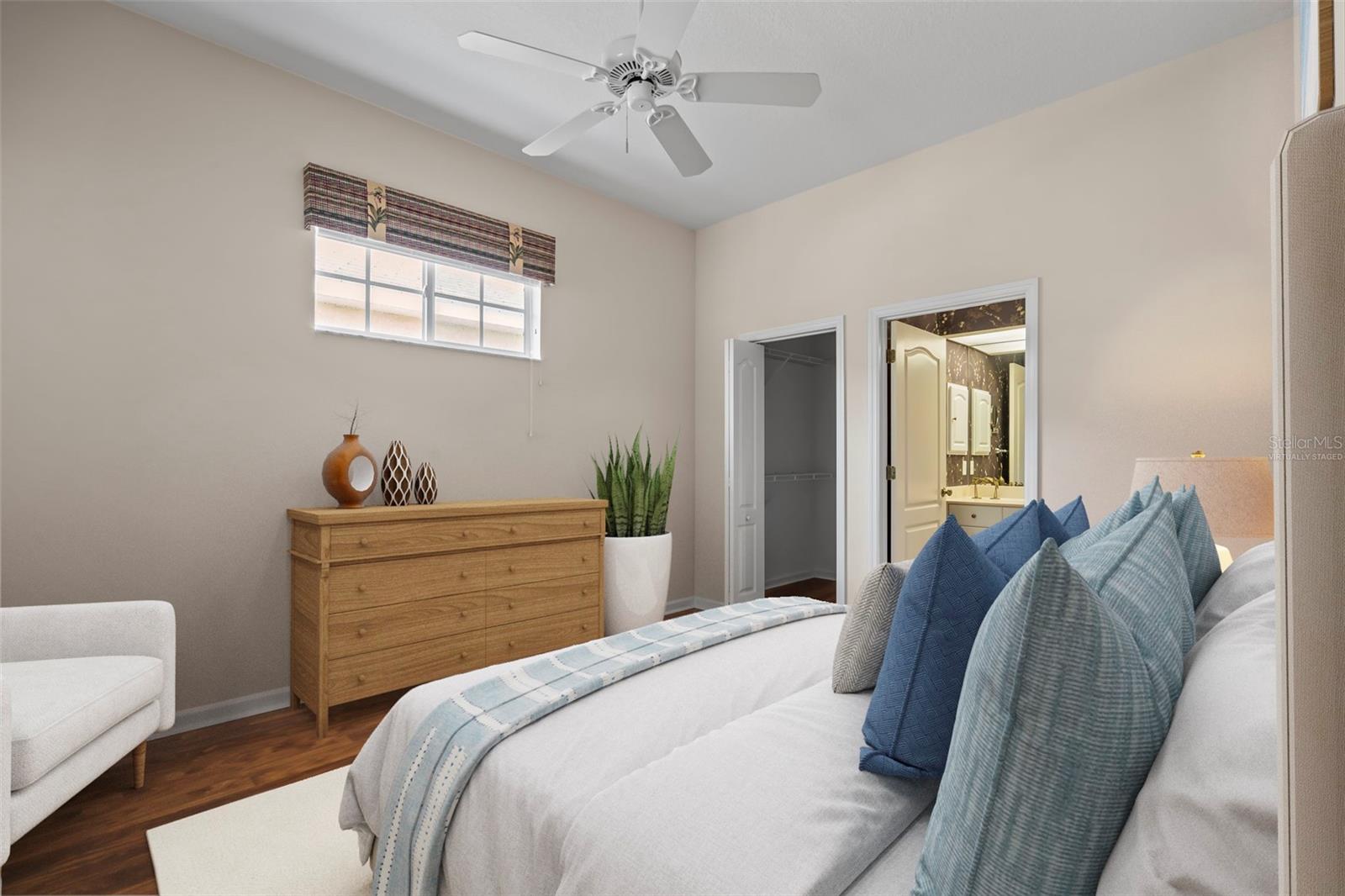 SWEEPING WATER VIEWS IN PLANTATION GOLF & COUNTRY CLUB! Experience the 'best of both worlds' - carefree condo living with the feel of a single-family home. This elegant 3 bedroom, 2.5 bathroom, 2 car garage detached villa offers nearly 2,000 sq. ft. of light-filled living space with lakefront views, high ceilings, crown molding, plantation shutters AND MORE! Recent improvements include a NEW ROOF (2023), NEW AC (2023), NEW HOT WATER TANK (2025), and wood-look flooring in bedrooms for easy care (no carpet here!). This home is a storage lover's dream, featuring a spacious hall closet, LARGE WALK-IN CLOSETS in both the primary and guest bedroom, linen closets in both bathrooms, cabinetry in laundry room, and a generous kitchen pantry to keep everything organized. The gourmet kitchen features granite countertops, Noir stainless steel appliances, sliding cabinet shelves, breakfast bar, under-cabinet lights, and bay-window dining nook. When it's time to unwind, the spacious primary suite features a bay window with water views, soaking tub, frameless glass shower, and dual vanity. Enjoy seamless indoor-outdoor living with a screened front porch and EXTENDED REAR LANAI overlooking the serene lake, where you'll enjoy bird watching and nightly sunsets. The versatile bonus / sunroom creates the ideal spot for a craft area, music room, reading nook...the possibilities are endless. Laundry room has been thoughtfully upgraded with stylish cabinets, granite countertop and utility sink, leading to an epoxy-finished 2-car garage with convenience and style. Located in the desirable Plantation Golf & Country Club community of The Villas of St. Andrews II, this neighborhood has tree-lined streets and a majestic live oak adorned with orchids in your front yard. Residents enjoy maintenance-free living with reasonable and stable HOA fees -- all assessments have been paid, ensuring peace of mind for the future. HOA fee includes roof reserves, exterior painting (to be completed this Fall), structural insurance, lawn care, irrigation, basic cable, and community pool just a short stroll away. OPTIONAL MEMBERSHIP at Plantation Golf & Country Club is available, giving residents access to two championship 18-hole golf courses, 13 Har-Tru tennis courts, 6 pickleball courts, state-of-the-art fitness center, a Jr. Olympic pool, exceptional dining and social events. This makes Villas II perfect for those seeking an active lifestyle, social events, and luxury amenities. Just minutes to Venice beaches, Wellen Park, shopping, dining, and the Atlanta Braves stadium. Don't miss this rare opportunity for carefree lakefront living! (Disclaimer: some interior photos have been virtually staged)