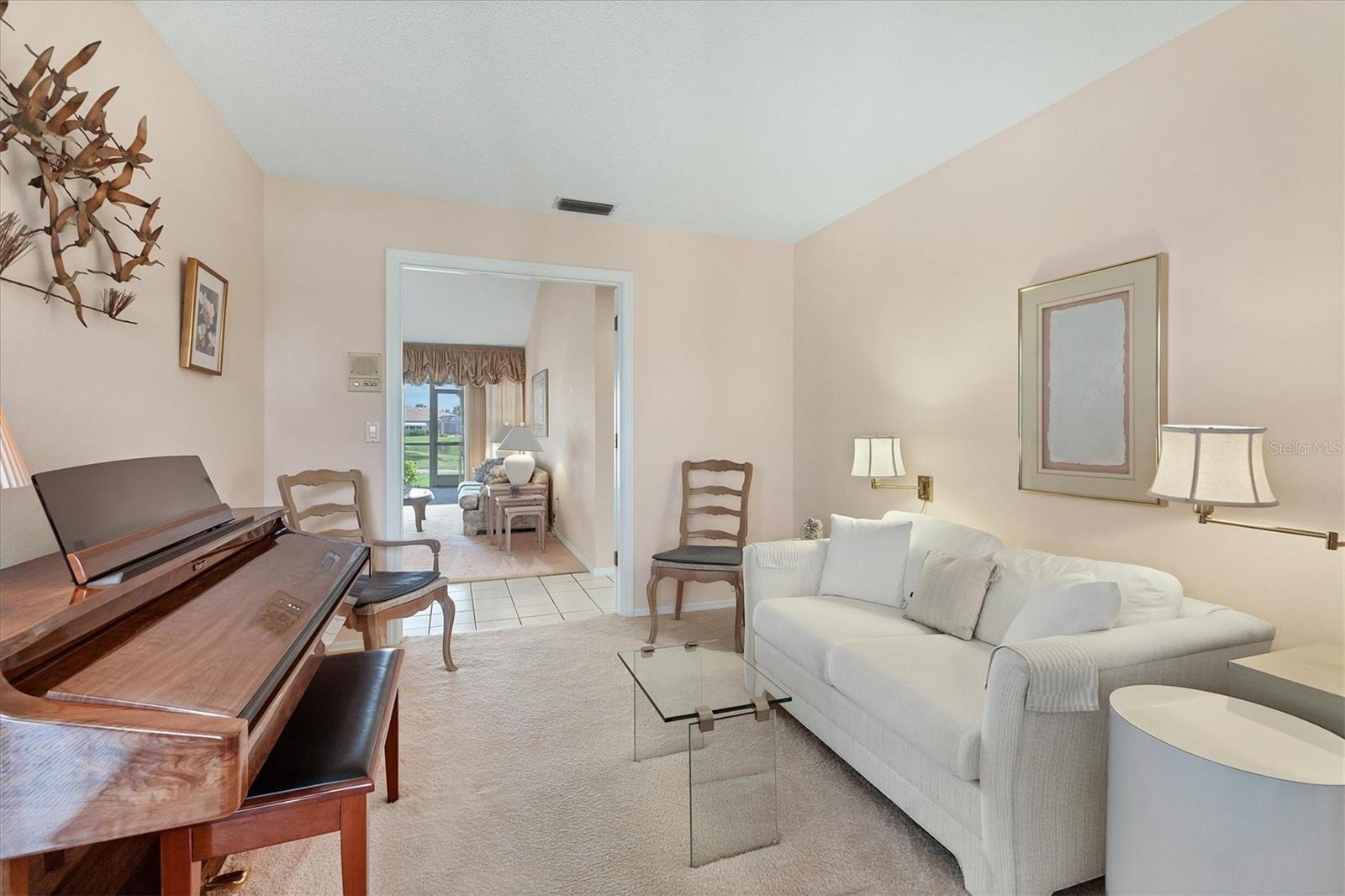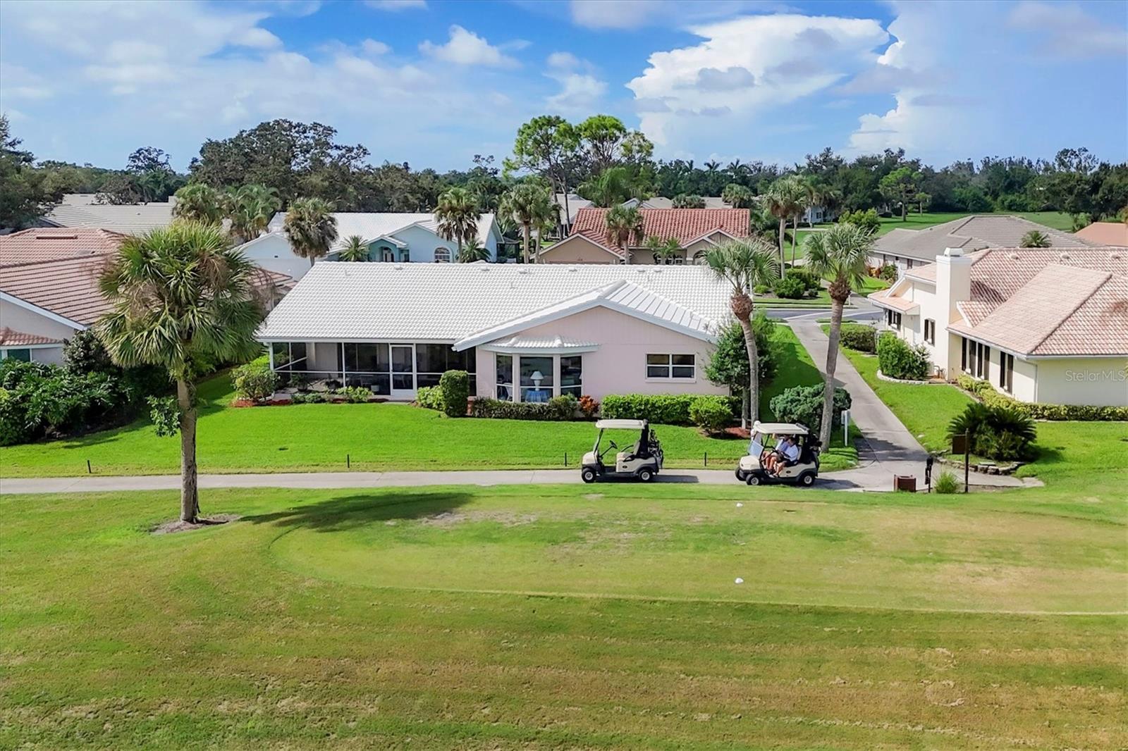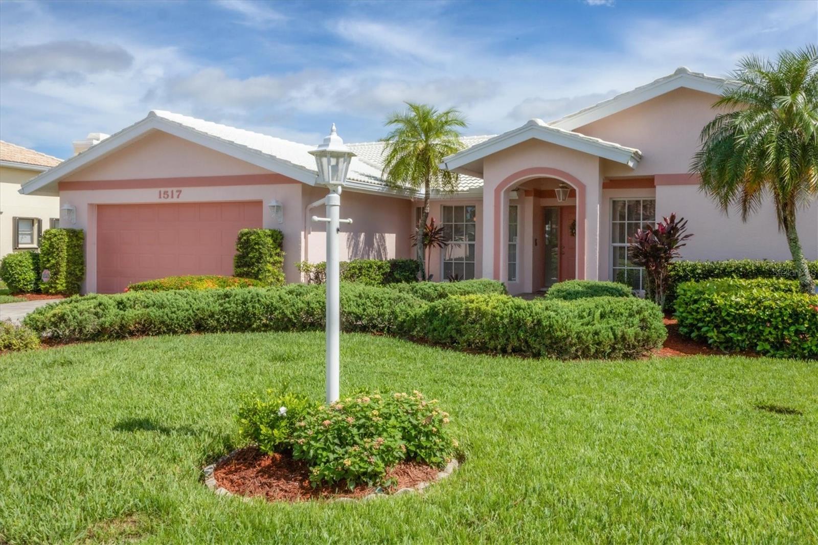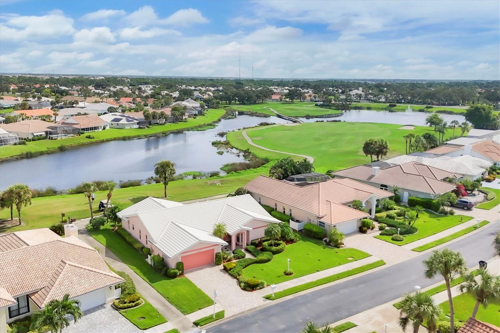 Located in Waterford, a gated, golfing, tennis community within minutes to Historical Downtown Venice, enticing beaches, Intracoastal Waterway and the Gulf of Mexico! This Golf front, lake front 4 bedroom, 2 baths, 2 car garage home is located on a "premier" lot of the "Signature Green" of the Waterford golfing community, Turnberry/Gleneagles 9! Built as a model home by Slabach Builders of Sarasota, it features multiple sliding glass doors and volume cathedral/vaulted ceilings bringing in lots of light and sunshine year around! Enter through tiled foyer, volume ceilings into this lovely split bedroom model home that shows "Pride" of ownership throughout by "original owner"! Master suite is large and accommodating with volume ceilings, walk-in closet, master bath with glassed walk-in shower and vanity Plus your own private entry/exit through sliding glass doors to lanai overlooking golf course and lake!! This split bedroom plan gives privacy for all and allows choices for uses for bedrooms. Bedroom 4 with stylish French doors is centrally located and now used as an office/music room but ready for your needs. From foyer entry, your living room is light and bright with volume ceilings and the sliding glass doors (doors pocket to wall) to lanai overlooking golf course and lake. Formal dining room with wet bar and cabinetry conveniently located adjacent to kitchen. Spacious kitchen with newer stainless appliances overlooks and joins the family room for all those nice family/friends gatherings. Breakfast bar compliments kitchen and family room, sliding glass doors provides entry/exit to lanai. Lania is spacious and open giving beautiful panoramic views of golf course and lake. Bedrooms 2 and 3 are privately located adjacent to family room near bath 2 for convenience. Inside laundry room is spacious with laundry sink, cabinets, etc., and out to 2 car garage. Garage with overhead garage door opener nicely accommodates 2 vehicles plus your other needs. Handsome paver bricks and lush landscaping compliments the driveway and walkway to front entry of your home. Waterford is a highly sought after community and does not have CDD fees. Golfing is not required but reasonable, new pickleball courts in the near future! Community has on site management, clubhouse is updated, upgraded, multiple use rooms, gym has "state of the art" equipment, bathrooms, library, Junior Olympic heated pool, spa, picnic area with grills, tables, paver brick, Har-Tru tennis courts, outdoor bathrooms and viewing deck!! New AC 2025, roof 2008, exterior paint 2025, water heater 2020, paver brick driveway, entry 2018 and more, list available!