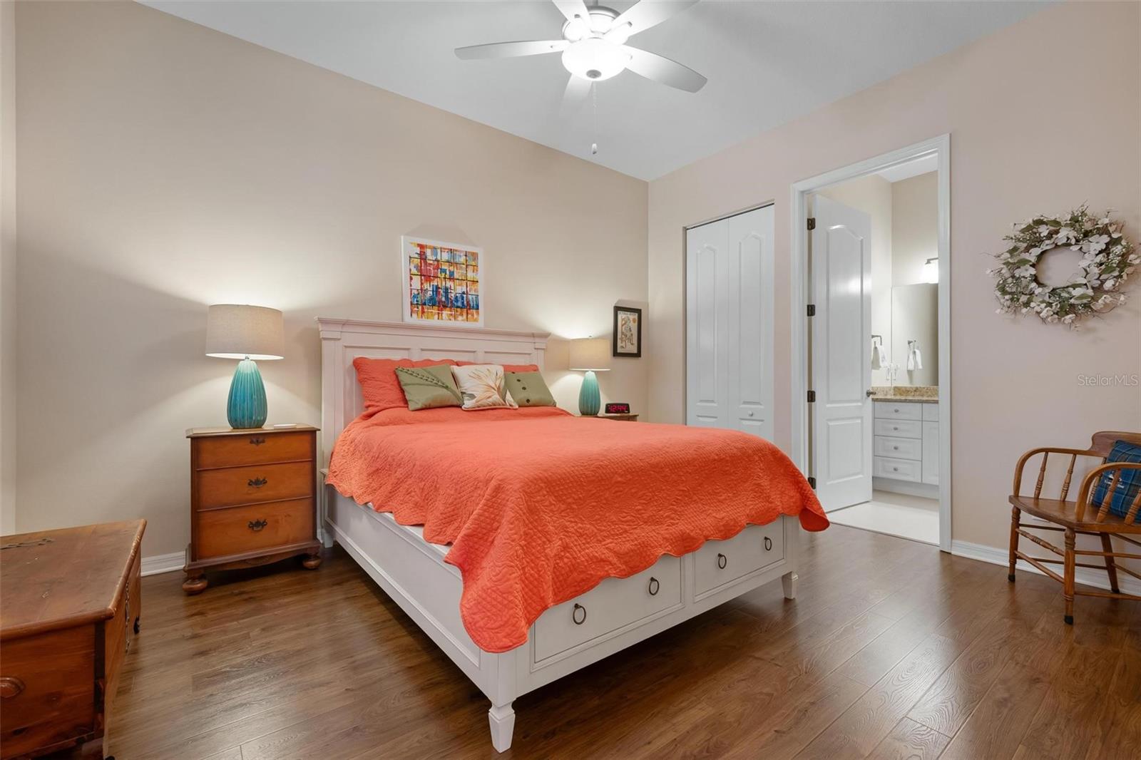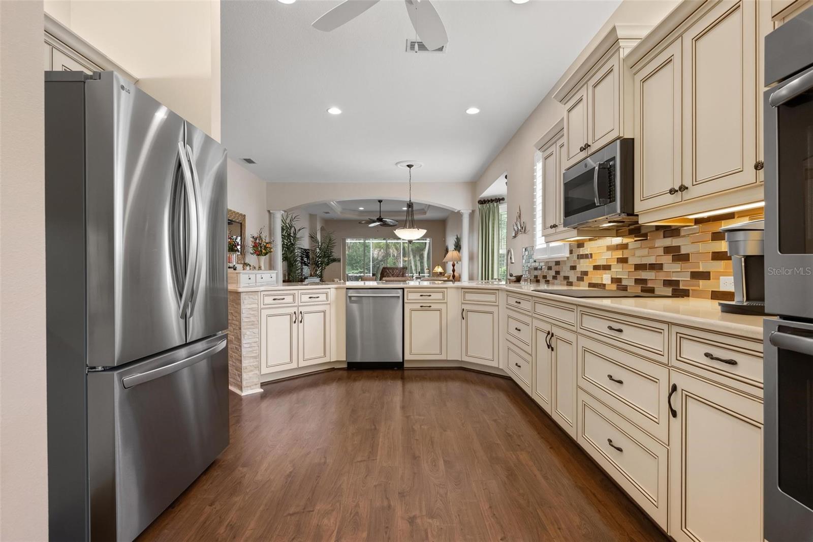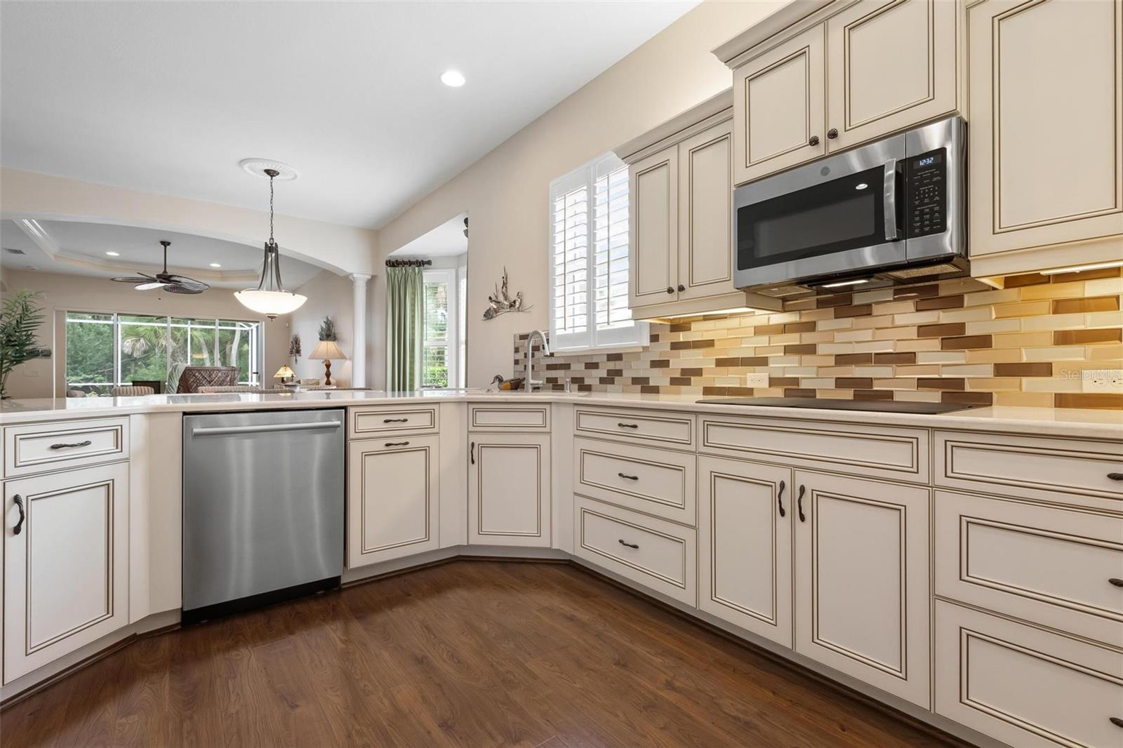 Privacy meets Convenience in this Hidden Retreat. Beautifully cared for and maintenance free, this home is ideally positioned near the end of a quiet cul-de-sac in the enclave of St. Andrews East at Plantation Golf & Country Club. Designed with a sunlit open layout and coveted southern exposure, the residence offers a seamless blend of elegance and comfort. The kitchen is a showpiece with canvas-toned cabinetry accented by cocoa highlights, quartz countertops, multiple deep drawer banks, glass tile backsplash, under-cabinet lighting, granite sink, and stainless steel appliances including a double wall oven and induction cooktop.The expansive great room impresses with a trayed ceiling, crown molding, 8-foot interior doors, and plantation shutters, all leading to a wall of sliders that open to the generous lanai and pool. A covered outdoor living area overlooks the extremely private heated saltwater pool and the lush Florida landscape beyond. The luxurious primary suite features dual walk-in closets and a spa-inspired ensuite bath with dual sinks and a curbless walk-in shower.This residence is equipped with excellent storm protection, including impact-resistant windows, accordion shutters, and a security system. Additional highlights include a finished garage, extra laundry cabinetry, and a whole-home water filtration system.For those seeking an active lifestyle, the Plantation Golf & Country Club offers two championship golf courses, pickleball, tennis, a resort pool with a cabana bar, a fitness center, and a variety of dining options, all supported by a vibrant social calendar. Optional memberships are available. Conveniently located just 15 minutes from Gulf beaches, historic downtown Venice, downtown Wellen Park, and abundant shopping and dining, this home perfectly combines privacy, style, and convenience.