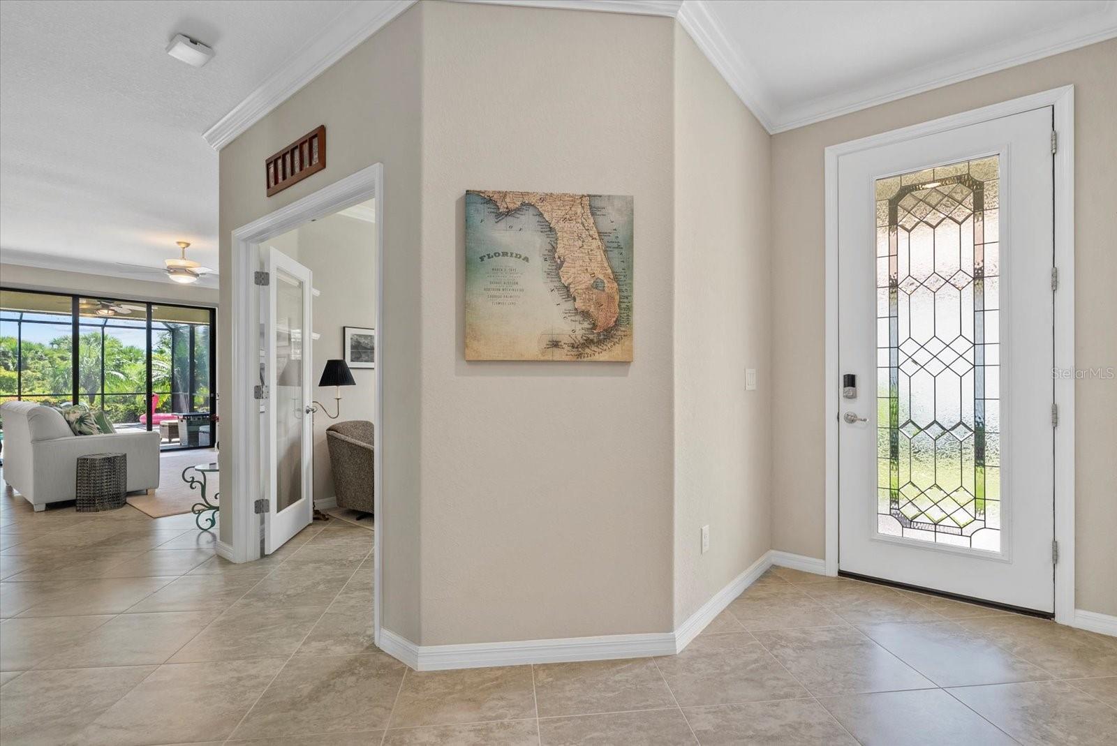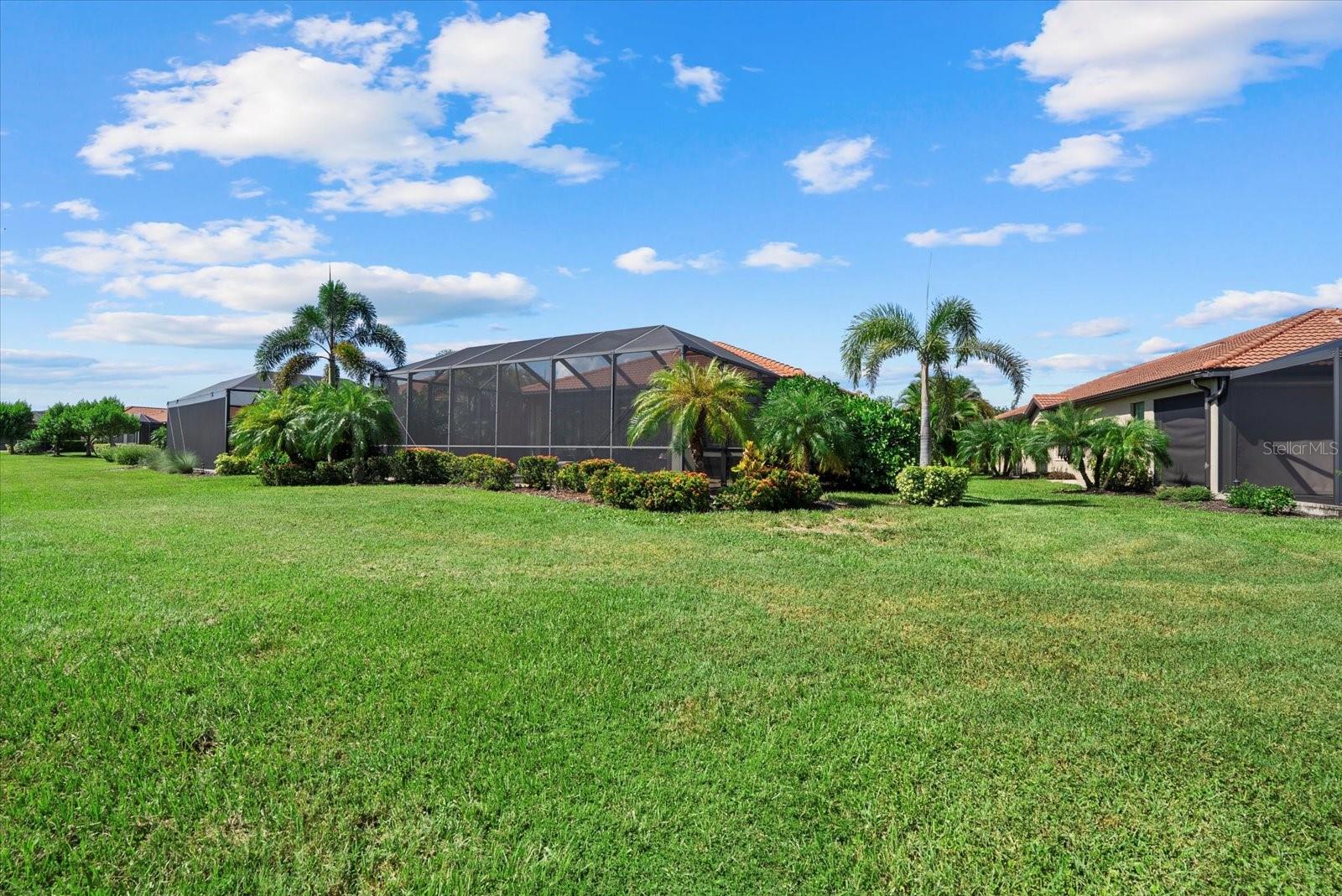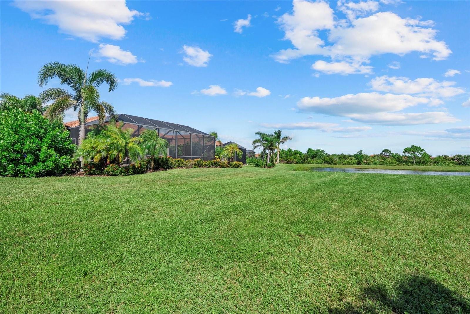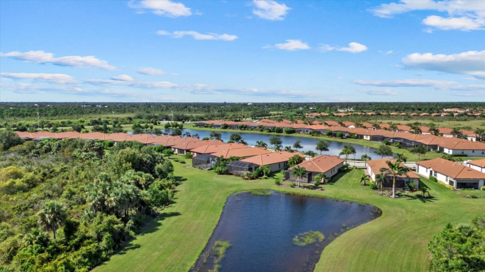 HEATED SALTWATER POOL! WATER VIEWS! HURRICANE PROTECTION! PRIVATE LANAI! Welcome to your own private slice of paradise in the guard gated community of Sarasota National. This meticulously maintained 2 bedroom, 2 bathroom home with a private office/den and 2 car garage was built in 2019 and is situated on a premium lot. This property offers WATER VIEWS in the front and in the back, with no neighbors directly behind, with an expansive green space for an unmatched sense of privacy. From the moment you arrive, you'll notice the lush landscaping, peaceful setting from the front porch, and welcoming curb appeal. Step inside to a bright, open-concept floor plan featuring ceramic tile floors, crown molding, plantation shutters, and granite countertops throughout. The spacious great room blends seamlessly with the kitchen and dining area, making it perfect for both everyday living and entertaining. The entertainer's kitchen is equipped with stainless steel appliances, a large center island with room for barstool seating, a corner walk-in pantry, granite countertops, and plentiful cabinetry complete with pull-out shelving. The adjacent dining area is ideally positioned for meals overlooking the pool and lake, while the living room opens through sliding glass doors to your lanai for the perfect indoor-outdoor Florida lifestyle. The spacious primary bedroom offers a custom designed walk-in closet with an en-suite bath featuring dual sinks with granite counters, a spacious walk-in shower, a separate water closet, and a linen closet for extra storage. Guests will enjoy their own private wing with a generously sized bedroom, full bath with tub/shower combo, granite vanity, and convenient hallway linen closet. A large interior laundry room provides abundant cabinetry, granite counter utility sink -- making laundry day a breeze. Outside, the screened-in lanai is a showstopper, offering both a covered seating area and sunny pool deck, finished in elegant pavers. Enjoy the evening sunsets with the southwesterly facing lanai! The heated saltwater pool is perfect for year-round enjoyment which features a durable Pebbletec finish. The motorized Storm Smart hurricane protection screens allow you to control airflow and privacy, while the surrounding landscaping creates a lush and tranquil backdrop loaded with privacy. You'll love sitting outside and soaking up the sweeping lake views and the open green space beyond -- the setting feels like a private resort. Additional highlights include accordion hurricane shutters, a retractable screen on the front door and outdoor solar lighting along the front and the back of the home. Living in Sarasota National means enjoying resort-style amenities including a clubhouse with indoor dining, resort style pool with outdoor tiki bar dining, social activities, whirlpool tub, playground, fitness center, tennis, pickleball, bocce ball, and more! Sarasota National is an Audubon International Silver Signature member home to a variety of wildlife. All this is just minutes from Downtown Venice, Wellen Park, CoolToday park, shopping, dining, Gulf beaches, and easy access to I-75. This home checks every box -- privacy, sweeping water views, a heated saltwater pool, and open layout, all within one of Venice's premier gated communities. Please copy and paste the following link into your browser to view the luxury video of this home: https://player.vimeo.com/video/1109996551?badge=0&autopause=0&player_id=0&app_id=58479