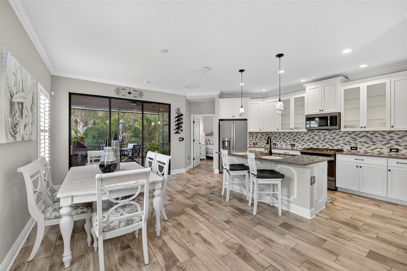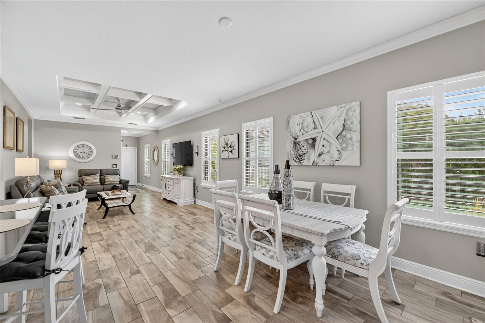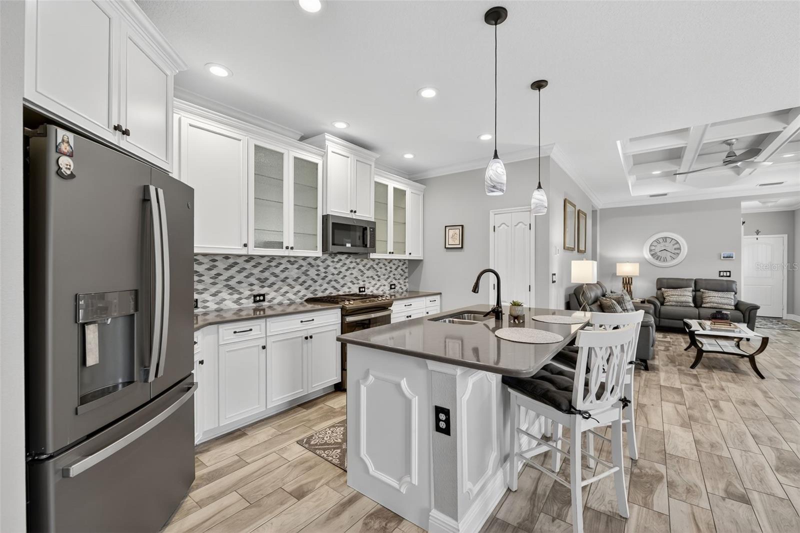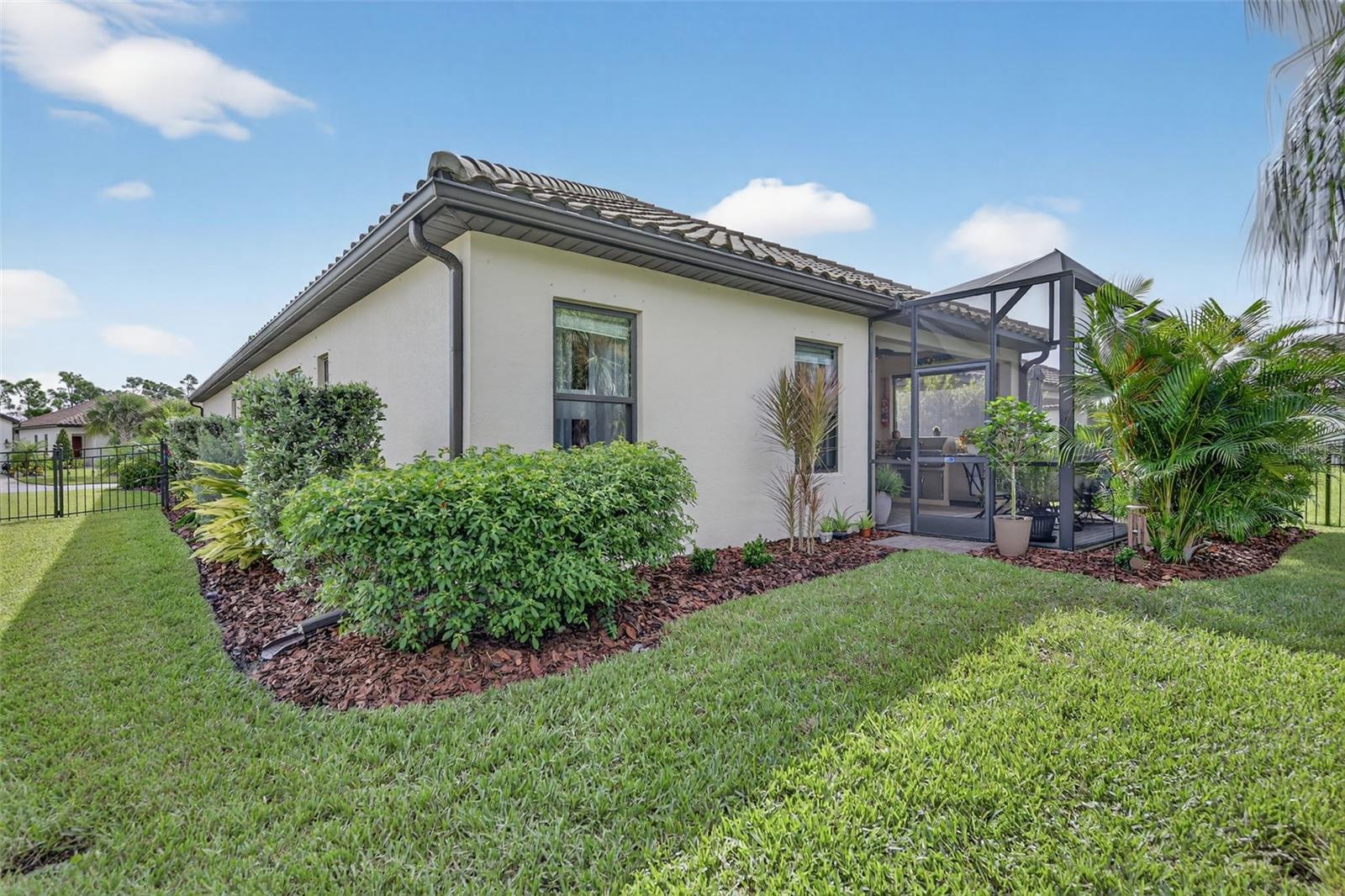 For Sale: Stunning Patriot Model Home - Move-In Ready! Discover modern elegance in this beautifully crafted 3-bedroom, 2-bath home, designed with an open-concept layout perfect for entertaining. The new buyer can enjoy over $70k of upgrades without the wait of adding to new construction. This gem boasts exquisite details like crown molding, a coffered ceiling with custom woodworking, and plantation shutters throughout the living area. The gourmet kitchen shines with quartz countertops, upgraded backsplash with custom glass cabinets, gas cooking for the chef in the family, all complemented by upgraded tile flooring in neutral grey tones to complete the list. Relax in the extended lanai with sealed pavers and an outdoor kitchen, ideal for al fresco dining on your premium, fenced-in lot with professional landscaping.Additional highlights include a den/study with a stylish barn door, upgraded carpet in two bedrooms, ceiling fans throughout, and all rooms cable-ready. Enjoy peace of mind with gutters, a home security system, remaining transferable HVAC warranty plus an extended garage with epoxy flooring. Located close to the amenity center, this tiled roof home is not in a flood zone, has low HOA fees, and no CDD. Don't miss this opportunity to own a meticulously upgraded home built for comfort and style! #DreamHome #ForSale