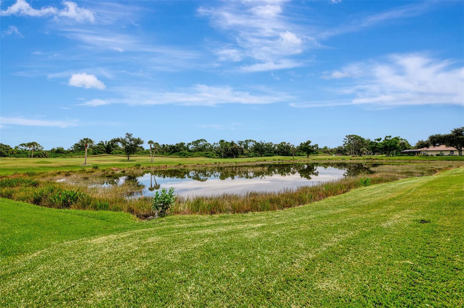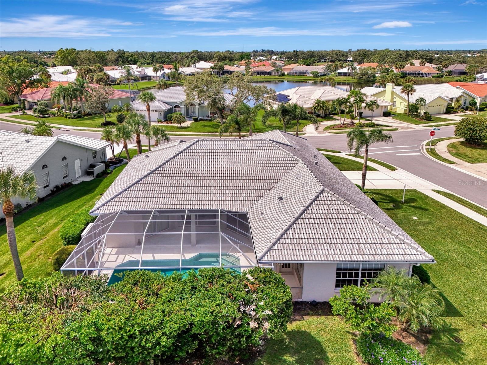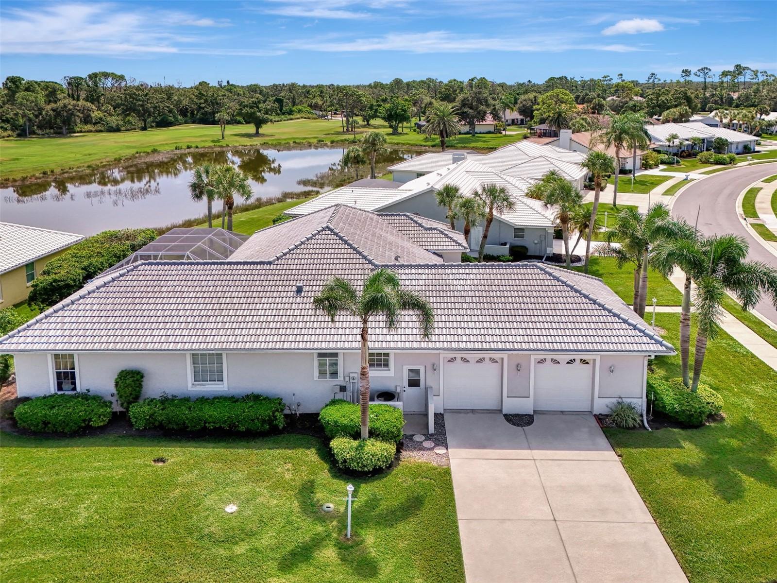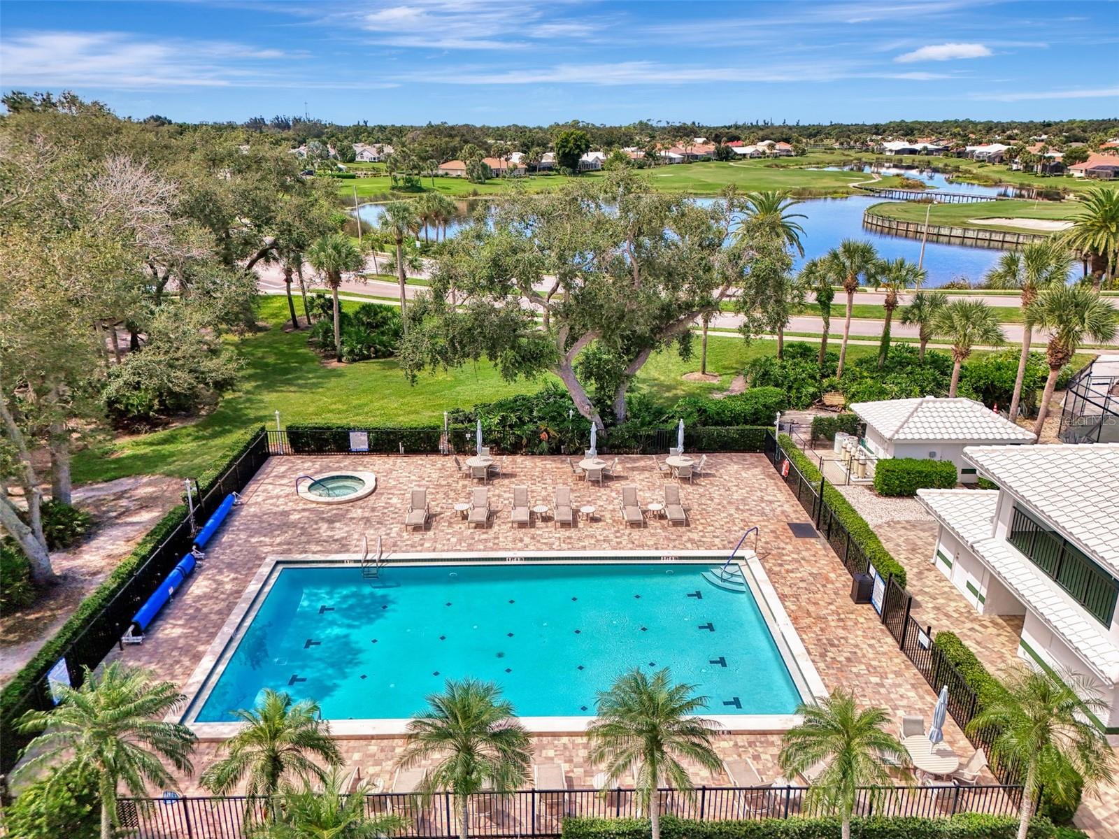 Attractive two bedroom, three bath, pool home, with golf course and water views. The home looks out onto the 7th hole of the Gleneagles course, in the highly desirable, Waterford Golf Community. The home features a gourmet kitchen, with center island, breakfast bar, Corian counters, a Viking double oven and a propane gas stove. There is a large eating area/breakfast nook looking out onto your pool. There is also a formal dining room. The large family room has French doors and could be used as a mother-in law suite with its attached full bath. The master bedroom has sliders out to the pool and two walk-in closets. The garage is an oversize two-car at 768 square feet. The home is being sold partially furnished. The roof was replaced in 2022 and the AC system was replaced in 2021. Be a part of this great community where golf membership on the 27 hole championship course is voluntary. The Waterford community amenities include a large heated pool and spa, clubhouse, fitness room and tennis courts. New pickleball courts are coming very soon! Come and see this beautiful home today!