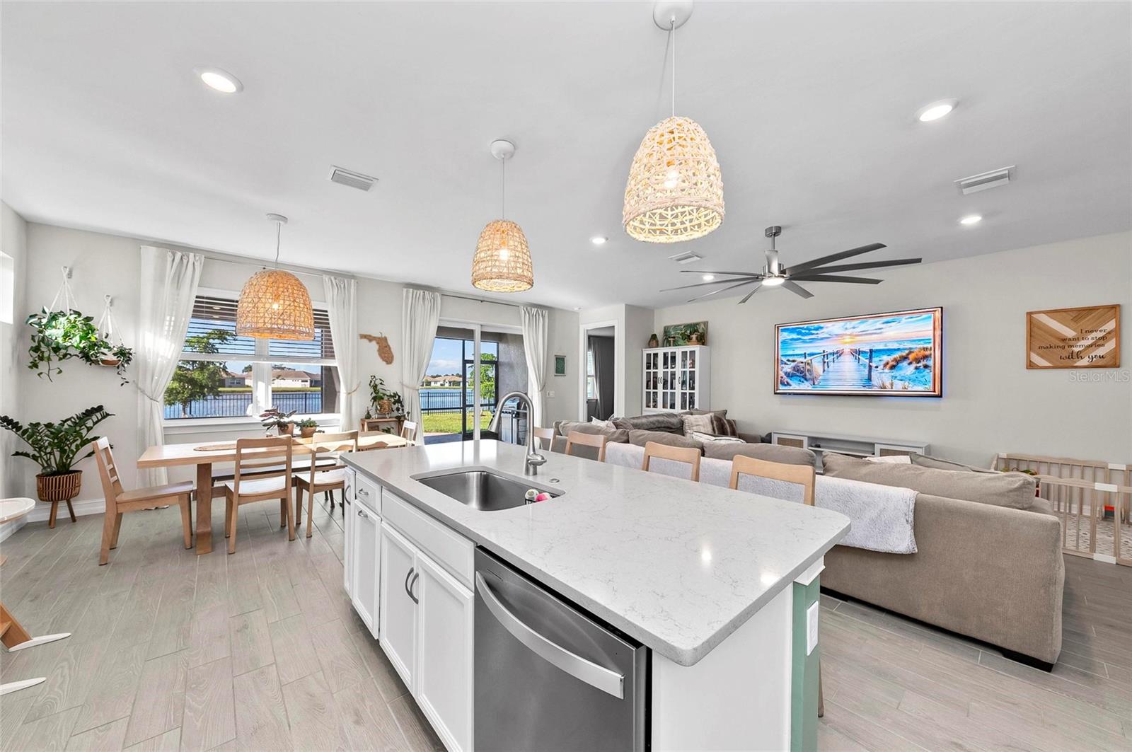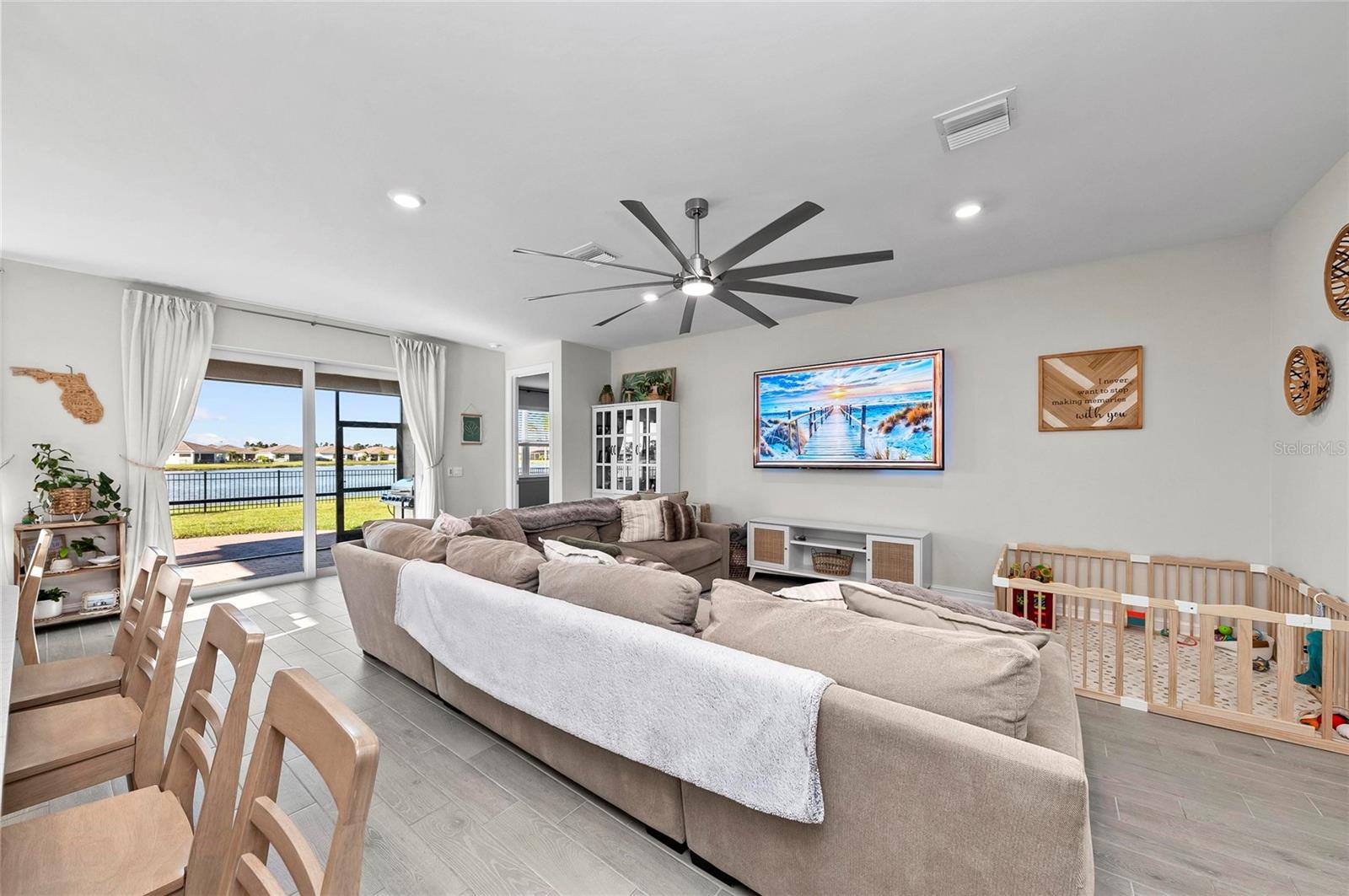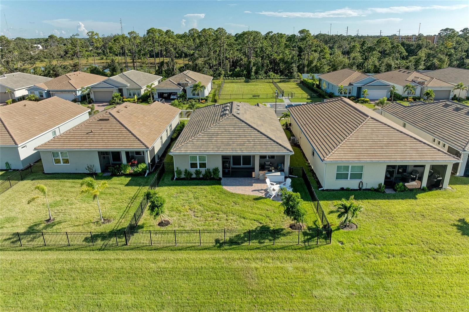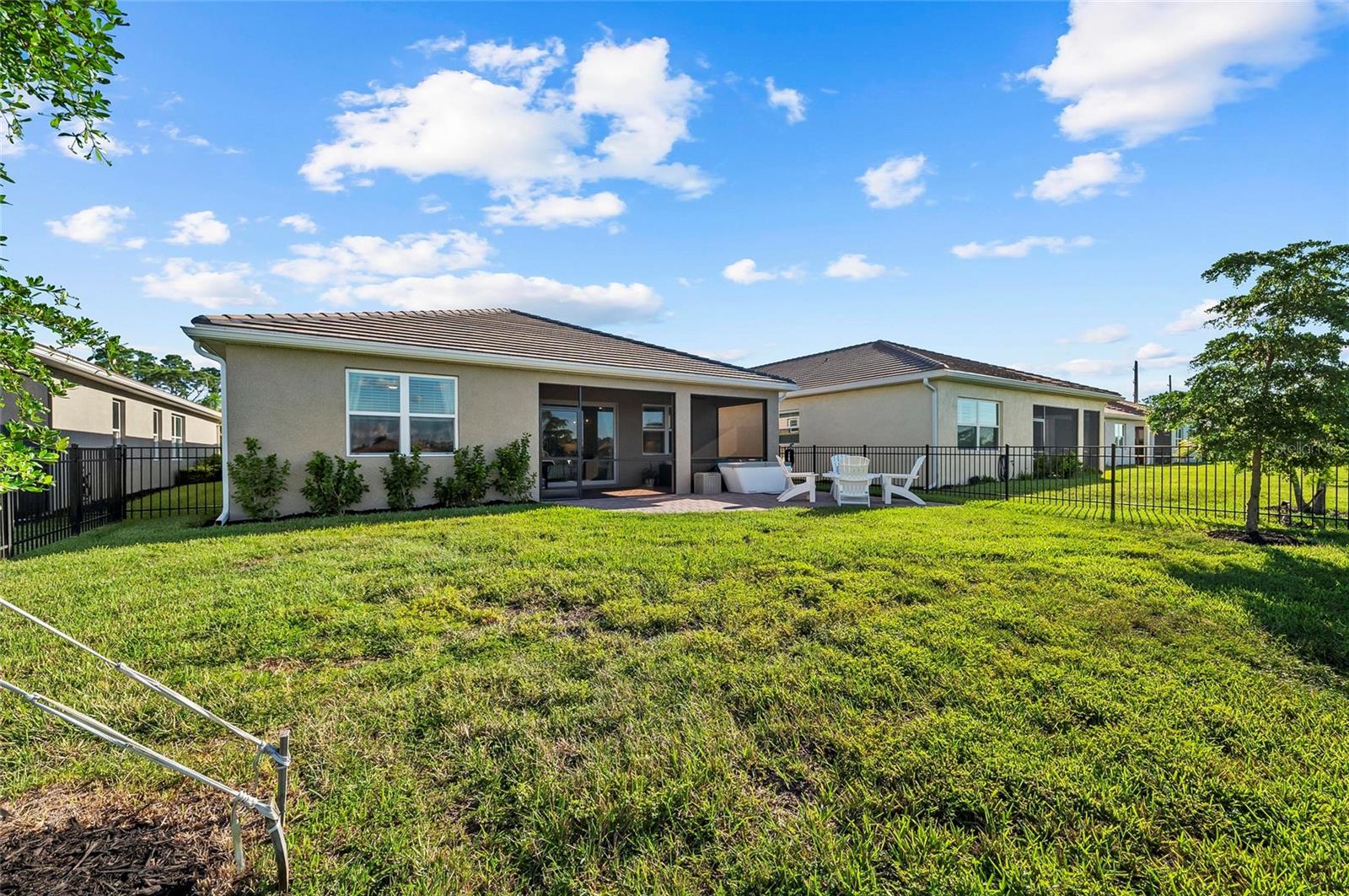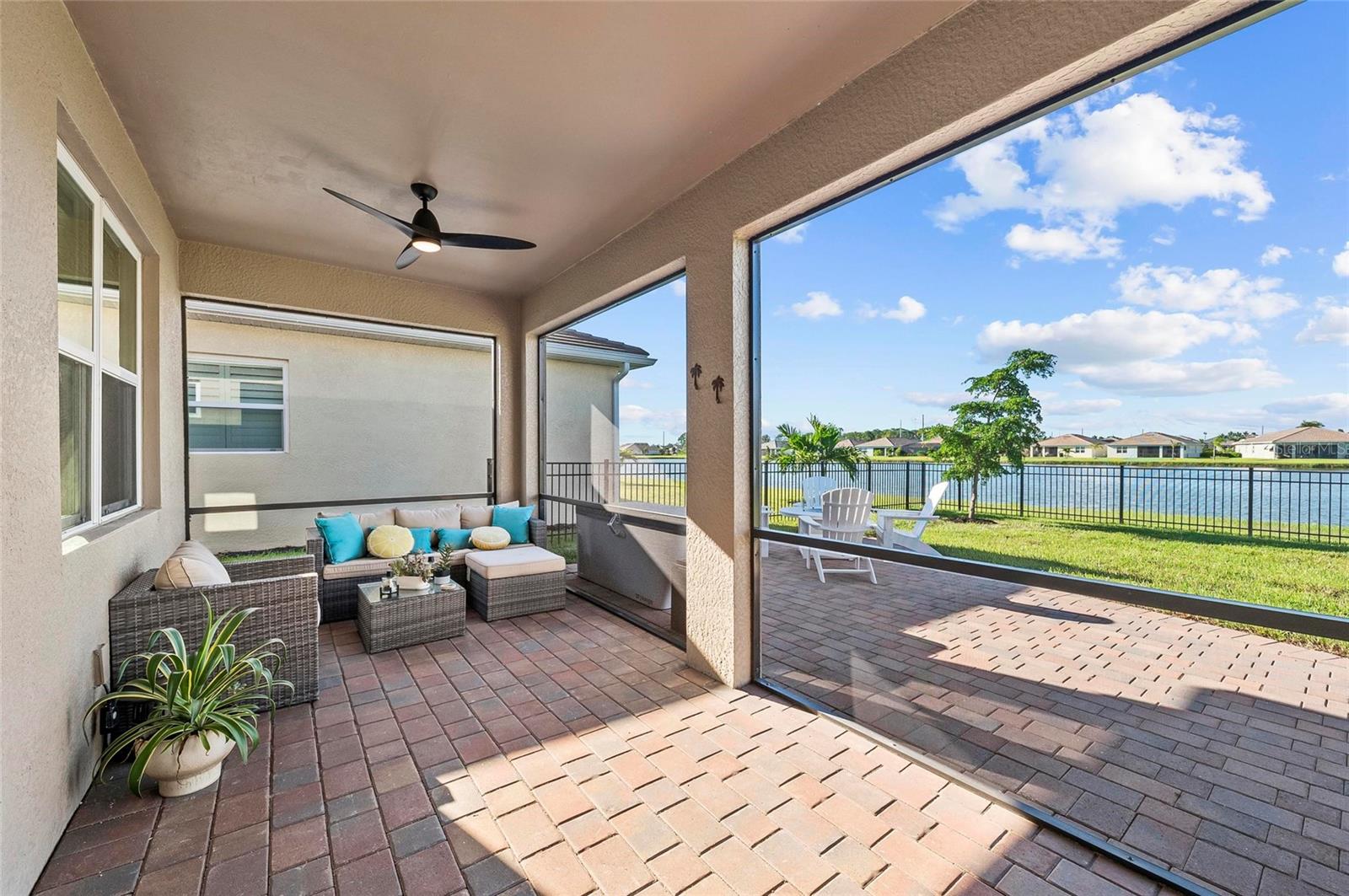 Nearly NEW Home without the new construction price tag & fees! Gated, Central & LOW LOW HOA! Welcome to this stunning 2023 Delray model, located in the boutique, gated community of Palencia. IMPACT WINDOWS. Offering over 2,000 sq. ft. of living space, this 4-bedroom, 2-bath home is in pristine condition and filled with natural light thanks to its desirable southern exposure. Step inside to find a true split floor plan with two guest bedrooms up front, an additional guest room (perfect for a home office or den), and a spacious master suite tucked privately at the back of the home. The master features dual walk-in closets, dual sink vanity with quartz countertops, frameless glass shower with floor-to-ceiling tile, and a private water closet. The open-concept kitchen flows seamlessly into the gathering and dining rooms. Enjoy a large quartz island, subway tile backsplash, custom pendant lighting, soft-close cabinetry with pull-out drawers, and wide sliders showcasing long water views. Outdoor living is a highlight here: a covered and screened lanai plus an extended paver patio overlook the fully fenced backyard, offering ample room for a future pool. Additional features include a widened driveway, 8' doorways, wood like tile flooring, full glass front door, custom upgraded lighting, epoxy garage flooring and a spacious laundry room with shelving and utility sink prep. Palencia is a boutique community of just 203 homes, with low HOA fees that cover lawn maintenance, gated access, and community amenities - and no CDD fees! Palencia has a resort style community pool, clubhouse, bocce ball courts, dog park, and fitness center. Ideally located near the Legacy Trail, nature preserves, restaurants, and shopping.