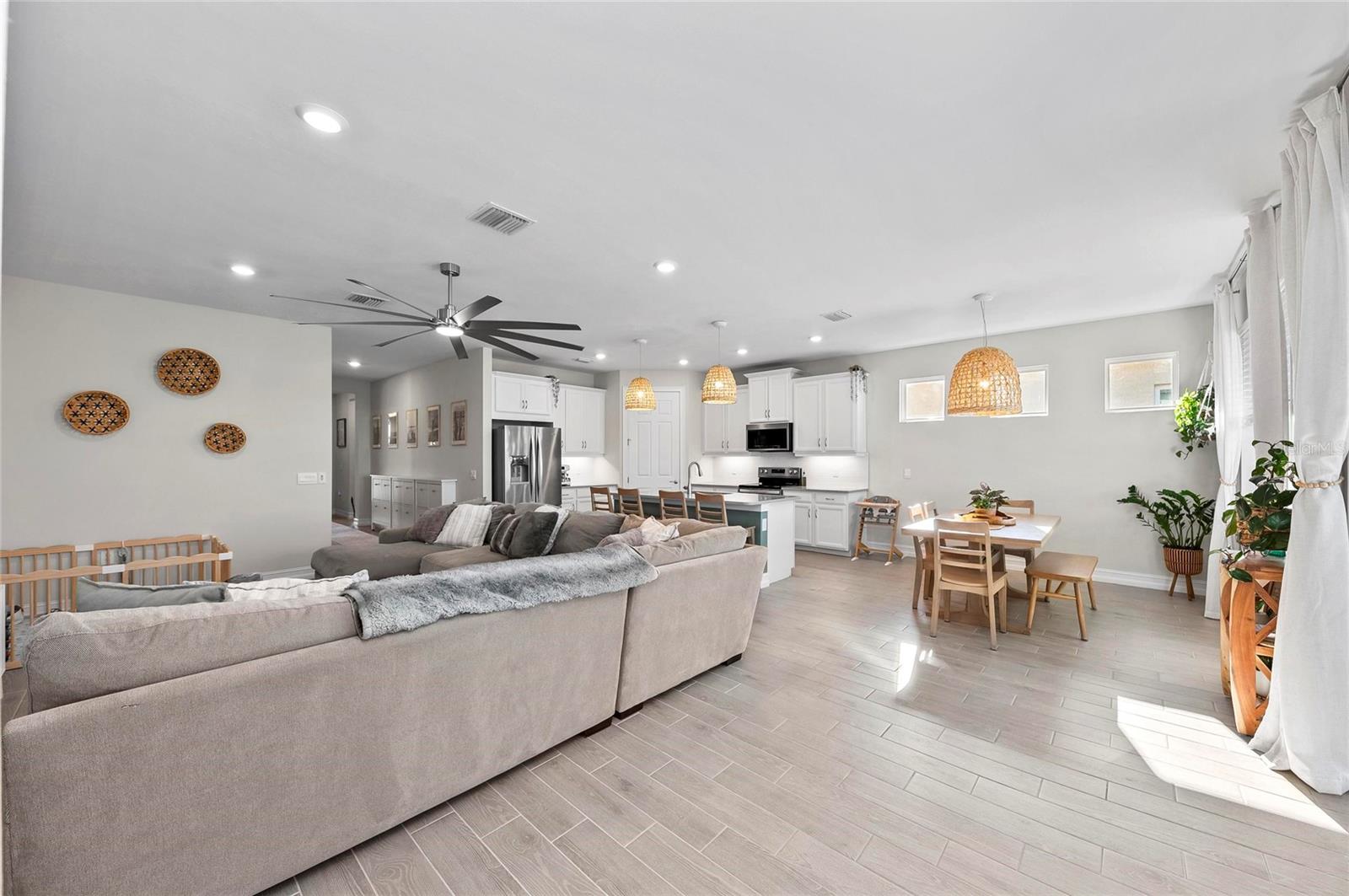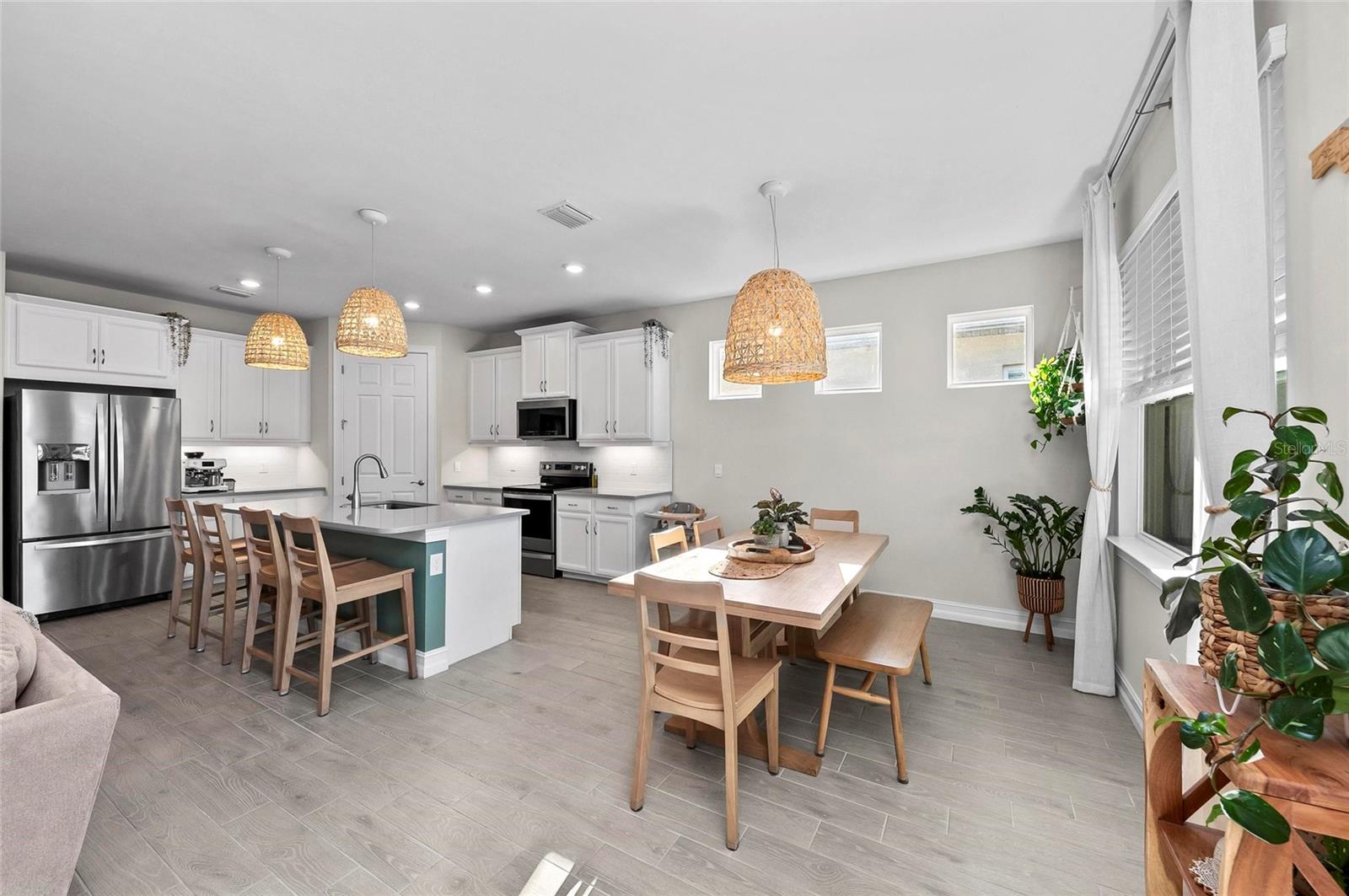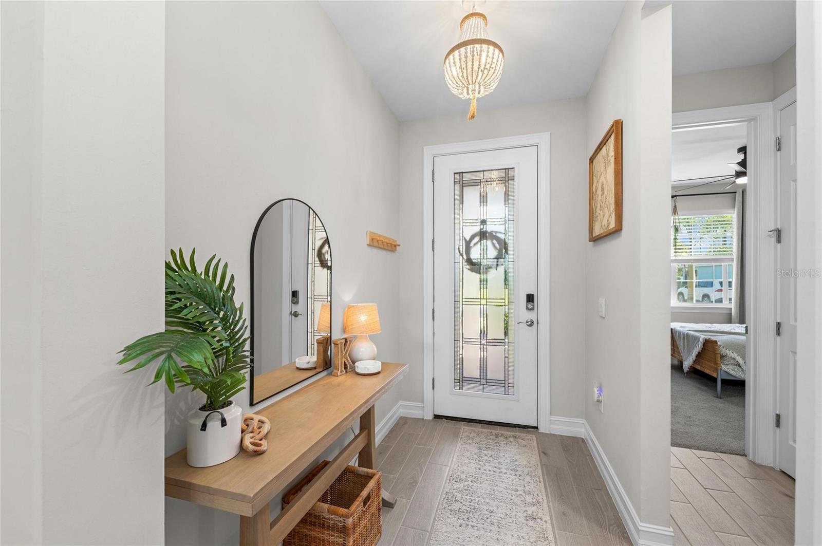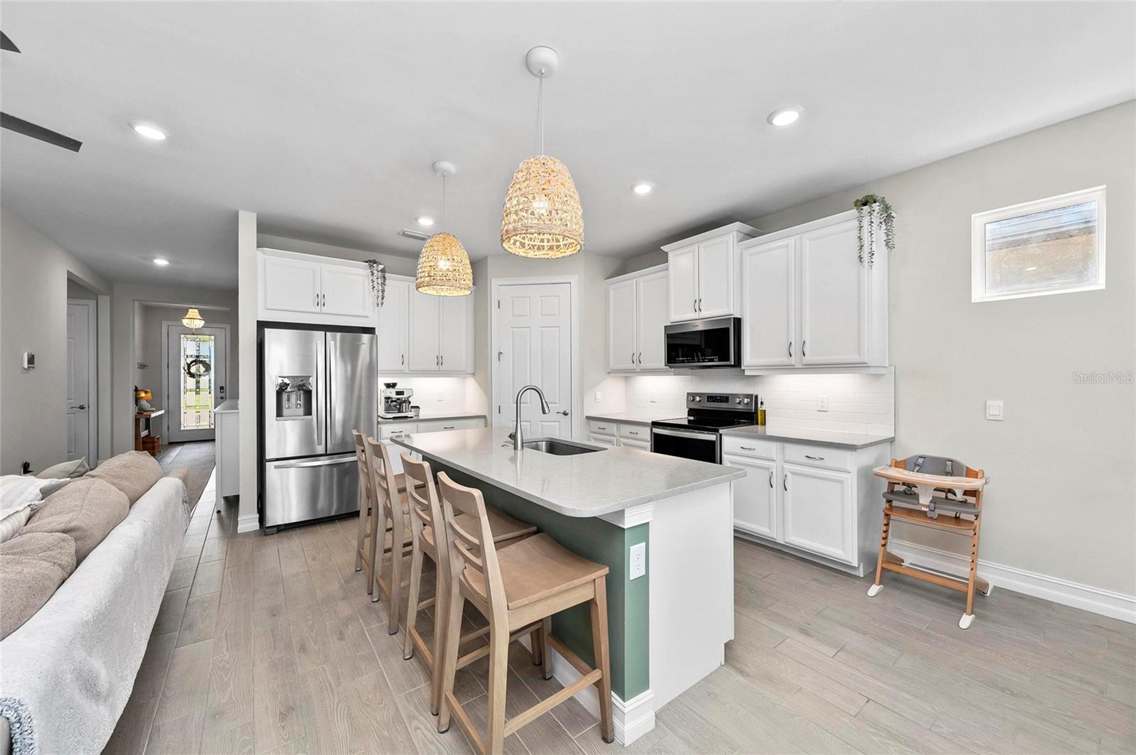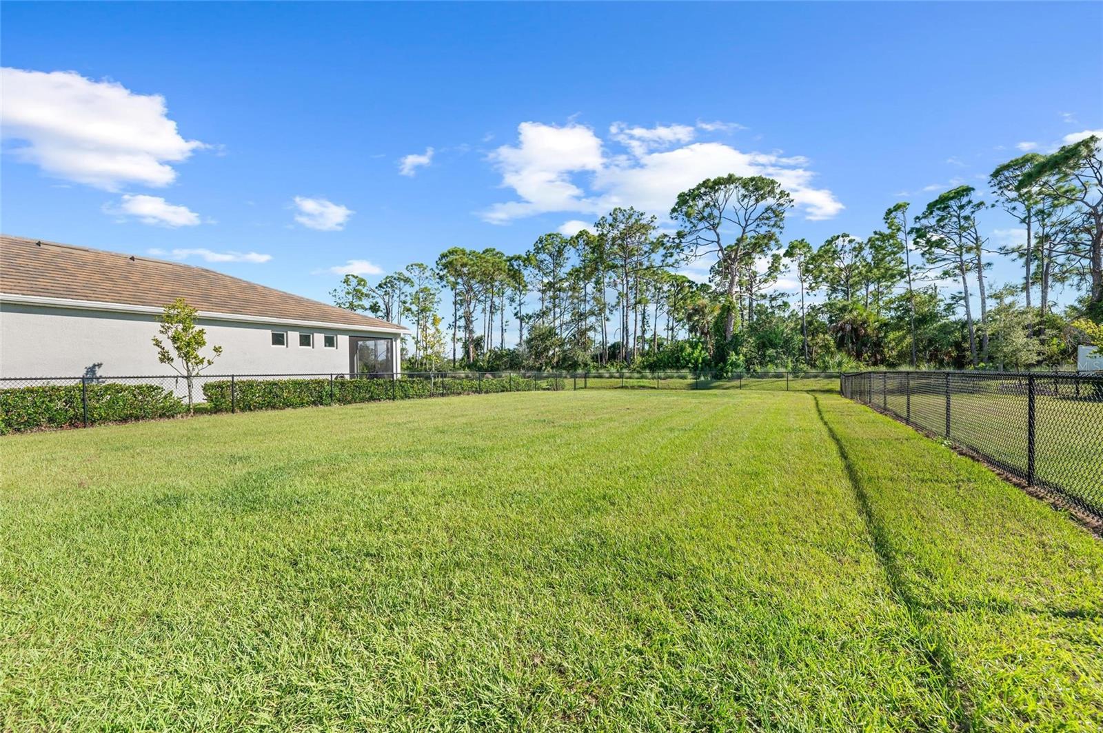 Nearly NEW Home without the new construction price tag & fees! Gated, Central & LOW LOW HOA! Welcome to this stunning 2023 Delray model, located in the boutique, gated community of Palencia. IMPACT WINDOWS. Offering over 2,000 sq. ft. of living space, this 4-bedroom, 2-bath home is in pristine condition and filled with natural light thanks to its desirable southern exposure. Step inside to find a true split floor plan with two guest bedrooms up front, an additional guest room (perfect for a home office or den), and a spacious master suite tucked privately at the back of the home. The master features dual walk-in closets, dual sink vanity with quartz countertops, frameless glass shower with floor-to-ceiling tile, and a private water closet. The open-concept kitchen flows seamlessly into the gathering and dining rooms. Enjoy a large quartz island, subway tile backsplash, custom pendant lighting, soft-close cabinetry with pull-out drawers, and wide sliders showcasing long water views. Outdoor living is a highlight here: a covered and screened lanai plus an extended paver patio overlook the fully fenced backyard, offering ample room for a future pool. Additional features include a widened driveway, 8' doorways, wood like tile flooring, full glass front door, custom upgraded lighting, epoxy garage flooring and a spacious laundry room with shelving and utility sink prep. Palencia is a boutique community of just 203 homes, with low HOA fees that cover lawn maintenance, gated access, and community amenities - and no CDD fees! Palencia has a resort style community pool, clubhouse, bocce ball courts, dog park, and fitness center. Ideally located near the Legacy Trail, nature preserves, restaurants, and shopping.