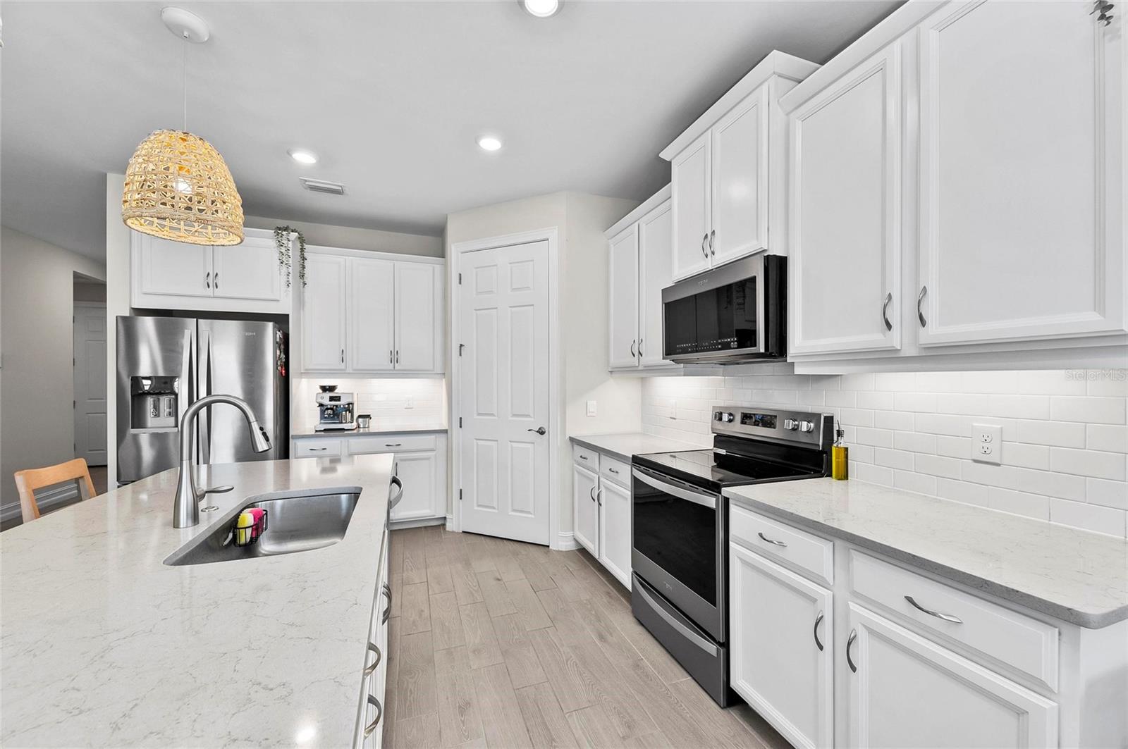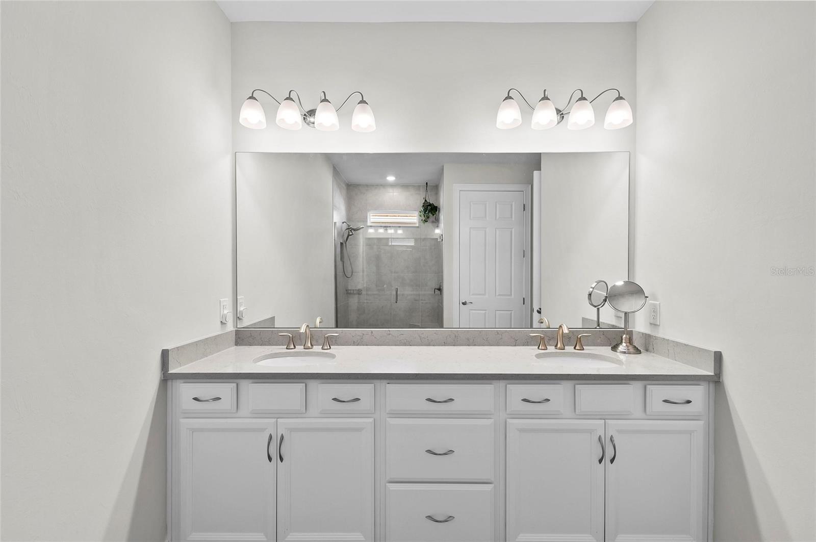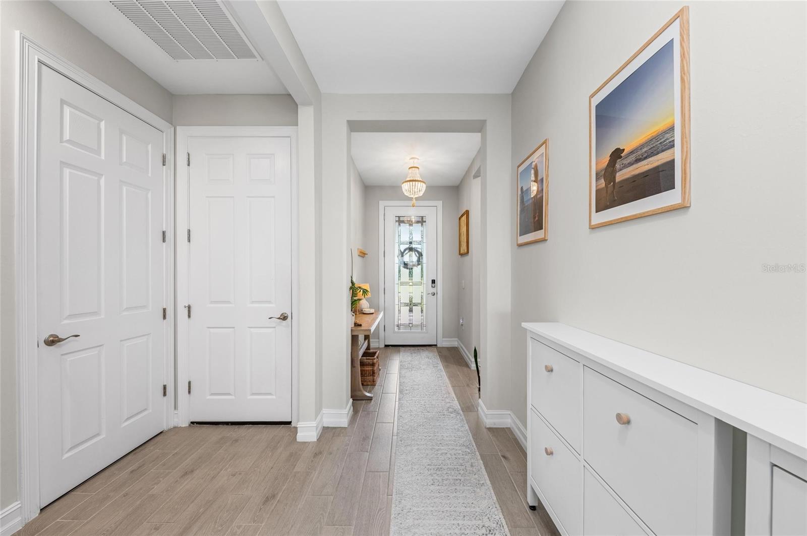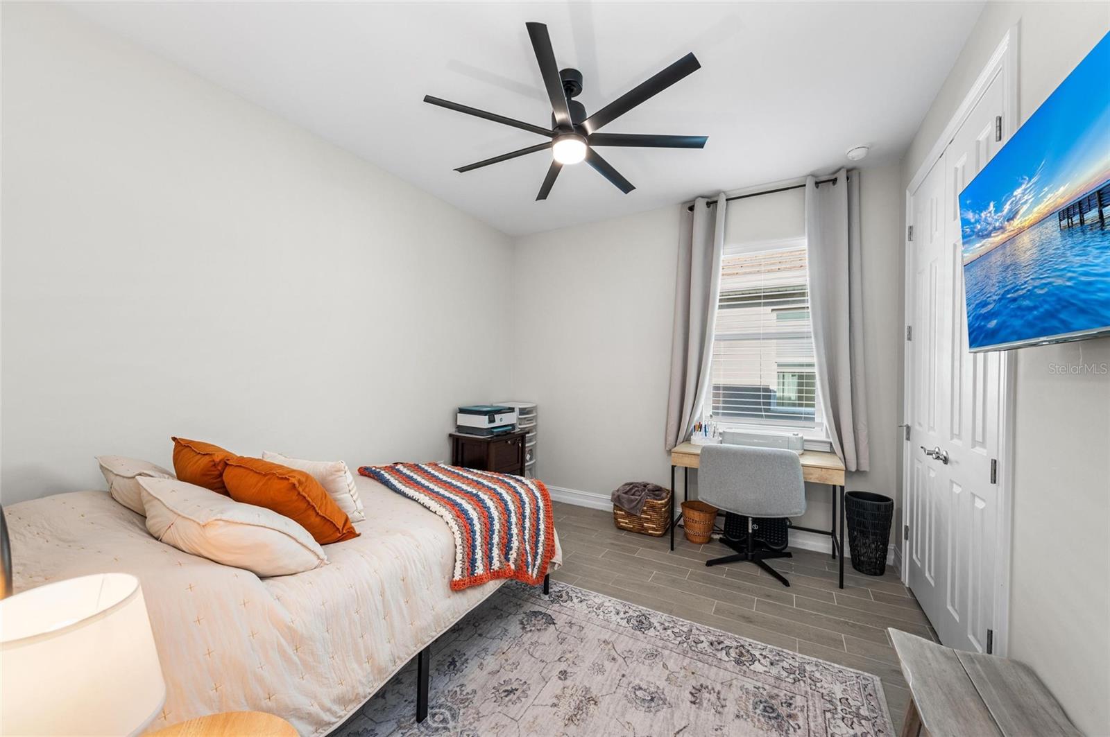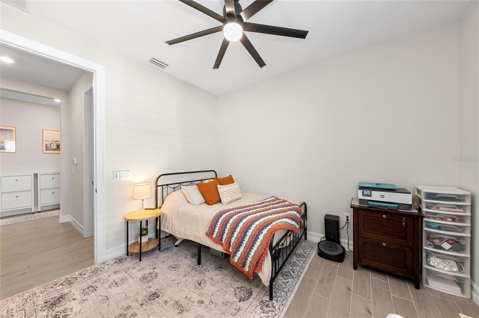 Nearly NEW Home without the new construction price tag & fees! Gated, Central & LOW LOW HOA! Welcome to this stunning 2023 Delray model, located in the boutique, gated community of Palencia. IMPACT WINDOWS. Offering over 2,000 sq. ft. of living space, this 4-bedroom, 2-bath home is in pristine condition and filled with natural light thanks to its desirable southern exposure. Step inside to find a true split floor plan with two guest bedrooms up front, an additional guest room (perfect for a home office or den), and a spacious master suite tucked privately at the back of the home. The master features dual walk-in closets, dual sink vanity with quartz countertops, frameless glass shower with floor-to-ceiling tile, and a private water closet. The open-concept kitchen flows seamlessly into the gathering and dining rooms. Enjoy a large quartz island, subway tile backsplash, custom pendant lighting, soft-close cabinetry with pull-out drawers, and wide sliders showcasing long water views. Outdoor living is a highlight here: a covered and screened lanai plus an extended paver patio overlook the fully fenced backyard, offering ample room for a future pool. Additional features include a widened driveway, 8' doorways, wood like tile flooring, full glass front door, custom upgraded lighting, epoxy garage flooring and a spacious laundry room with shelving and utility sink prep. Palencia is a boutique community of just 203 homes, with low HOA fees that cover lawn maintenance, gated access, and community amenities - and no CDD fees! Palencia has a resort style community pool, clubhouse, bocce ball courts, dog park, and fitness center. Ideally located near the Legacy Trail, nature preserves, restaurants, and shopping.