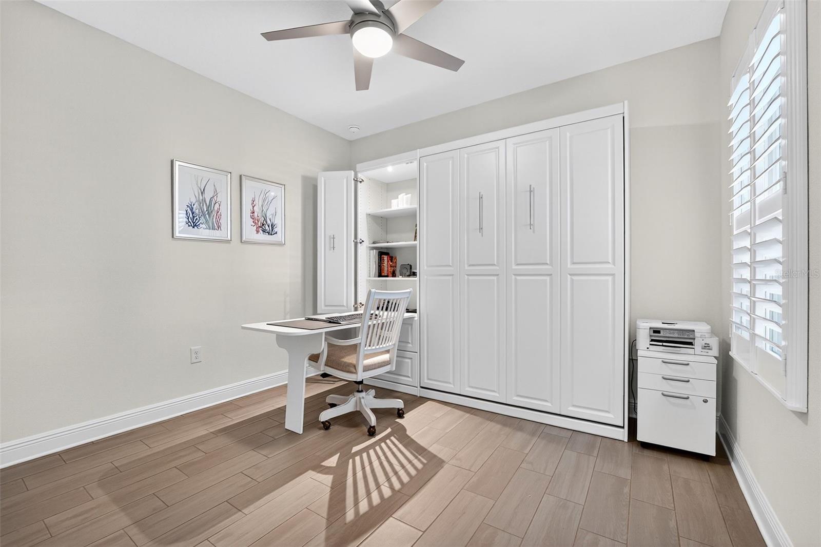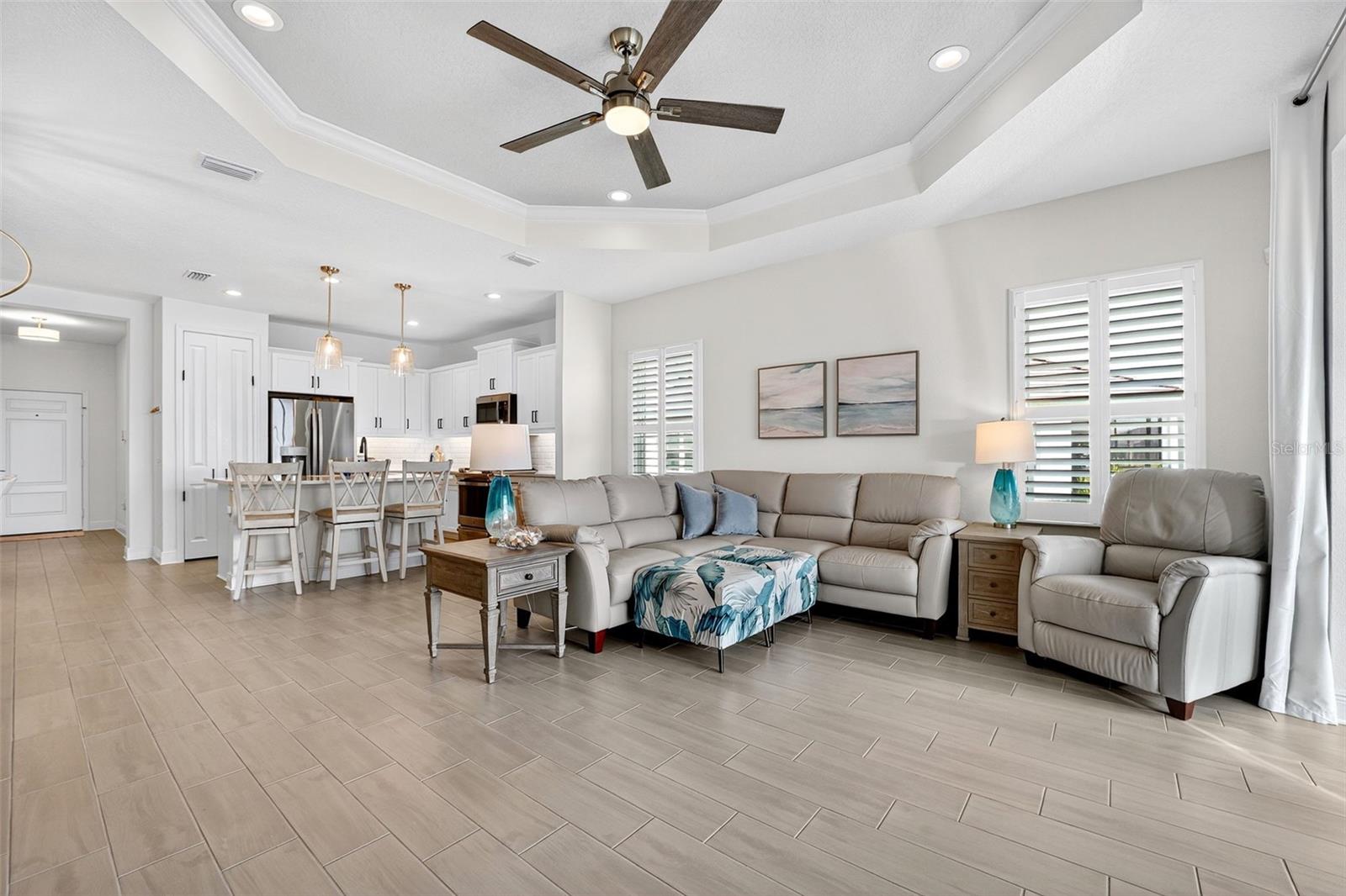 Better-Than-New Villa: Designer Upgrades, Smart Features, and Prime Cul-de-Sac Location! This one-year-old, 2 Bedroom, 2 Bath Villa with Den/Office and 2-Car Garage in the sought-after Wysteria community of Wellen Park is a standout opportunity: the final touches and premium upgrades you will not find in new construction have been added, so this one is ready for you to start living your own Florida Dream. Built by the reputable Neal Communities, this open-concept Tidewater B floorplan is situated on a tranquil cul-de-sac with serene lake views, offering minimal traffic and maximum tranquility.Unrivaled Upgrades & Ultimate Convenience: Essential Florida protection is covered with whole-house impact-resistant glass windows and a reinforced garage door, a major investment in safety and insulation. Forget carpet; the entire home features premium Wood-Look Tile flooring throughout, a modern aesthetic that's easy to maintain. High-end finishes continue with 8-foot interior doors and a tray ceiling with crown molding in the main living space. The current owner has thoughtfully executed many high-value enhancements, making this villa truly move-in ready. Windows are finished with Plantation Shutters, adding significant value, light control and timeless style. The HVAC system has an installed UV light to sterilize the air and improve system efficiency. A 50 AMP electrical switch and quick-release gas connector have been installed, allowing for a seamless, whole-house generator connection if desired.All light fixtures have been upgraded, including five premium ceiling fans and three additional designer lights over the dining area and kitchen island. The Den has been enhanced with glass doors, and the laundry room features newly installed cabinets and a counter for maximum utility. (Full list of upgrades available.)The stunning kitchen is finished with Quartz countertops and includes the highly desired Slide-in Gas Range within the Stainless Steel appliance package. The space is completed with custom features like pull-out pot drawers and LED under-cabinet lighting with dimmer switches. The open floorplan flows perfectly to the exterior with an upgraded pocket sliding glass door fully opening to the extended, caged lanai, overlooking the picturesque lake, making the most of the Florida indoor-outdoor living experience. The Wysteria community provides true carefree living, with the HOA covering lawn, landscape, irrigation, cable, and internet. Residents enjoy an amenity center with community pool, spa, and pickleball courts. Wysteria is centrally located in the heart of Wellen Park, just minutes from Downtown Wellen, a vibrant social hub centered around the 80-acre Grand Lake with 2.8 miles of pedestrian paths. Enjoy upscale dining, boutique shopping, a waterfront splash pad, Solis Hall and lawn for concerts and entertainment. CoolToday Park, the nearby Spring Training home of the Atlanta Braves, hosts year-round events, concerts, and dining the Tomahawk Tiki Bar & Grill. Publix Plaza and Costco Warehouse are conveniently nearby, with schools and future medical facilities currently under construction.With only a few villas remaining in Wysteria, this is a rare opportunity to purchase a better-than-new home where every major upgrade already completed. Don't miss the chance to own the premier villa in the community. Schedule your private showing soon and see this exceptional home for yourself.
