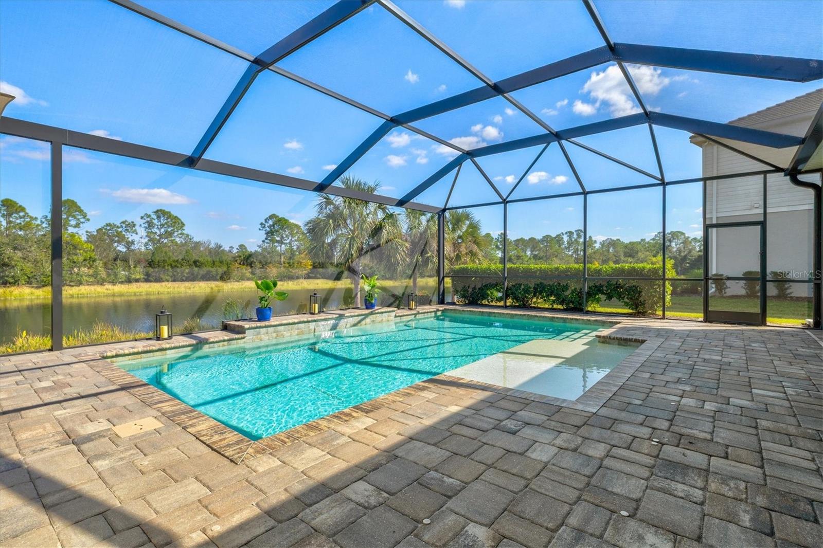 Welcome to 12436 Destin Loop, a FULLY FURNISHED Sanibel model from the Coastal Series, located in Grand Palm's exclusive private gated area within the community and near the vibrant Wellen Park community. Offered fully furnished, this turn-key home allows you to move right in and enjoy MAINTENANCE FREE Florida living at its finest.Step outside to your private Florida retreat--one of the home's most impressive features. The sparkling saltwater pool is surrounded by a panoramic screen cage and includes a Paradise Grill and a TV. Everything is included for the buyer, making this space perfect for effortless entertaining and tranquil waterfront relaxation. Mature landscaping and expansive preserve and pond views provide complete privacy.A paver driveway and walkway lead to a charming covered front porch sitting area and a durable tile roof, setting the tone for the quality found throughout the home. Inside, you'll appreciate 10-foot ceilings, 8-foot door openings, crown molding in the living room tray ceiling, and a custom built-in fireplace and mantel that create a warm and elevated living environment.The gourmet kitchen showcases quartz countertops, a stylish tile backsplash, 42-inch shaker cabinets, a natural gas range with a wood vent hood, a convection oven, GE stainless steel appliances, and a walk-in pantry with custom shelving.The spacious primary suite includes two large walk-in closets, dual vanities, a soaking tub, a walk-in shower, and refined finishes throughout. Custom closets are thoughtfully integrated for exceptional organization.Additional features include an Extended Club Room, roller blackout blinds, ceramic tile flooring, an epoxied three-car garage, and glass shower doors in all three bathrooms, and a WHOLE-HOUSE NATURAL GAS GENERATOR.