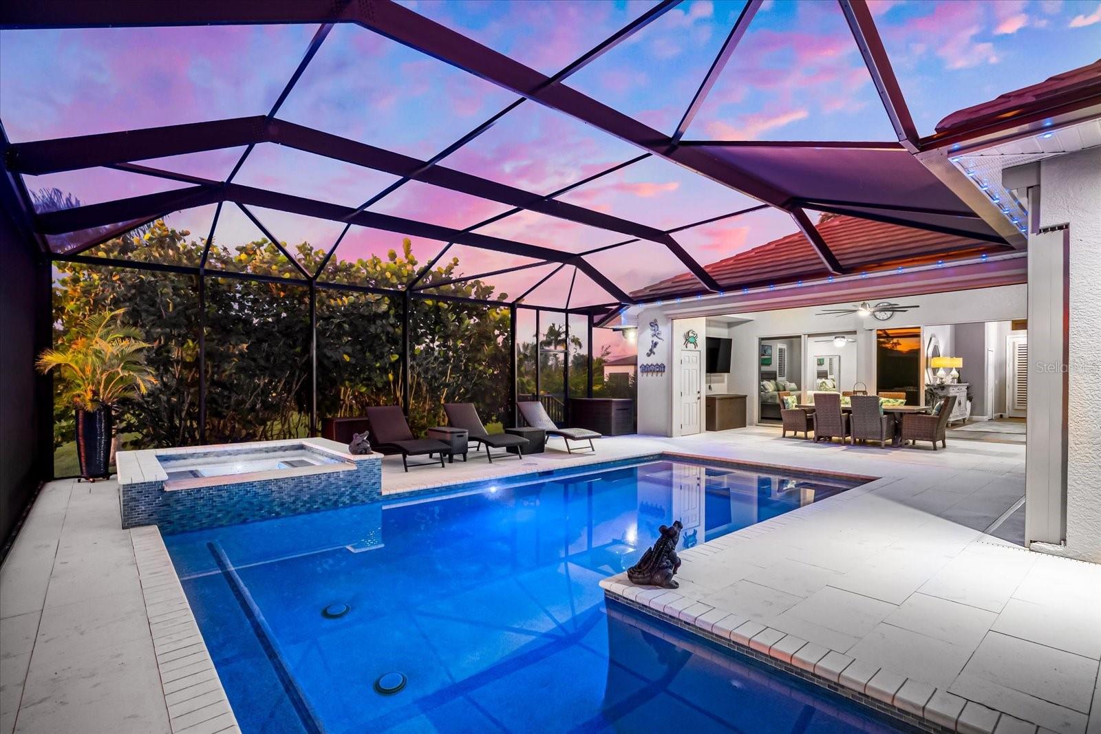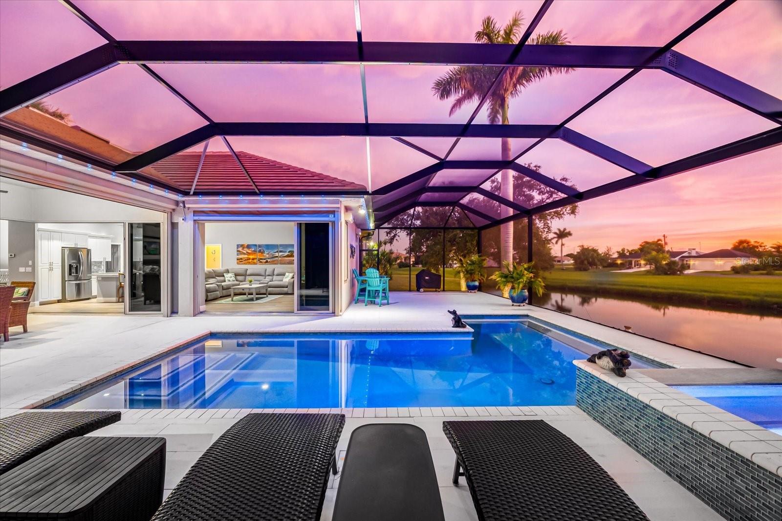 Better than new waterfront pool home in Burnt Store Lakes! This updated 3BR/3BA home offers 2,225 sq ft, a 3-car garage, and stunning sunset lake views. Features include 12' ceilings, coffer lighting, new porcelain tile flooring, quartz kitchen with 2023 stainless appliances, and 90-degree pocket sliders opening to the expansive lanai. Enjoy a new saltwater pool & spa (2024), picture-window cage, and 1,500 sq ft of limestone pavers. Recent upgrades: roof 2023, HVAC 2022, interior/exterior paint, 5" baseboards, plantation shutters, remodeled baths (2023), Storm Smart shades, accordion shutters, new hot water heater (2025), pool pump (2025), irrigation pump (2025), landscape lighting, and hurricane-rated garage doors. Move-in ready and minutes from Burnt Store Marina. Adjacent lot available separately.