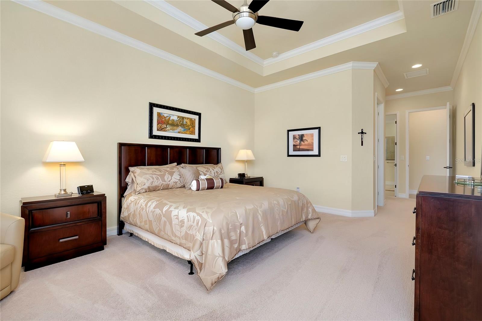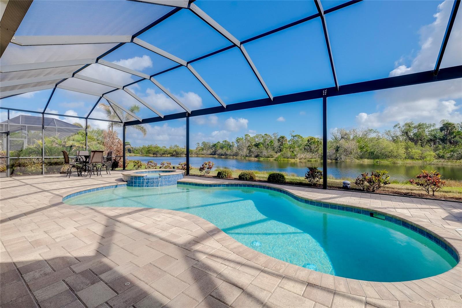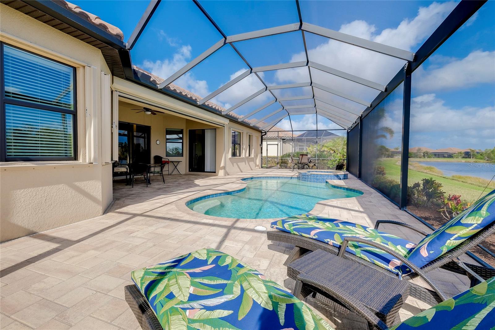 Built on a premium full lake view lot, this immaculate luxury home includes a custom designed pool and spa, study or 4th bedroom and the 3 car garage. Beautiful finishes, cabinetry and attention to detail makes this meticulously maintained estate home an exceptional property. Leaded glass entry doors open into the great room to an amazing lake and lush vegetation view through the triple sliders. The pool cage has the scenic-view screening and the large lanai with sealed pavers allows for entertaining. Great privacy and so relaxing! The heated salt-water pool includes auto fill to maintain the proper level year round, pop up cleaning jets, lighting and attached heated spa. The pool pump, filter, housing and cage screening is all new. The lanai has access to the pool bath. The Oakmont model offers a split floor plan with an open concept living area, tray ceilings, crown moldings, and ceramic tile floors in main areas. The beautiful kitchen has granite countertops, stainless steel appliances, cooktop, detailed wood cabinetry, a raised bar plus a dinette area looking out to the lake. Safety features include hurricane locking accordion shutters for the windows, Kevlar automated screens on front entry and covered lanai area and a security system. The primary bedroom has access to the pool area, large walk in closet, en-suite bath with 2 separate vanities, a Roman walk in shower and a soaking tub. The front bedroom is currently used as an office. The remaining 2 bedrooms are on the other side of the home with a full bathroom plus the 1/2 bath for the pool area. The laundry room has built in cabinetry and a sink and leads to the 3 car garage. The garage has been upgraded with an epoxy finished floor, a workshop and pull down stairs to storage attic area. New AC unit and air purification system installed in April 2025. The gated community of Gran Paradiso has a low HOA fee that includes lawn care, irrigation, cable, internet and use of the community amenities: a resort-style swimming pool, clubhouse, gym, tennis/pickleball courts, playground and full time activity director. Conveniently located to Venice beaches, airports, hospitals and schools, Wellen Park and the Atlanta Braves Spring Training facility. Furniture is available under separate contract. Move-in ready, perfect for snowbirds as well.