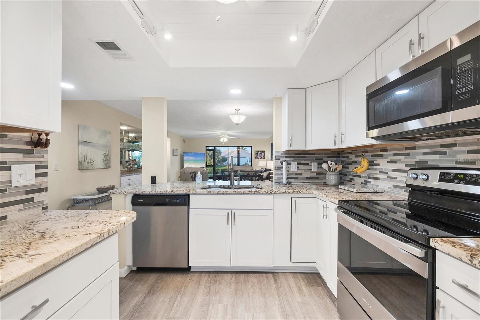 #317 at Lakes of Capri is a picture-perfect opportunity for fun and carefree living. This first-floor unit has been updated from top to bottom. You'll appreciate the luxury plank flooring, fresh paint and crisp trim features. The cook's kitchen features a coordinating built in buffet, ample storage and a great work flow with granite counters, glass tile, white cabinets and a full suite of Amana stainless appliances. You'll never miss a thing with the pass though breakfast counter into the main living space with water & wildlife views. The finished lanai has water and golf course views and lush flowering landscape. The Owners suite has direct access to the finished lanai, a large walk in and bonus linen closet, updates here include a step-in shower, dual sinks and gorgeous drawered vanity with sparkling granite. Your guests, work or hobbies will appreciate the spacious second bedroom/bath! There is in-unit washer/dryer, 2 utility closets, new HVAC in 2023, assigned covered parking, approx.4x8 secured inside storage for your sporting and other goods. The Lakes of Capri is pet friendly, in the perfect location for long walks, bike rides, golf and easy to get to great restaurants, beaches, & shopping. Living here you'll find a friendly community with fun group events. Gathering by the sparkling pool with the paver sundeck is a daily occurrence. You can hear the laughter from here! HOA fees include Venice water, trash, WiFi. Roofs were replaced in 2024 due to Ian and no assessments.