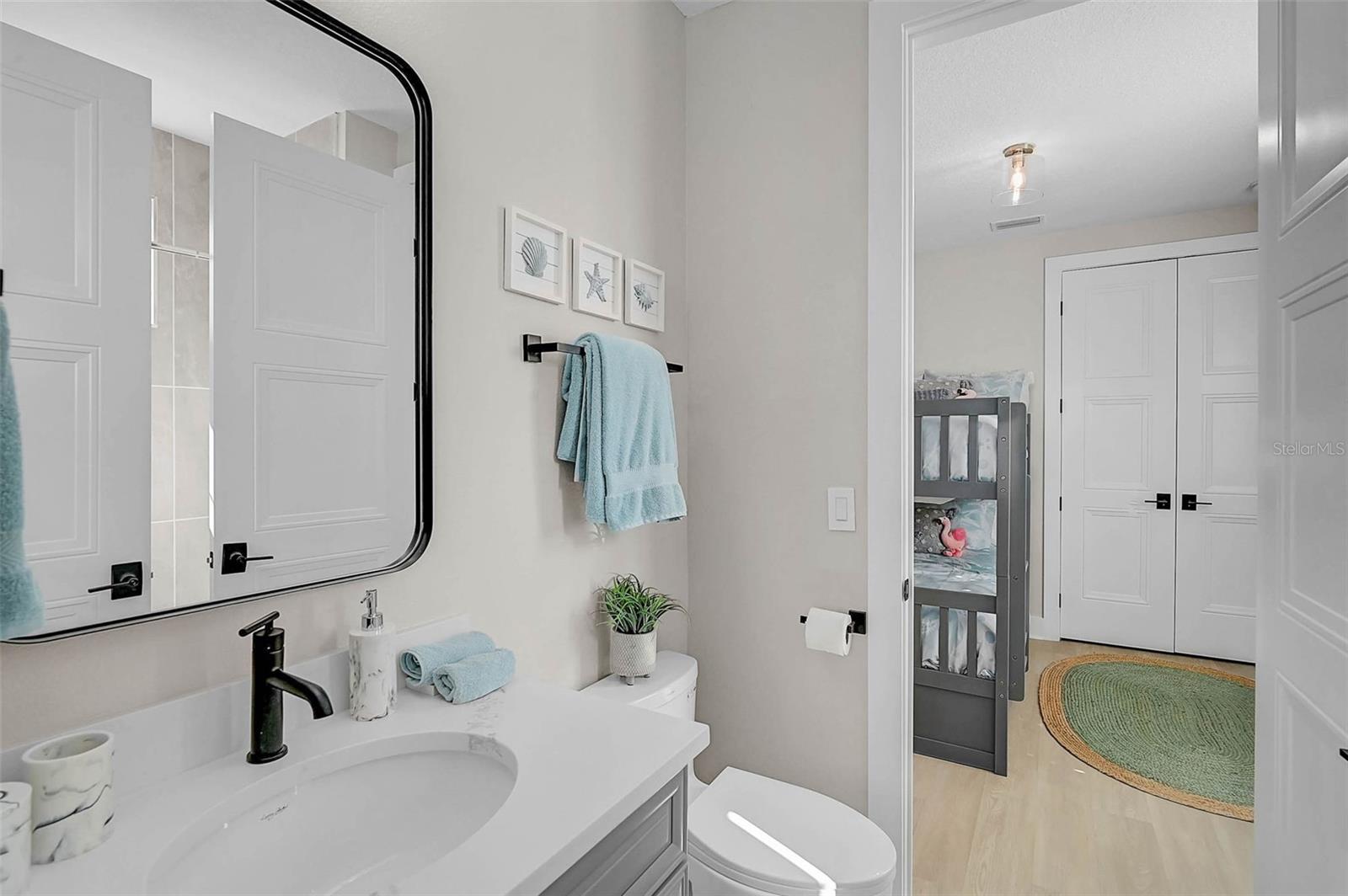 Stunning never-lived-in model home on one of the largest lots in Hunters Point, offering excellent privacy and expanded waterfront views just minutes from Anna Maria Island. Features include a heated finite-edge pool, deeded private dock suitable for approximately 25 ft vessels, and a three-stop elevator. The home is elevated 16 ft. According to the seller, the 2024 coastal water event did not impact the home, with water reported only reaching the top of the dock.Designed for high-efficiency living with PGT impact windows, enhanced insulation, solar power with Sonnen battery storage, multi-zone HVAC, tankless water heater, irrigation system, smart locks, and home automation. The main level features a bright open layout with wide-plank flooring, coffered and beadboard ceilings, plantation shutters, surround-sound wiring, and a quartz kitchen with shaker cabinets, stainless steel appliances, and a large island. Covered terraces extend indoor-outdoor living.The upper level includes a spacious primary suite with screened porch overlooking the canal and pool, a walk-in closet, and a bath with dual vanities and heated flooring. Two guest rooms--one with a screened porch--share a Jack-and-Jill bath. A full laundry room completes the upper level.Additional features include a two-car garage with epoxy flooring, outdoor lighting, irrigation, and smart-home connectivity. Multiple covered and screened terraces offer comfortable outdoor spaces throughout the home.Hunters Point is a gated, golf-cart-friendly community with private roads and a forthcoming clubhouse and resort-style pool. HOA dues of $550 per month include cable, internet, pest control, grounds maintenance, and irrigation water. Convenient to marinas, dining, nature parks, Cortez Village, and the beaches of Anna Maria Island. Furniture may be available separately.