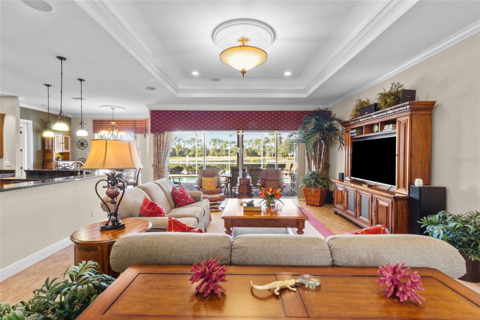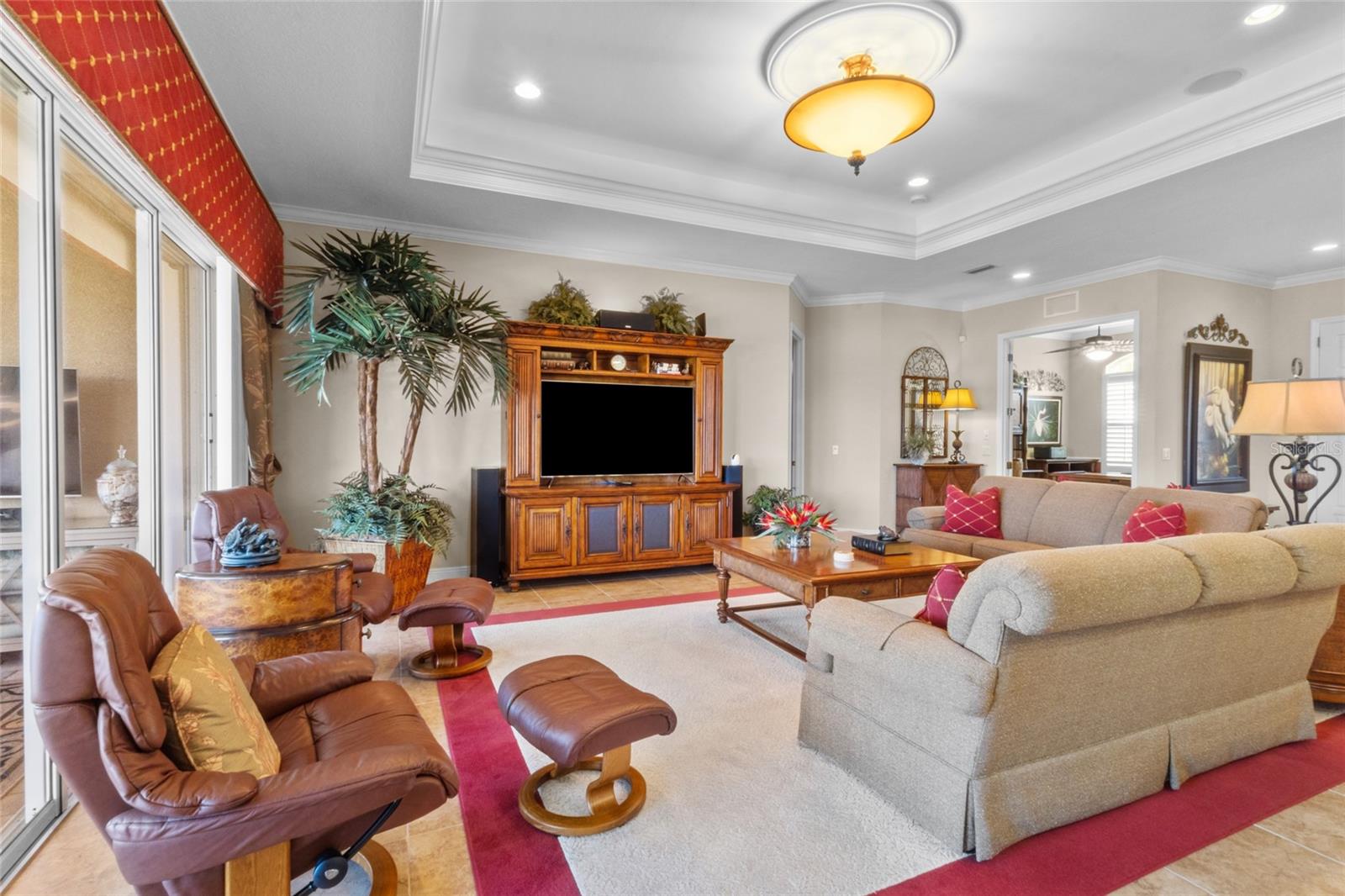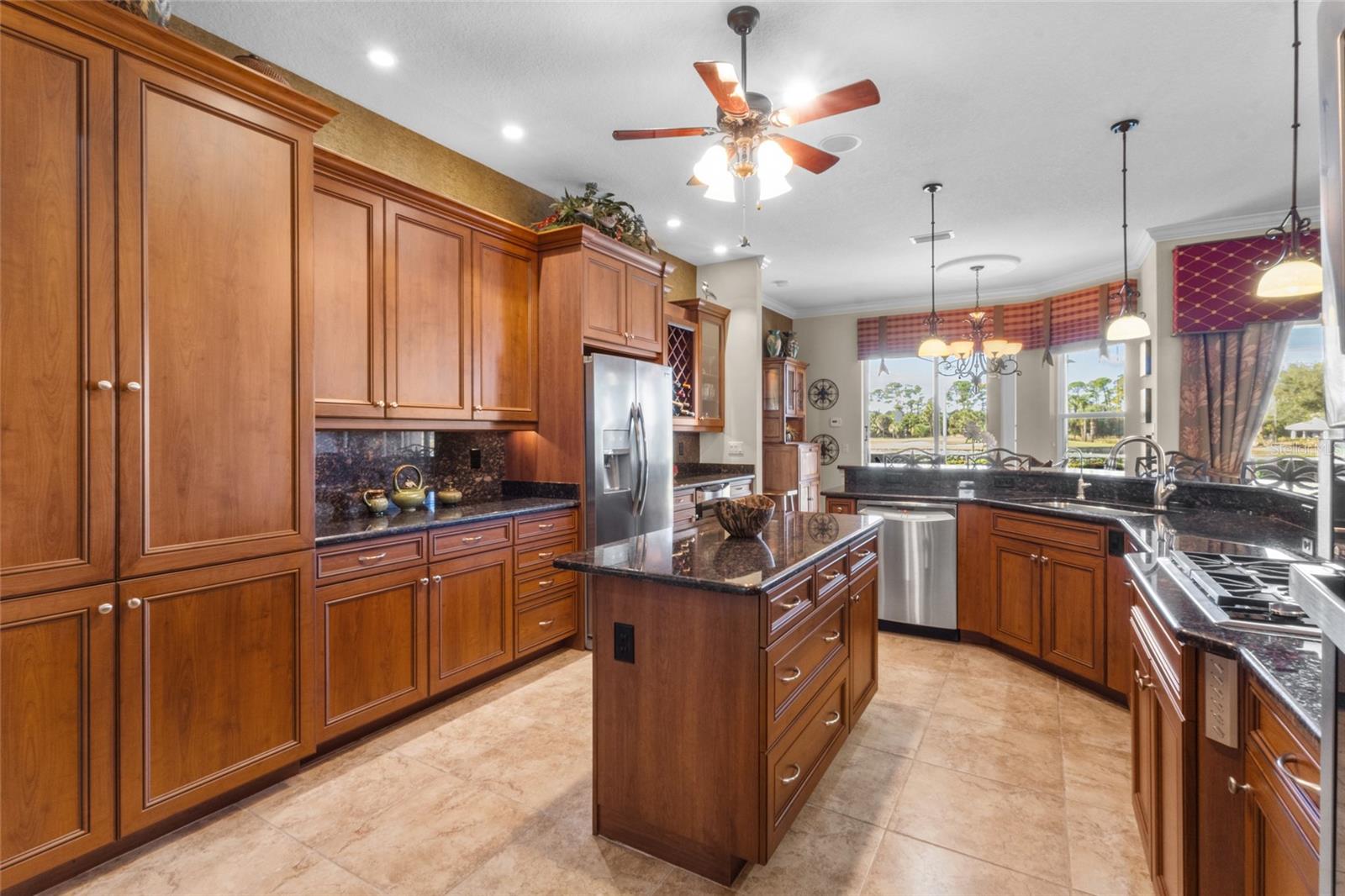 Discover a rare estate home in St. Andrews East with breathtaking double-lake views framed by the 13th hole of the Panther Course at Plantation Golf & Country Club. This beautifully appointed 3-bedroom, 3-bath residence with a den and three-car garage is offered fully furnished with high-end, custom-decorated furnishings, creating a seamless move-in opportunity.Designed for comfort and entertaining, the open floor plan features tray ceilings, crown molding, plantation shutters, and tile flooring throughout, with carpet only in the primary suite and one guest bedroom. The thoughtfully designed layout offers abundant storage and allows stunning water and golf course views to be enjoyed throughout the main living areas.The chef's kitchen features a Wolf gas cooktop with downdraft, built-in double ovens (2024), warming drawer, stainless steel appliances, and a new refrigerator (2024). Elegant cabinetry with glass inserts is paired with granite countertops and backsplash, a center island, breakfast bar, pot-and-pan drawers, roll-out shelving in select cabinets and pantry, built-in wine rack, and wine cooler. A reverse osmosis system provides filtered water at the sink and refrigerator. The eat-in kitchen overlooks the pool, lakes, and golf course.Living, dining, and kitchen spaces are beautifully defined yet flow together in an open-concept design, ideal for entertaining while maintaining uninterrupted views.Outdoor living is exceptional, featuring a saltwater pool and spa heated by a new heat pump (2024), a large covered lanai with outdoor kitchen, granite countertops, and weather-resistant composite cabinetry, built-in infrared heaters, and a timed misting system using organic mosquito repellent. The deep, private lot also includes a rare Har-Tru bocce ball court with ample space for seating and social gatherings.The primary suite offers sliding doors to the pool, two walk-in closets, dual vanities, and a Roman shower with instant hot water via a circulation system. Both guest bedrooms are generously sized with en-suite baths, one also serving as a pool bath. A dedicated den provides flexible living space.Additional features include impact hurricane glass, motorized roll-down lanai shutters, HVAC (2023), washer (2023), water heater (2025), water softener, whole-home speaker system, alarm system, and an irrigated herb garden. Propane gas services the cooktop, outdoor grill, water heater, and dryer.The estate homes in St. Andrews East include complete lawn care. Plantation Golf & Country Club offers two 18-hole championship courses, tennis, pickleball, bocce ball, fitness center, Jr. Olympic pool, dining, and social activities, with optional membership.A furnished, storm-ready estate home with this level of design, privacy, and view is truly a rare opportunity.