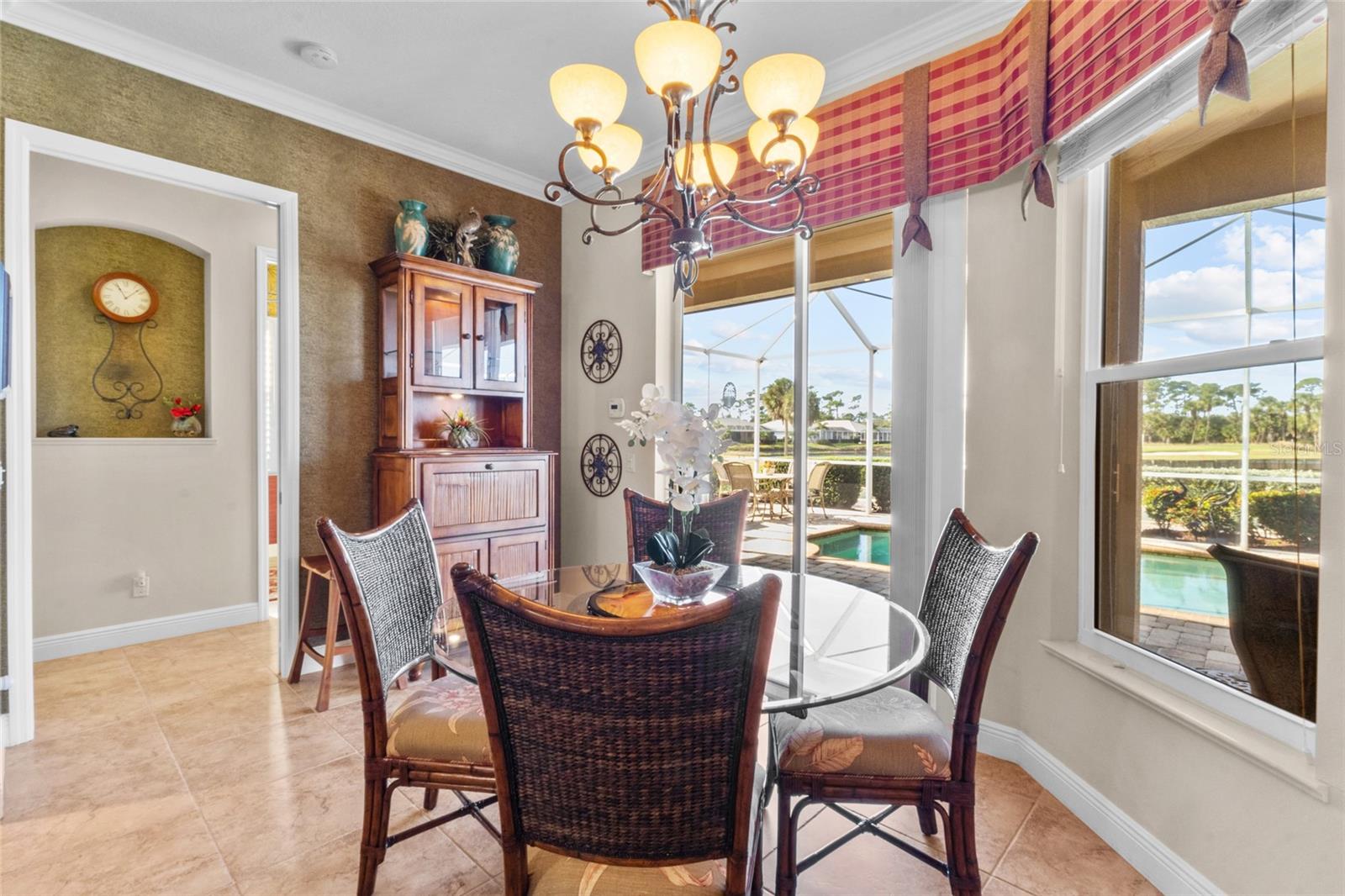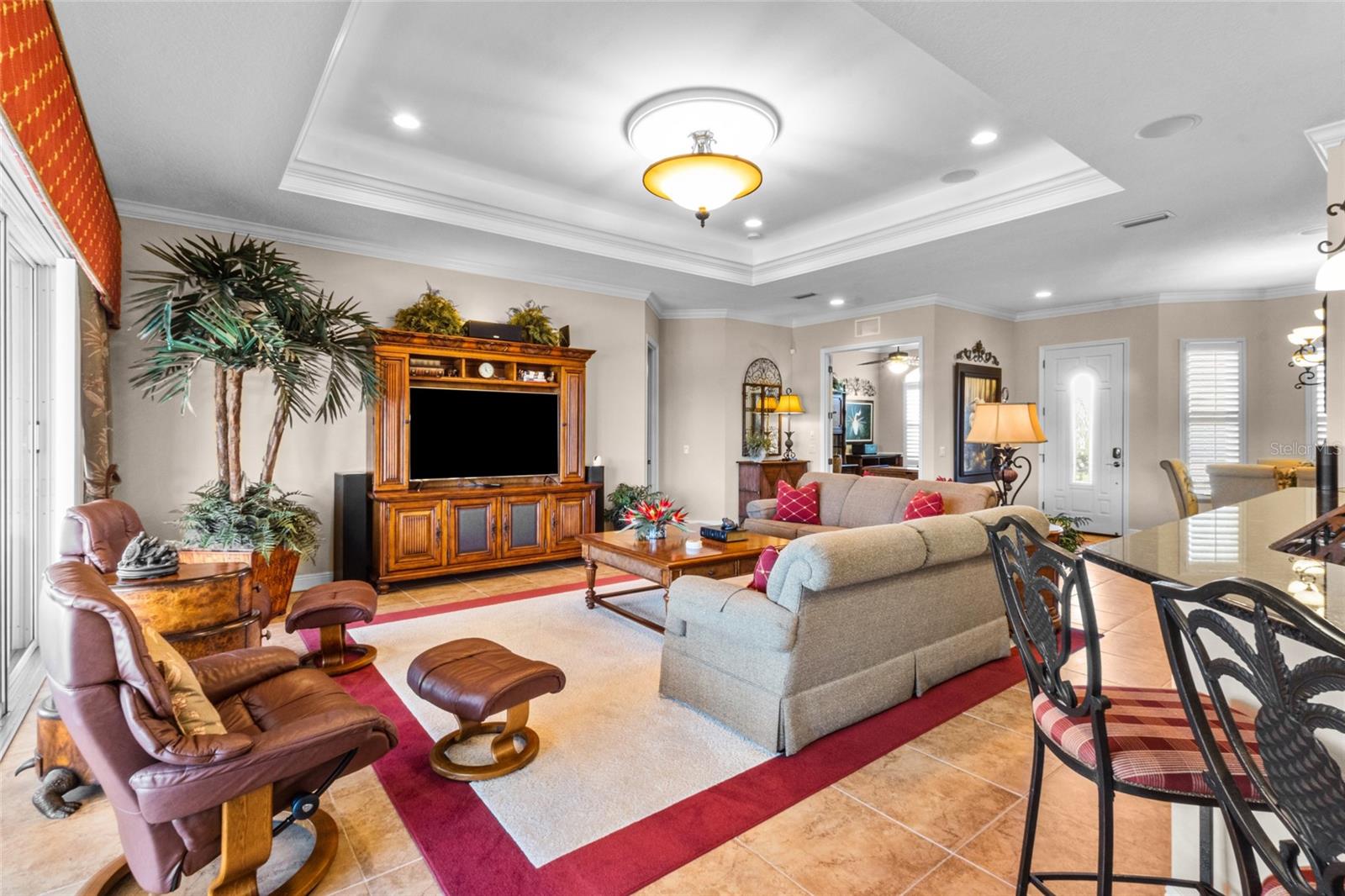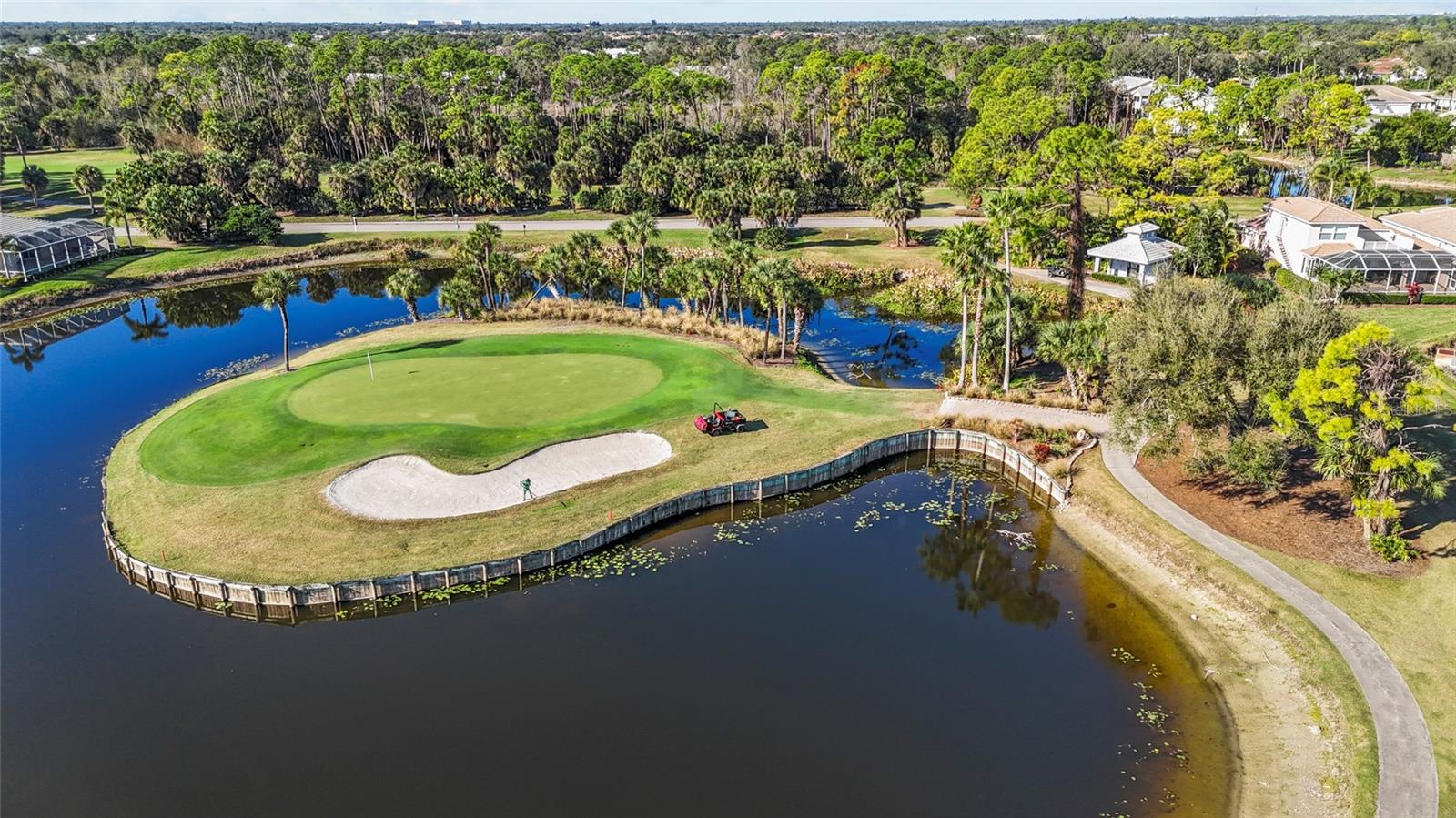 Discover a rare estate home in St. Andrews East with breathtaking double-lake views framed by the 13th hole of the Panther Course at Plantation Golf & Country Club. This beautifully appointed 3-bedroom, 3-bath residence with a den and three-car garage is offered fully furnished with high-end, custom-decorated furnishings, creating a seamless move-in opportunity.Designed for comfort and entertaining, the open floor plan features tray ceilings, crown molding, plantation shutters, and tile flooring throughout, with carpet only in the primary suite and one guest bedroom. The thoughtfully designed layout offers abundant storage and allows stunning water and golf course views to be enjoyed throughout the main living areas.The chef's kitchen features a Wolf gas cooktop with downdraft, built-in double ovens (2024), warming drawer, stainless steel appliances, and a new refrigerator (2024). Elegant cabinetry with glass inserts is paired with granite countertops and backsplash, a center island, breakfast bar, pot-and-pan drawers, roll-out shelving in select cabinets and pantry, built-in wine rack, and wine cooler. A reverse osmosis system provides filtered water at the sink and refrigerator. The eat-in kitchen overlooks the pool, lakes, and golf course.Living, dining, and kitchen spaces are beautifully defined yet flow together in an open-concept design, ideal for entertaining while maintaining uninterrupted views.Outdoor living is exceptional, featuring a saltwater pool and spa heated by a new heat pump (2024), a large covered lanai with outdoor kitchen, granite countertops, and weather-resistant composite cabinetry, built-in infrared heaters, and a timed misting system using organic mosquito repellent. The deep, private lot also includes a rare Har-Tru bocce ball court with ample space for seating and social gatherings.The primary suite offers sliding doors to the pool, two walk-in closets, dual vanities, and a Roman shower with instant hot water via a circulation system. Both guest bedrooms are generously sized with en-suite baths, one also serving as a pool bath. A dedicated den provides flexible living space.Additional features include impact hurricane glass, motorized roll-down lanai shutters, HVAC (2023), washer (2023), water heater (2025), water softener, whole-home speaker system, alarm system, and an irrigated herb garden. Propane gas services the cooktop, outdoor grill, water heater, and dryer.The estate homes in St. Andrews East include complete lawn care. Plantation Golf & Country Club offers two 18-hole championship courses, tennis, pickleball, bocce ball, fitness center, Jr. Olympic pool, dining, and social activities, with optional membership.A furnished, storm-ready estate home with this level of design, privacy, and view is truly a rare opportunity.