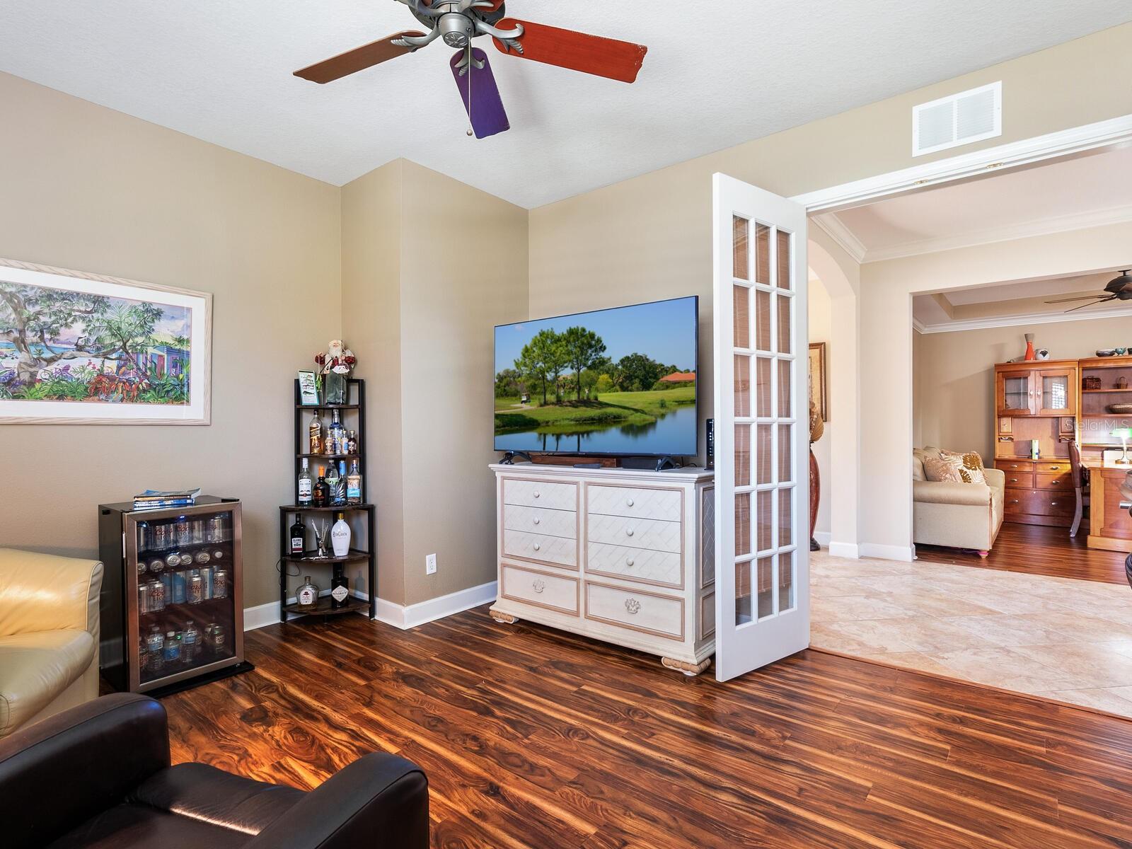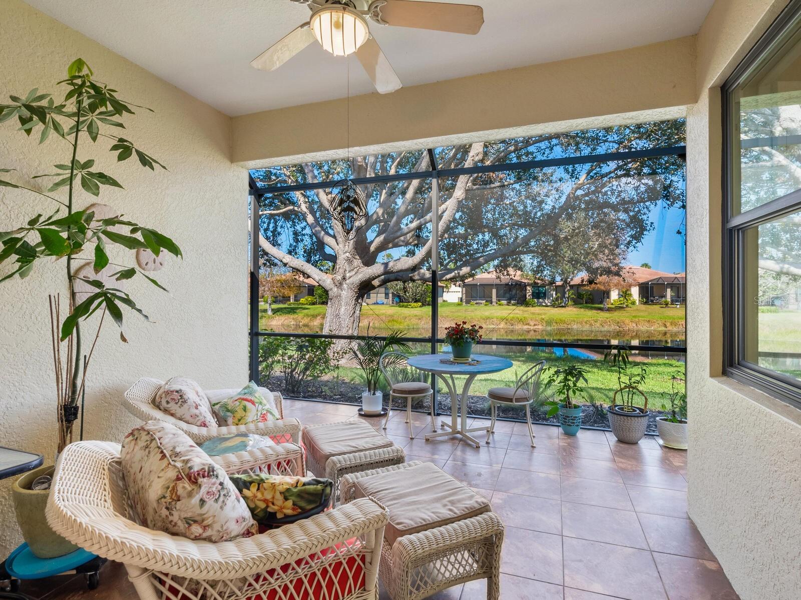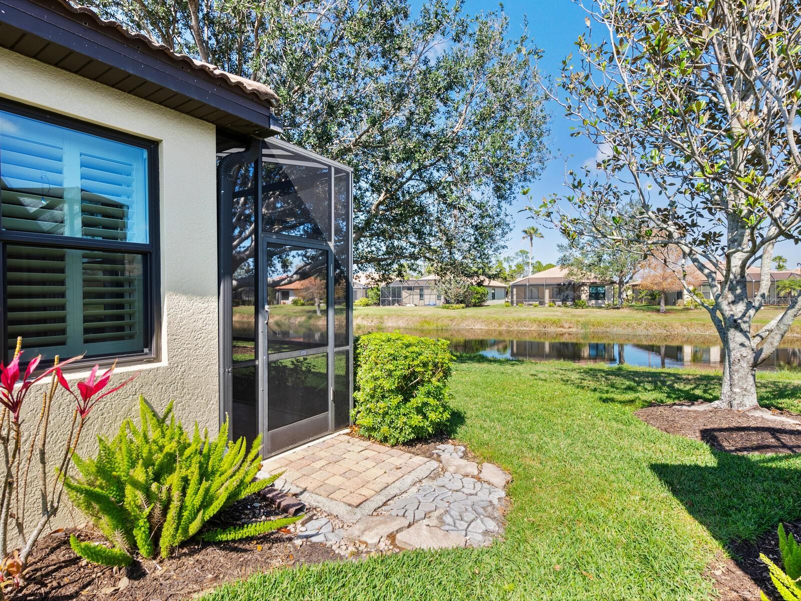 Enjoy LAKE VIEWS from this beautifully upgraded Giovanni paired-villa in the premier 55+ community of Venetian Falls! Just minutes from sunny beaches, shopping, dining, and Venice's historic district, this home offers both comfort and peace of mind with so many high-end features. Hurricane-rated, insulated ENERGY STAR IMPACT WINDOWS, 20" PORCELAIN TILE and wood laminate floors, a SCREENED AND TILED FRONT ENTRY, and an EXTENDED LANAI create a perfect blend of elegance and functionality. The beveled glass front door welcomes you with abundant natural light. High 9' ceilings with CROWN MOLDING, PLANTATION SHUTTERS, ENHANCED BASEBOARDS, SOLAR TUBES in the living room and primary bathroom, FRENCH DOORS to the den for added privacy, an elegant TRAY CEILING in the living room, and a CENTRAL VACUUM system elevate the home's appeal. The kitchen is both stylish and functional, featuring durable QUARTZ countertops, maple-finish cabinetry with trim and under-cabinet lighting, a walk-in pantry, and GE Profile stainless steel appliances, including a CONVECTION oven with an INDUCTION cooktop. A charming dinette, surrounded by windows, provides a bright and inviting space to enjoy your morning coffee with a view. The open, split floor plan provides flexibility in arranging the common areas to suit your preferences. The den can effortlessly be transformed into a third bedroom if desired. Additional highlights include an expanded paver walkway, in-wall pest control, leaf guard gutter system, and lush landscaping. For storm protection, easy-to-install HURRICANE STORM SHIELDS are included for the front entry and lanai, plus a reinforced garage door. Step outside to your private outdoor living area, perfect for grilling, dining, and relaxing while taking in serene lake views and the frequent visits from herons and other birds. Venetian Falls offers outstanding amenities, including a resort-style clubhouse with a heated lap pool and spa, a resistance-walking pool, a state-of-the-art fitness center, a billiard room, bocce courts, a full-time activity director, and on-site management. The reasonable HOA fee covers lawn maintenance, irrigation, roof pressure washing, exterior painting, and basic cable TV and internet. Don't miss this opportunity to enjoy resort-style living in this beautiful home!