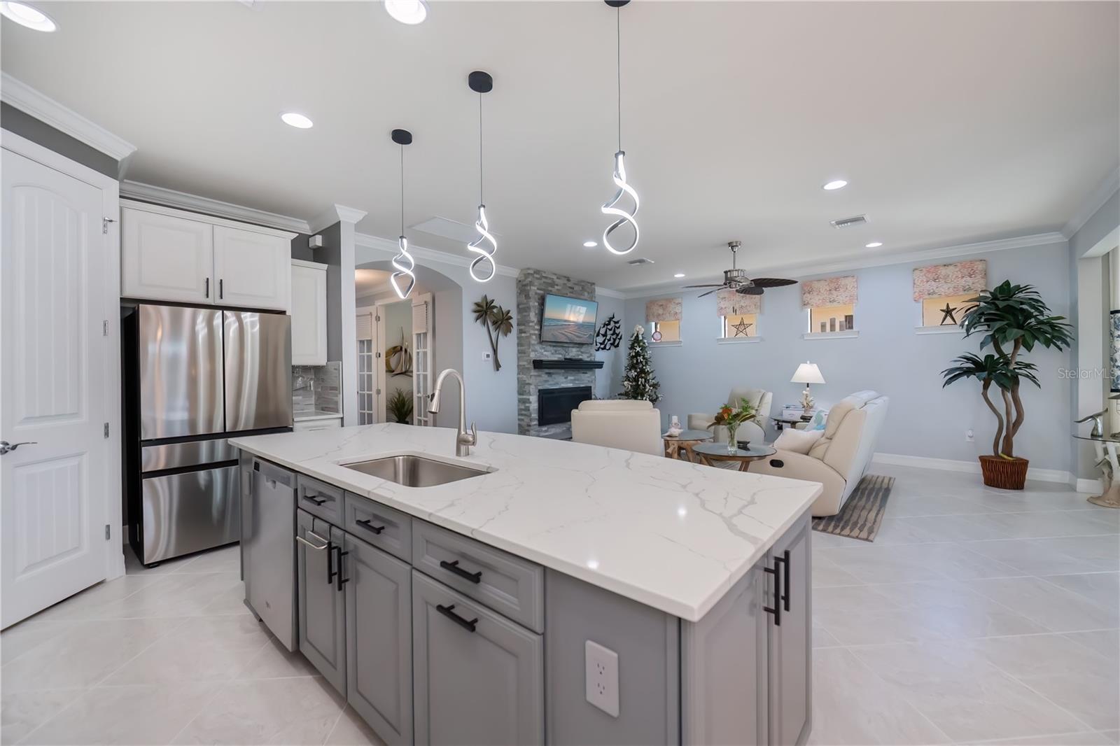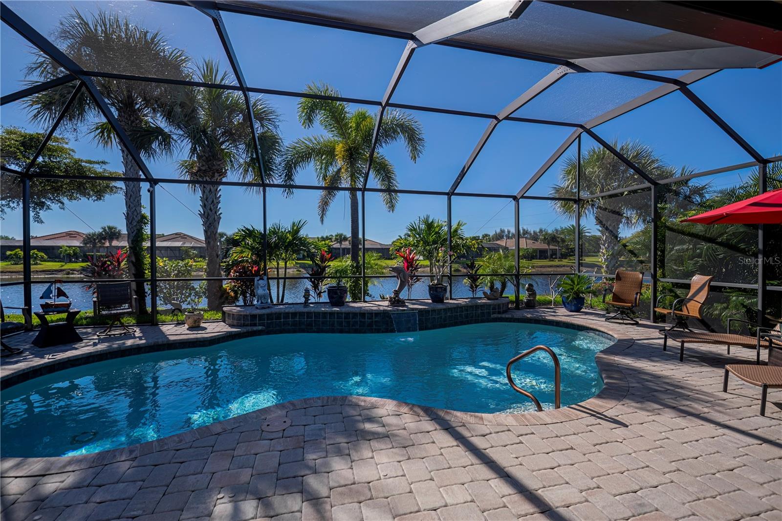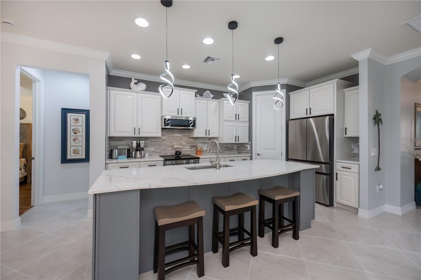 Welcome to Your Floridian Retreat--discover this beautifully maintained Summerwood modelin the highly sought-after and amenity-rich community of IslandWalk--this home is thoughtfully updated and finished with exceptional quality throughout.From the moment you arrive, the paver driveway and walkwaylead you to a striking glass front door, offering a preview of the elegance inside. Step into freshly repainted interior with crisp walls and baseboards as well as high ceilings that create a bright, inviting atmosphere. The open floor plan flows effortlessly, beginning with a spacious living room anchored by an electric fireplace--a true showpiece.The chef's kitchenis the heart of the home, featuring a large quartz-topped island and newer appliancesincluding a stove, microwave, and refrigerator. Just off the kitchen, the sunroom provides a cheerful space to enjoy morning coffee or unwind with a good book.The primary suiteoffers comfort and sophistication with engineered hardwood floors and a custom walk-in closet. The ensuite bath includes dual sinks, granite countertops, a garden tub, and a separate shower. A versatile den with Murphy bedadds flexibility--perfect for a home office, creative studio, or occasional guest room.Step outside to your private oasis: a large covered porch (measuring 9'x25') and screened lanai(measuring 32'x40') overlooking peaceful lake views, complete with a sparkling saltwater pool(with recently replaced salt cell) and a tranquil waterfall feature. Storm Smart power screensand accordion shuttersprovide added peace of mind.Additional highlights of the home include an extended 20x30 tandem garage with epoxy floors and built-in storage room, as well as a thoughtfully-designed laundry room featuring extensive custom cabinetry and a two-year-old washer and dryer. The home also comes with a current and transferrable Home Choice warranty for added peace of mind. With ceramic tile and engineered hardwood throughout--no carpet in sight!--maintaining this home is a breeze. IslandWalk offers true resort-style livingwith two geothermal pools, a lap pool, fitness center, pickleball and tennis courts, dog park, and more. This home blends luxury, functionality, and comfort--ready for you to move right in and embrace the Florida lifestyle.