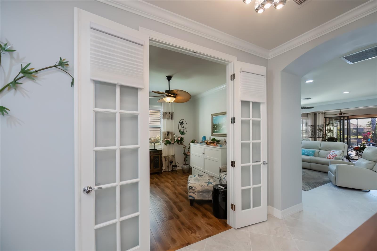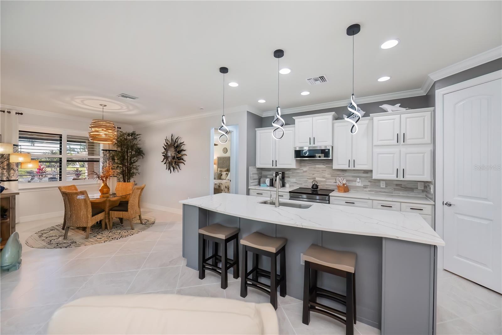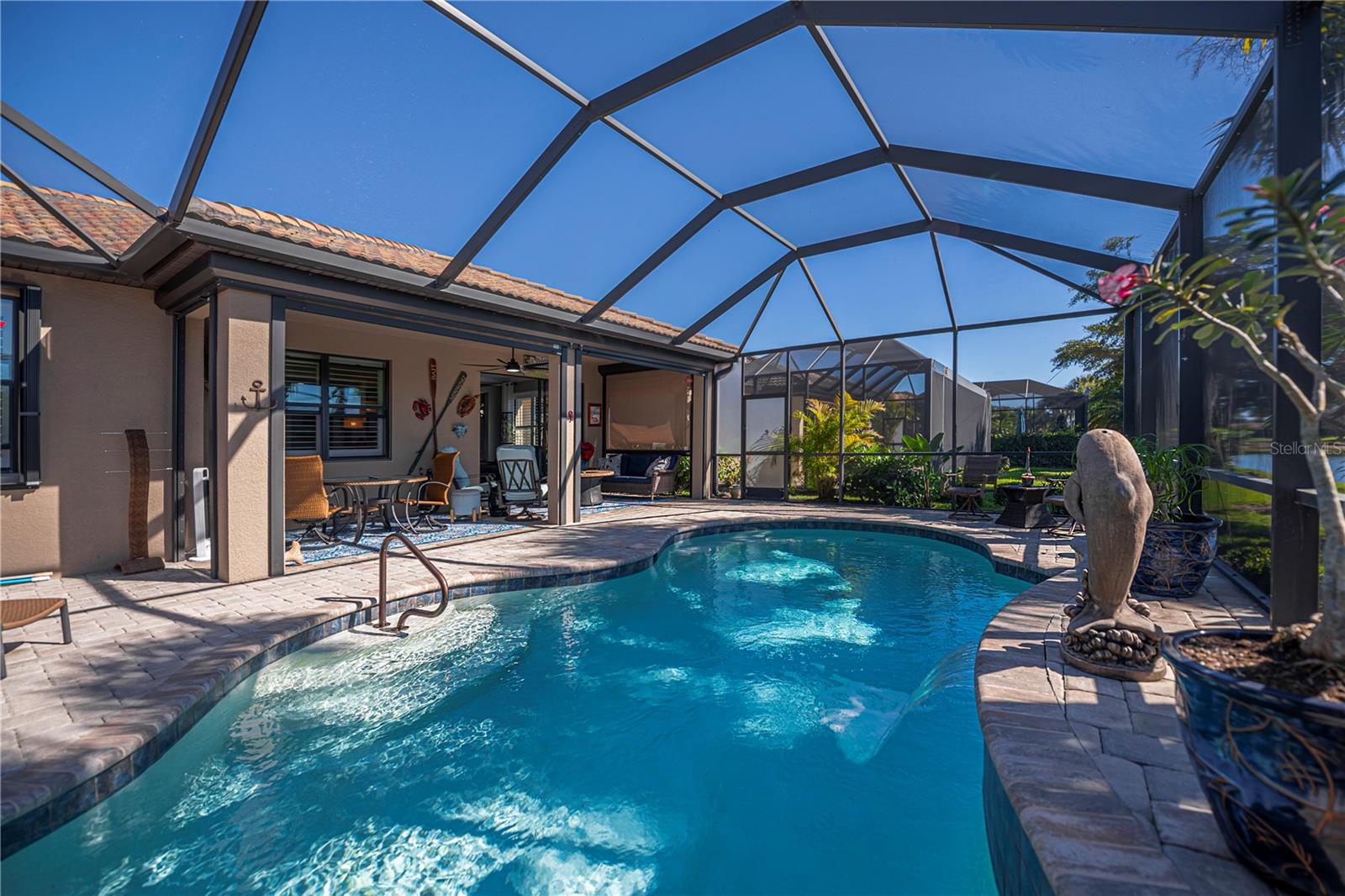 Welcome to Your Floridian Retreat--discover this beautifully maintained Summerwood modelin the highly sought-after and amenity-rich community of IslandWalk--this home is thoughtfully updated and finished with exceptional quality throughout.From the moment you arrive, the paver driveway and walkwaylead you to a striking glass front door, offering a preview of the elegance inside. Step into freshly repainted interior with crisp walls and baseboards as well as high ceilings that create a bright, inviting atmosphere. The open floor plan flows effortlessly, beginning with a spacious living room anchored by an electric fireplace--a true showpiece.The chef's kitchenis the heart of the home, featuring a large quartz-topped island and newer appliancesincluding a stove, microwave, and refrigerator. Just off the kitchen, the sunroom provides a cheerful space to enjoy morning coffee or unwind with a good book.The primary suiteoffers comfort and sophistication with engineered hardwood floors and a custom walk-in closet. The ensuite bath includes dual sinks, granite countertops, a garden tub, and a separate shower. A versatile den with Murphy bedadds flexibility--perfect for a home office, creative studio, or occasional guest room.Step outside to your private oasis: a large covered porch (measuring 9'x25') and screened lanai(measuring 32'x40') overlooking peaceful lake views, complete with a sparkling saltwater pool(with recently replaced salt cell) and a tranquil waterfall feature. Storm Smart power screensand accordion shuttersprovide added peace of mind.Additional highlights of the home include an extended 20x30 tandem garage with epoxy floors and built-in storage room, as well as a thoughtfully-designed laundry room featuring extensive custom cabinetry and a two-year-old washer and dryer. The home also comes with a current and transferrable Home Choice warranty for added peace of mind. With ceramic tile and engineered hardwood throughout--no carpet in sight!--maintaining this home is a breeze. IslandWalk offers true resort-style livingwith two geothermal pools, a lap pool, fitness center, pickleball and tennis courts, dog park, and more. This home blends luxury, functionality, and comfort--ready for you to move right in and embrace the Florida lifestyle.