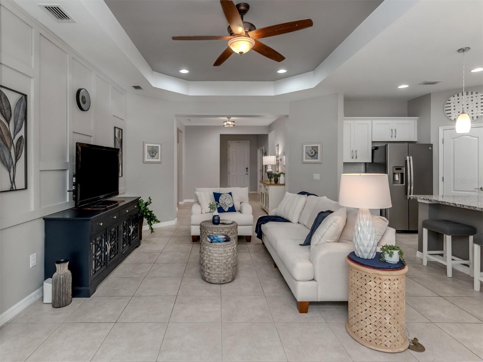 This beautifully designed three-bedroom, 2.5-bath home with a den is positioned on a corner lot offering exceptional privacy and tranquil preserve views with uplighting. An extended travertine lanai with a six-person spa creates a peaceful, romantic retreat surrounded by nature. The curb appeal is enhanced with uplighting and the welcoming entry gallery provides an ideal space to showcase art collections or create a flexible open area to suit your lifestyle. Inside, the great room plan features high ceilings with a tray ceiling and architectural accent wall, flowing seamlessly into the kitchen and dining area. The kitchen offers a counter-height bar and opens to a spacious walk-in pantry with extensive shelving, shared with the laundry room for added convenience. The primary suite is thoughtfully located at the rear of the home for ultimate privacy, featuring two walk-in closets and an en-suite bath with a walk-in shower and dual tall vanities. Two additional bedrooms are positioned toward front of the home and share a full bath conveniently between them, offering comfort and functionality for family or guests. A spacious den/office with French doors provides a quiet, light-filled space, ideal for working from home, a reading room or a flex space to suit your needs. Pocket sliders from the great room lead to the extended lanai, where the private spa setting invites relaxation and unwinding at the end of the day. Hurricane protection for all windows and doors adds peace of mind. Experience the Gulf Coast lifestyle at award-winning, resort-style community of Grand Palm. Residents enjoy 28 miles of recreational trails, the Palm House fitness center, a resort-style pool with waterslide, lap pool and spa, splash park, Adventure Playground, social club with pickleball courts, gathering spaces and cafe kitchen, plus Adventure Lake for kayaking and fishing. Additional amenities include basketball, tennis, bocce ball, volleyball courts and two dog parks. Don't miss this opportunity to own your private piece of paradise. Schedule your showing today.
