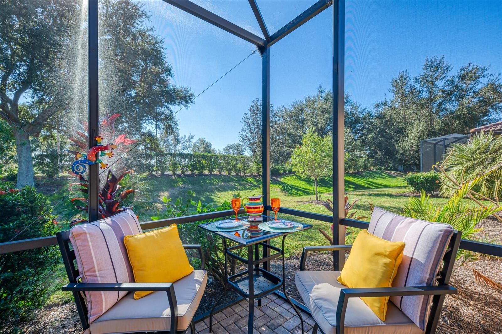 Welcome to this meticulously cared-for, freshly painted gem in a desirable 55+ gated community! This two-bedroom, two-bath home boasts an additional office/den, perfect for work or hobbies. Step inside to an open floor plan where you will delight in the coastal theme, crown molding, plantation shutters, and custom lighting throughout. The split layout offers guests their own private space, while the delightful bay window in the breakfast area floods the room with natural light. Enjoy no carpeting, stainless steel appliances, granite countertops, a large pantry closet and warm wood cabinets in the kitchen. Practical updates include a recent A/C, water heater and refrigerator. The paver driveway and walkway lead you to a screened front entry. Out back you will find plenty of space to relax on the extended screened lanai. The home is protected by accordion hurricane shutters. Community perks shine with low HOA fees, no CDD, and a fabulous clubhouse featuring a calendar of events for those who wish to stay involved. Amenities abound: resort pool, resistance pool, hot tub, bocce courts, fitness center, banquet room, arts and crafts room, library, pool room, putting green, and internet cafe. This is Florida living at its finest--schedule your showing today!