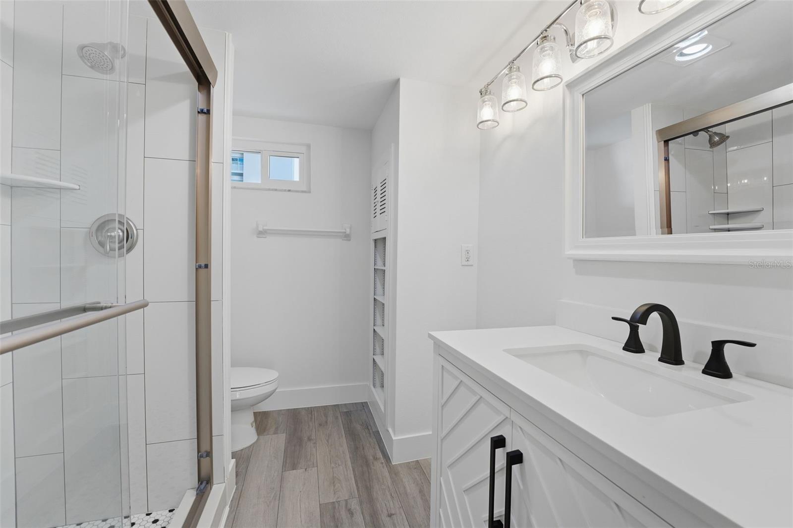 Exterior: Lighting, Private Entrance, Sidewalk, Sliding Doors, Storage
