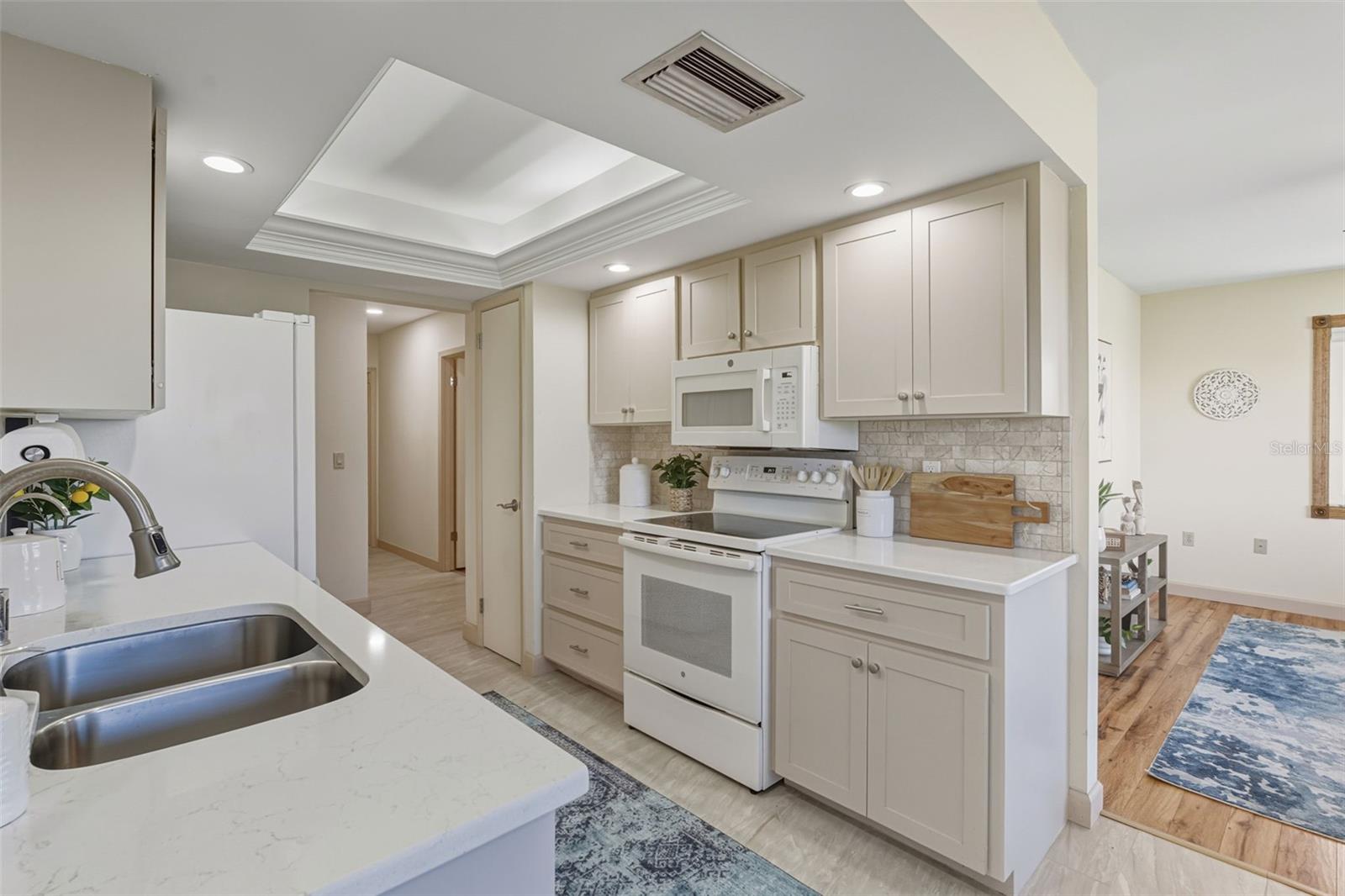 This ADORABLE and meticulously maintained residence is located on a quiet cul-de-sac and it has GORGEOUS water views! This home features 2-spacious bedrooms PLUS den/office, 2-baths, and a 2 car garage. As you enter the home, you are greeted by the formal living room straight ahead and office/den to the left. The sunroom makes a perfect dining room, hobby room or 2nd office. Past the sunroom is the renovated kitchen with newer appliances, quartz countertops, updated backsplash, and closet pantry. Adjacent to the kitchen is the dinette & family room. (Other homeowners that have this floorpan have closed off the back family room to form a bedroom. If desired- photos of what this looks like can be provided.) The primary suite has plenty of room for a king sized bed and it has a generous walk-in closet. The ensuite bath has been tastefully renovated to include a beautiful walk-in shower & quartz counter tops on the vanity. On the opposite side of the home--near the foyer--is entrance to the spacious guest bedroom with a walk-in closet and room for a king-sized bed. The guest bathroom has been very well-maintained and everything is in working order. There is NO CARPET in this home! You'll find neutral tile in the kitchen, dinette, sunroom, and bathrooms. Luxury laminate in the main areas of the home & bedrooms. This home is concrete block construction and it has never flooded. It is located is in an X flood zone- so mortgage lenders will not require flood insurance. The sunroom has hurricane impact windows and the rest of the windows have been replaced & have hurricane shutters. The AC was replaced in 2017 and is in excellent working order. The roof was replaced in 2007 and is in great shape. Venice Gardens is on Sarasota County water & sewer! The entire home has a water filtration system and the kitchen has a reverse osmosis. Venice Gardens is a quiet, sought-after neighborhood with a central location in Venice! There are no HOA fees, no CDD fee, and no deed restrictions! Just minutes to Venice Island--which is known for its sandy beaches with warm Gulf water, shopping, dining, splash pad, parks & playgrounds, dog park, dog beach, Sharky's fishing pier, tennis courts, weekly farmer's market, tons of events, and so much more!Just a golf cart or bike ride away--on Shamrock Drive--is the Venice Gardens Community Center with pool that you can use for a nominal fee. There is also a playground over at the community center that you can go to for no charge. The beautifully renovated YMCA is just around the corner with a heated pool, spa, fitness center with classes, steam rooms and saunas, racquetball, and more. Schedule your showing today and experience the charm and convenience of Venice Gardens! (See floorpan in photos) (The square footage listed DOES NOT include the 18 x 11 sq ft Florida room/sunroom.)