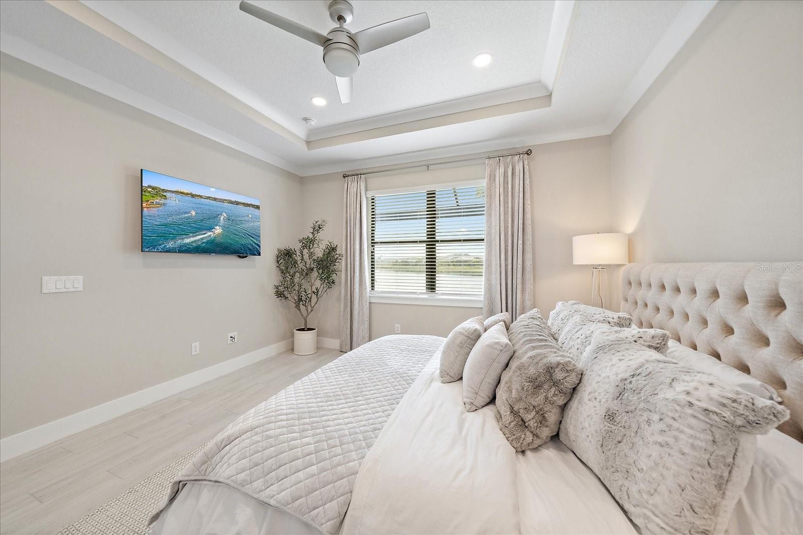 **DESIGNER FURNITURE (partial or all) and GOLF CART AVAILABLE FOR PURCHASE SEPARATELY OR INCLUDE INTO PROPOSAL.** Customized Toll Brothers Rosehall paired villa is loaded with top-of-the-line builder options PLUS additional custom upgrades after purchase including trim work, designer finishes and a huge expanded lanai with lake and fountain views. This beautifully maintained home features 2 bedrooms, 2 bathrooms, and a versatile flex room with a hidden bonus closet--currently styled as an office/TV room/guest space and easily used as a third bedroom. This home features tile flooring throughout, and the 2-car garage features an epoxy-coated garage floor. Notice the upgrades to this home and attention to detail: from the designer lighting & ceiling fans, custom doors, and elegant custom molding and trim work throughout, including eye-catching accent walls in the hallway and flex room. The executive gas kitchen, complete with built-in KitchenAid appliances, quartz counter tops, large island & custom pantry door. The guest bathroom is equally impressive, showcasing a UPGRADED gorgeous walk-in shower with upgraded tile and a luxury rain shower head in addition to the handheld. Open the back glass sliders to your huge expanded lanai that wraps around the back of the villa, featuring a picture-frame screen that creates unobstructed, postcard-worthy views of the serene lake and fountain--a true showstopper and the ideal place to relax morning or night. Schedule your private showing today.