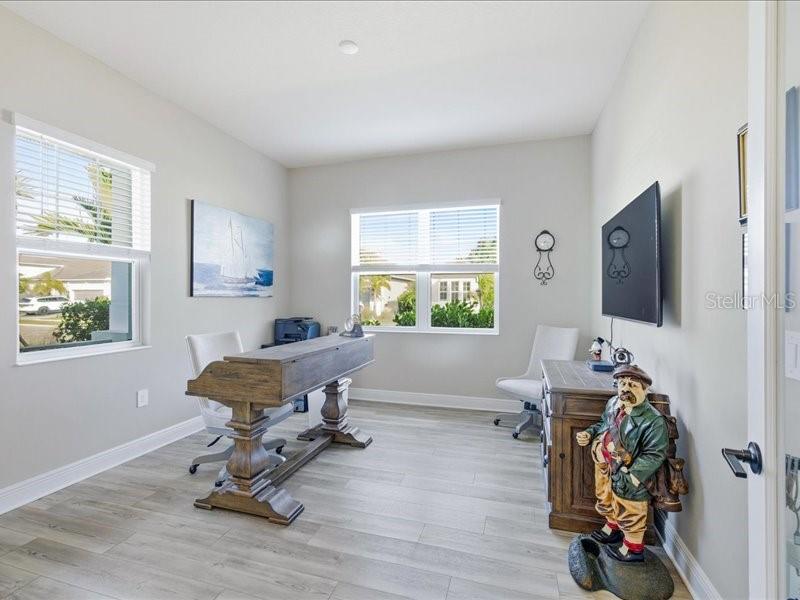 Welcome home to easy, comfortable living in **Avelina at Wellen Park**, a small, gated neighborhood of just 96 homes built by Neal Communities, known for its sidewalks, mature landscaping, and relaxed, friendly feel. This 3 bedroom, 2 bath home with a flex room sits on a corner lot with a south-facing backyard, offering great natural light and room to add a pool if you wish.From the welcoming front porch, step into a front foyer to see the tall ceilings, tall doors, and neutral tones that make this home feel open, spacious and inviting. The split floor plan offers privacy, with the primary suite tucked away on one side of the home and two guest bedrooms on the other.The heart of the home is the open kitchen, great room, and dining area, designed for everyday comfort and easy entertaining. The kitchen is a standout with designer quartz countertops, a farm-style sink, decorative vented hood, and Caf brand matte white appliances with fashionable bronze and copper accents. You'll appreciate the natural gas 5-burner stove, wall microwave above the wall oven with WiFi, huge island with casual seating for 5-6, walk-in pantry, under-cabinet lighting, and abundant drawer and cabinet storage.The kitchen flows seamlessly into the spacious great room and dining room, both filled with natural light. Quadruple sliding glass doors in the great room stack out of the way, and triple sliders in the dining room, open to the paver lanai for the indoor/outdoor lifestyle Florida living is all about. Quality Hunter Douglas pull-across accordion sun shades add comfort and style. The lanai is already equipped with outdoor kitchen hookups - ready for you to create the setup that fits your lifestyle.The primary suite is a peaceful retreat with a coffered ceiling, great light, and two large walk-in closets. The en-suite bath features a large walk-in shower with a high window for light yet privacy, dual vanity, separate water closet. Two guest bedrooms are comfortably sized and share a guest bath with a tub/shower combo and linen closet. The laundry room, located near the guest rooms, includes the washer and dryer with upper cabinets, a sink, and shelving for extra storage.Additional highlights include quality LVT (Luxury Vinyl Tile) plank flooring in common areas and primary bedroom for ease of care, tile in bathrooms and carpet in bedrooms two and three, 5.25-inch baseboards, matte black hardware throughout, and a 2-car plus golf cart garage with epoxy floors and a natural gas water heater. The driveway, walkway, and lanai are finished with pavers. All glass is impact for ease and peace of mind. Avelina is a quiet, intimate Wellen Park neighborhood, where the HOA maintains and irrigates the landscaping, making everyday living easy. Enjoy the ability to walk to the Publix plaza, attend events at CoolToday Park (Atlanta Braves Spring Training), or take a short bike or golf cart ride to downtown Wellen Park for dining, shopping, and the regularly scheduled entertainment.A thoughtfully designed home in a rare, small Neal Communities neighborhood--this one may truly check all the boxes for you.