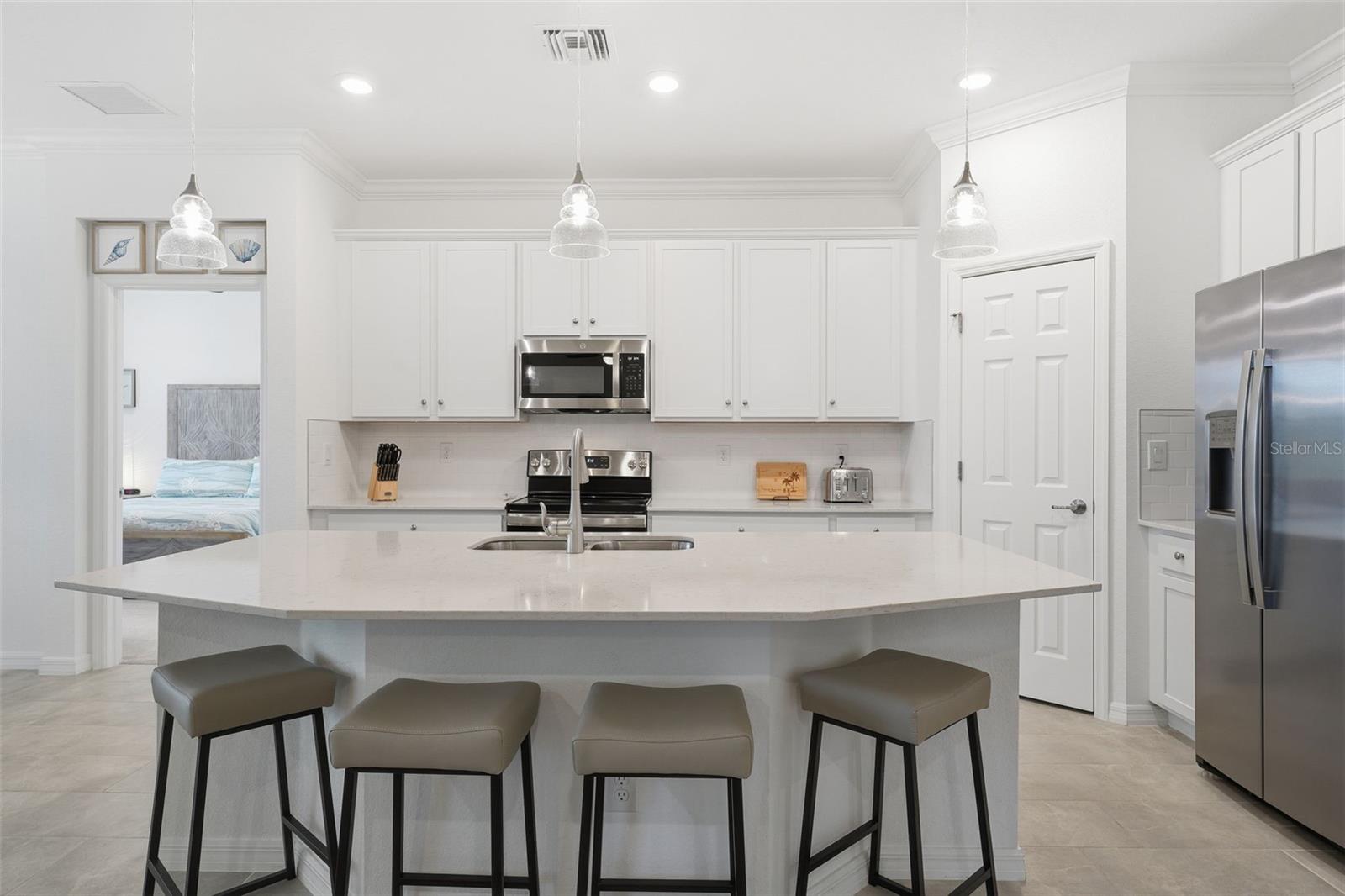Now is your opportunity to own this TURN-KEY FURNISHED TOP-FLOOR condo with beautiful pond views, located in the highly sought after guard gated community of Sarasota National. Enjoy tranquil views off the back as you sit and relax on the oversized screened lanai which is upgraded with privacy sunshades and a wall mounted TV. Off the front, you can also see lake views that will glisten in dramatic hues as the sun sets across the water. This condo is flooded with natural light and boasts an open concept floor plan featuring 3 proper bedrooms with tons of closet space and 2 bathrooms. The unit is outfitted in beautiful high-end furnishings that are sure to impress. Completely maintenance free, this home is outfitted with HURRICANE IMPACT GLASS and includes a 1 car attached garage and a paver driveway that gives you additional parking. The open concept floor plan is perfect for entertaining, and a wall of sliders in the living room allows you to enjoy picturesque views of the pond as you move through the space. The kitchen is stunningly appointed with shaker style cabinets that provide tons of storage, a massive island with sparkling quartz countertops, subway tile backsplash, and a stainless-steel appliance package by GE. Other upgrades include tile on the diagonal throughout the main living areas, extra recessed lighting, decorative crown moldings, ceiling fans, and light fixtures. The large primary suite captures stunning views, and the en suite spa-inspired bathroom features a large dual sink vanity with tons of extra storage, walk-in glass shower, a separate water closet for privacy, and a HUGE walk-in closet. Located on the opposite side of the home creating privacy for all, you will find the second bedroom at the top of the stairs and the third bedroom in a private alcove. The second bathroom is spacious and offers loads of storage, and there is an extra linen closet as well. There is an ample-sized, in-unit laundry room. ALL exterior maintenance is included, such as roof replacement, re-painting of the exterior; all ground maintenance including re-mulching and irrigation, cable TV, pest control, water, sewer, trash, and building insurance! This condo is perfect as a full-time residence, a part-time seasonal home, or even a great investment that will generate substantial rental income whether rented annually or as a short-term seasonal rental. Located in one of the quietest parts of the community, with quick access to the back owner's gate, allowing you to enter and exit the community with ease. Live like you are on a 5-star vacation with a 30,000sf clubhouse with resort style pool, hot tub, outdoor tiki bar serving food and drinks daily, a coffee house, fine dining restaurant, 7,000sf fitness center with top-of-the-line equipment and classes, day spa, card room, bocce ball, pickle ball, tennis, dog park, playground, and event lawn! Sarasota National is a guard gated 2400-acre International Audubon Bird Sanctuary that offers some of the most beautiful water and preserve views in all of Venice. This home is just minutes from the new and exciting town center of Wellen Park, the Atlanta Brave's spring training camp at the CoolToday Park Stadium, and tons of area amenities. Explore 3 local beaches and historic downtown Venice, all less than 15 minutes away! If you have dreamed of owning a piece of Florida's paradise, look no further than Sarasota National... one of Venice's premiere communities!